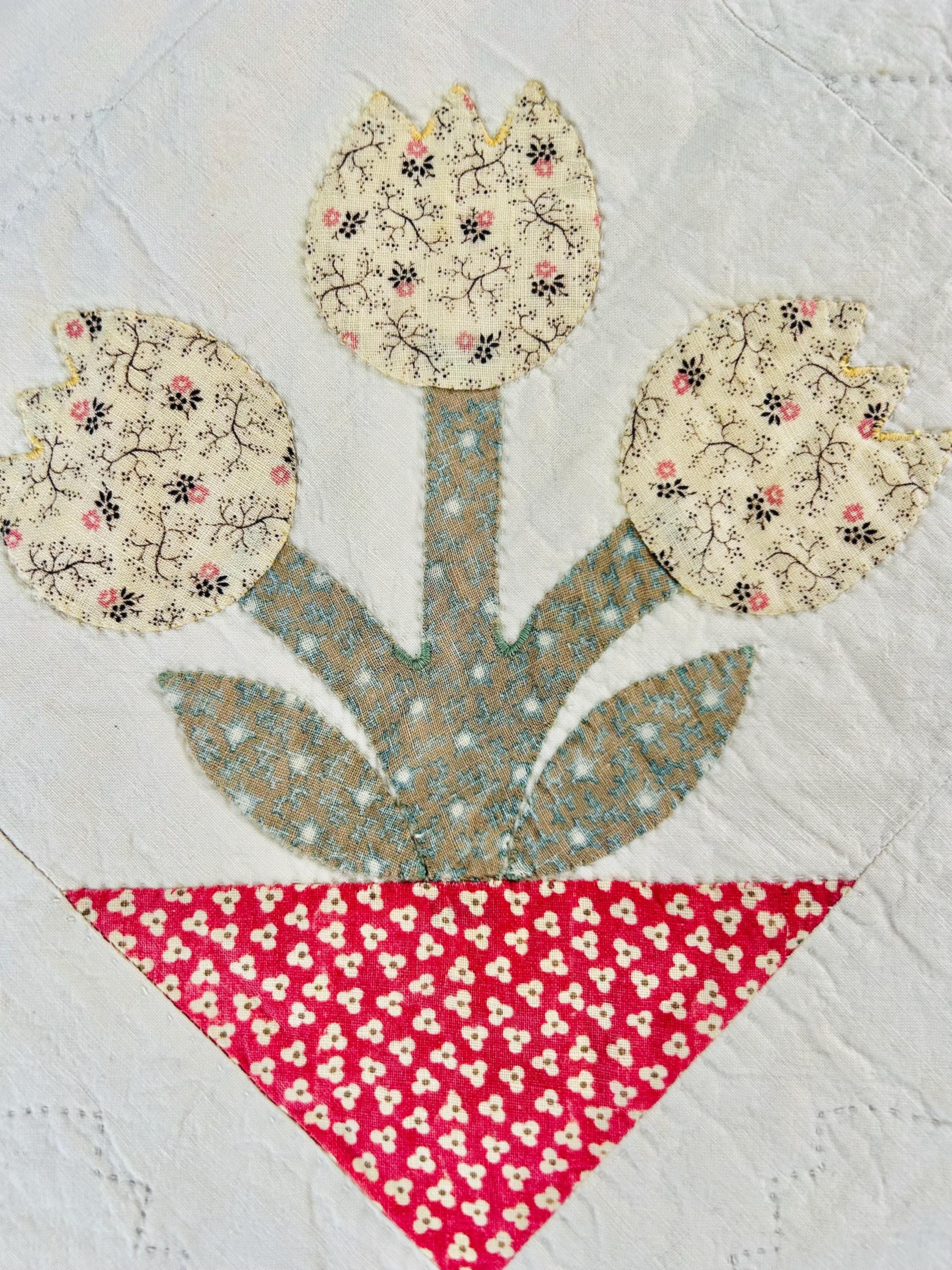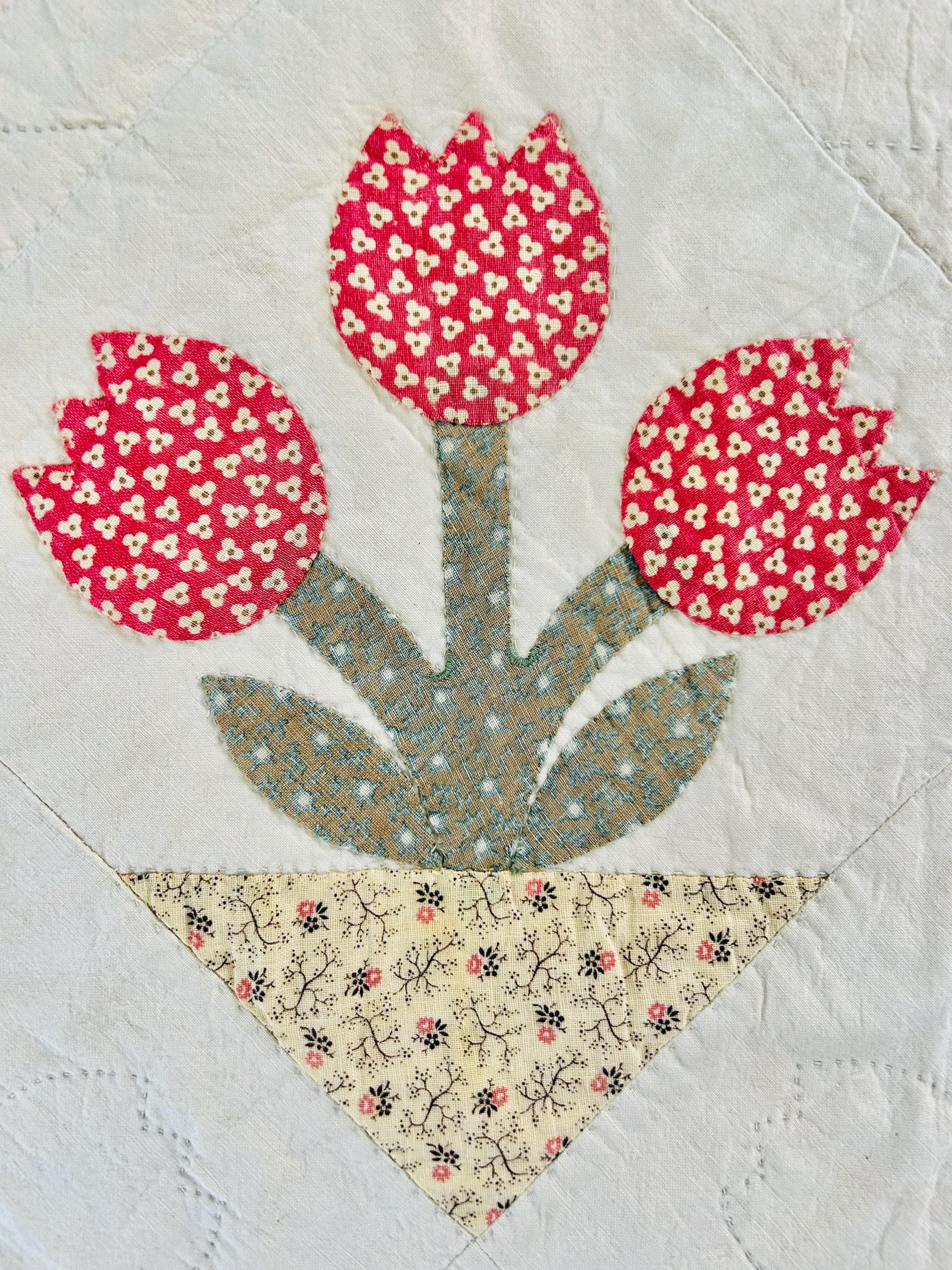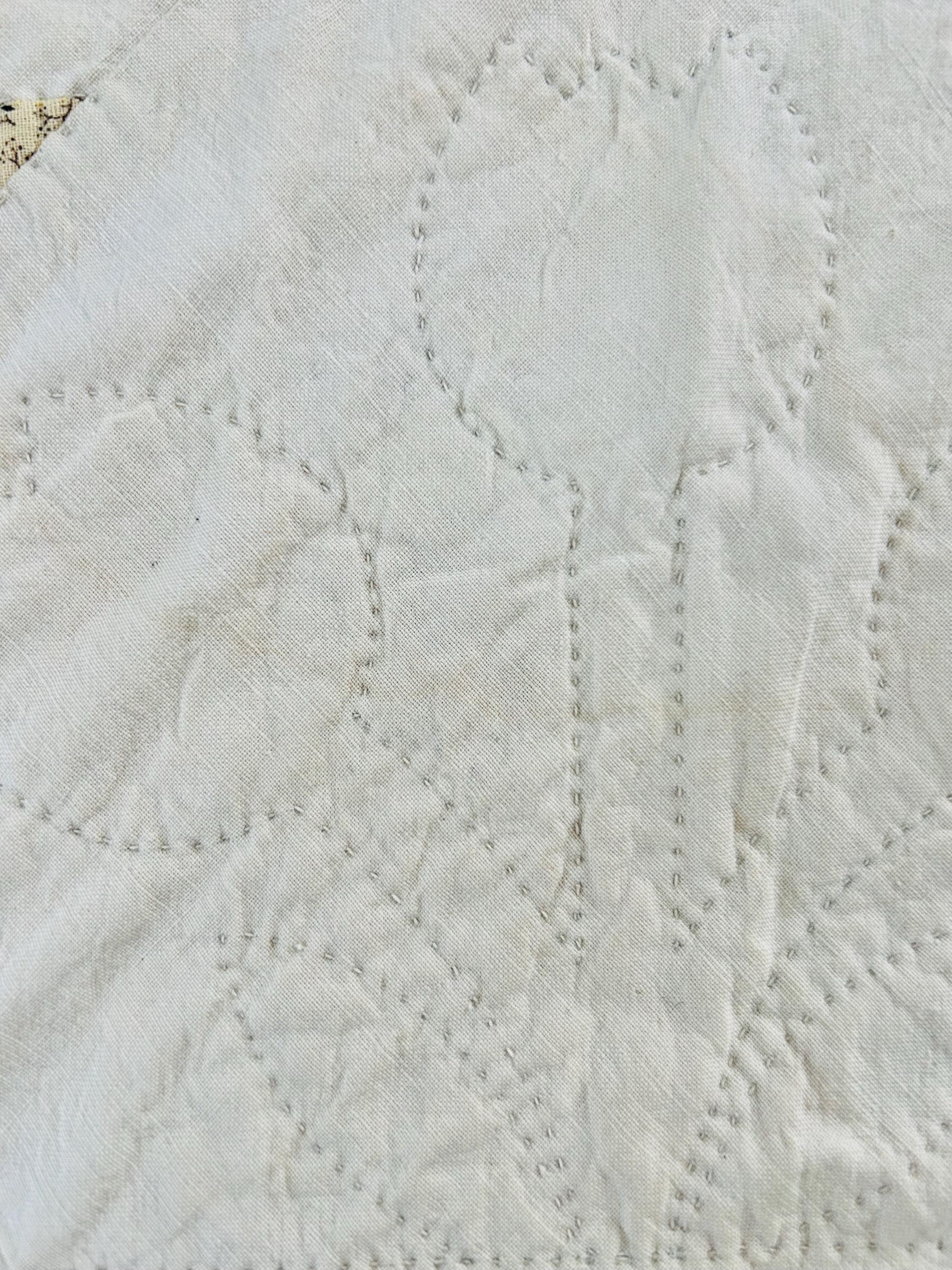 The hand-quilting is especially lovely—delicate, all-over hand quilting with floral and scrolling motifs that add texture without overpowering the appliqué design.