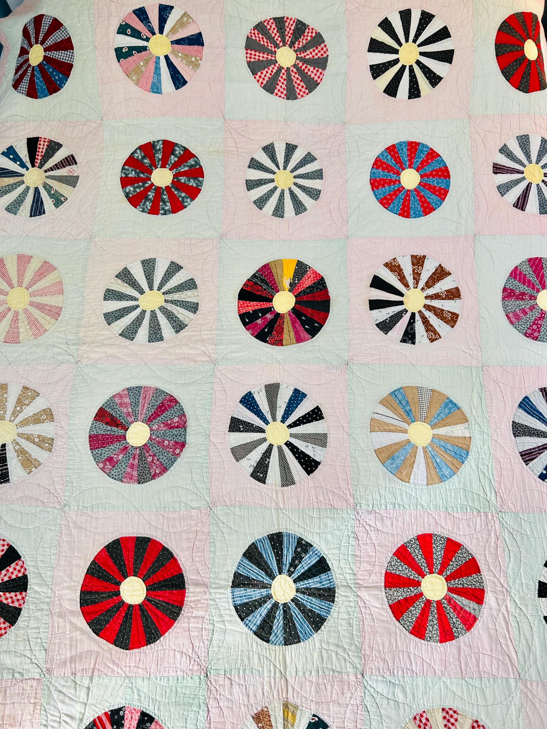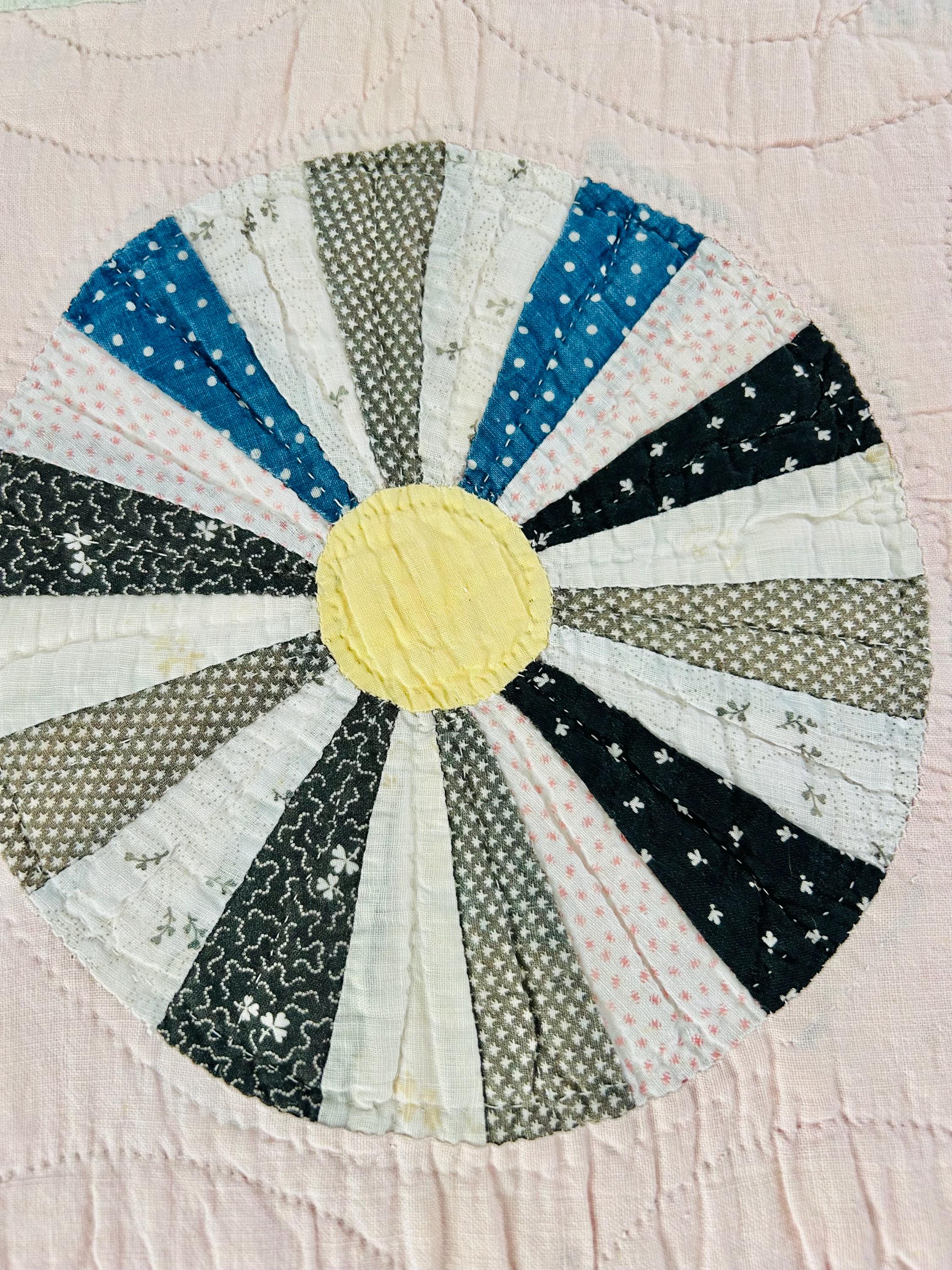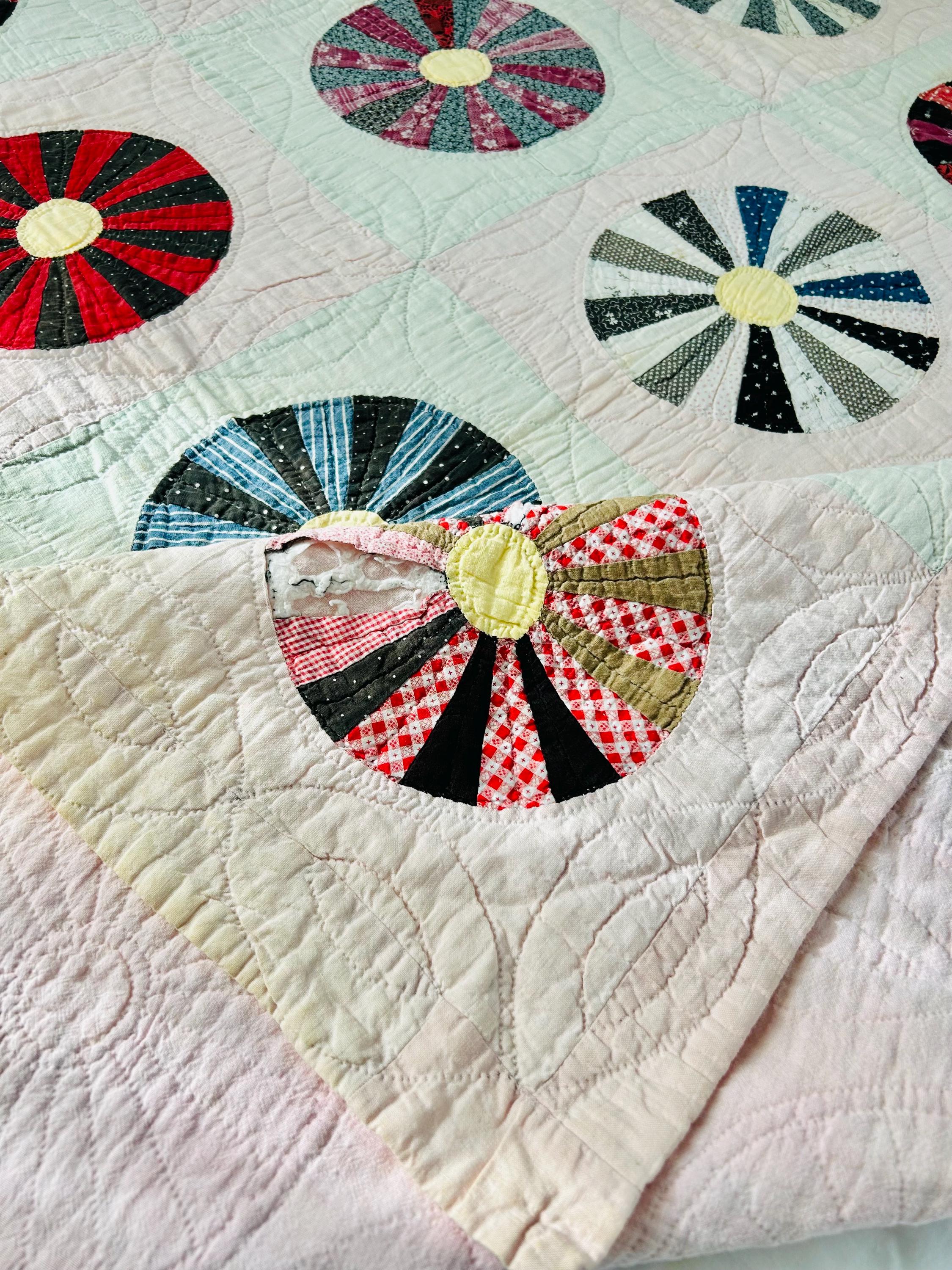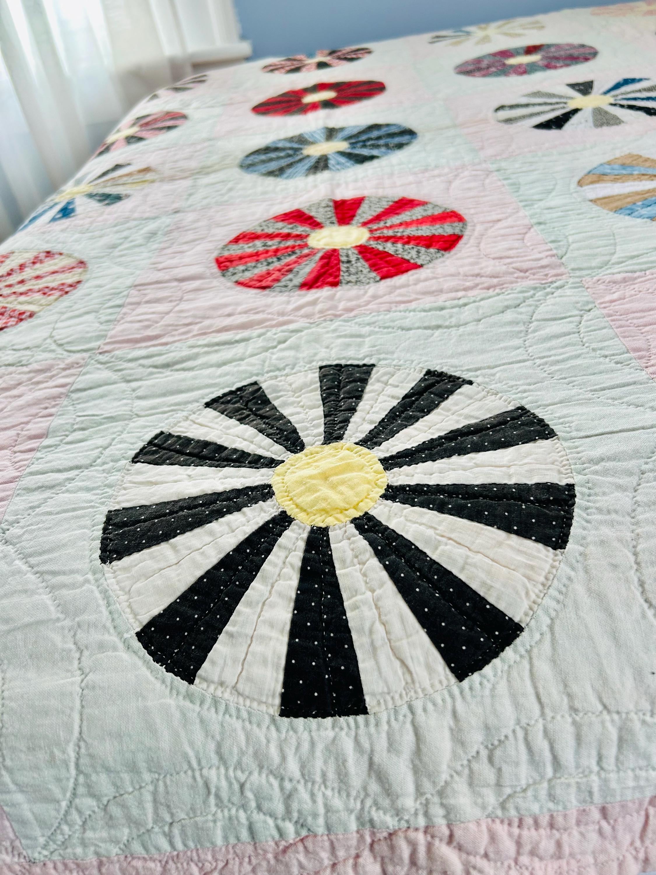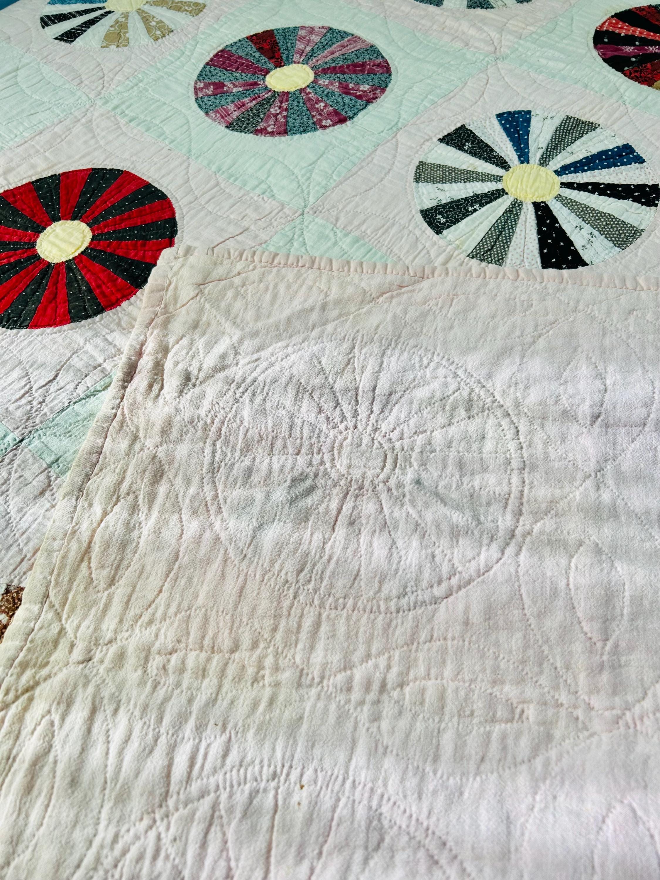 This beautiful Aster Quilt dates to the 1920s–1930s and features hand-pieced and hand-quilted construction. Each circular “Aster” is made from carefully arranged wedges of period cottons—tiny florals, stripes, geometrics, and classic Depression-era color combinations. The soft pastel block settings are pink and mint green making each Aster stand out.