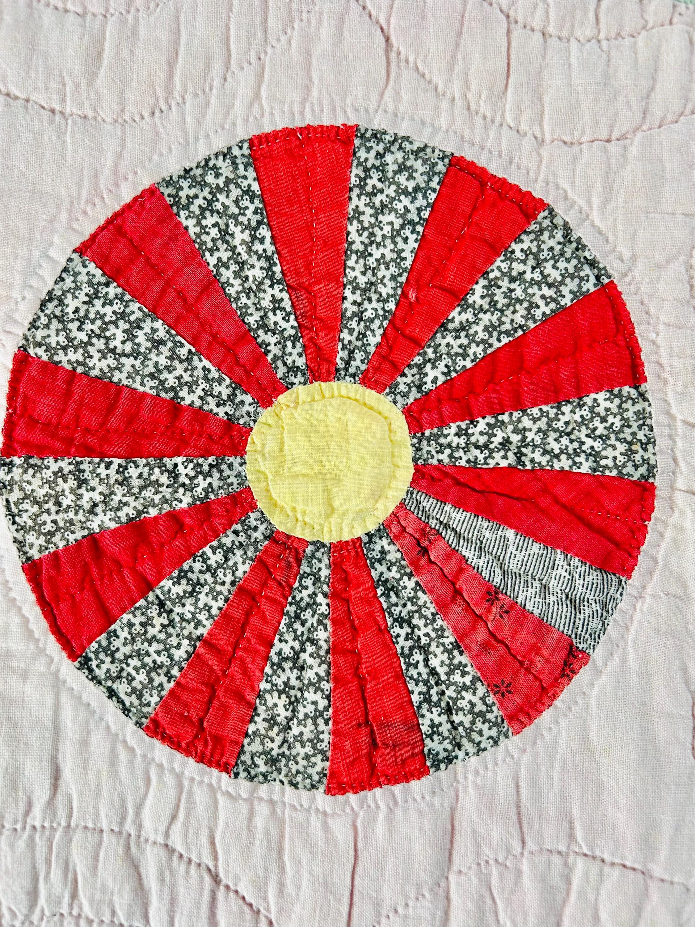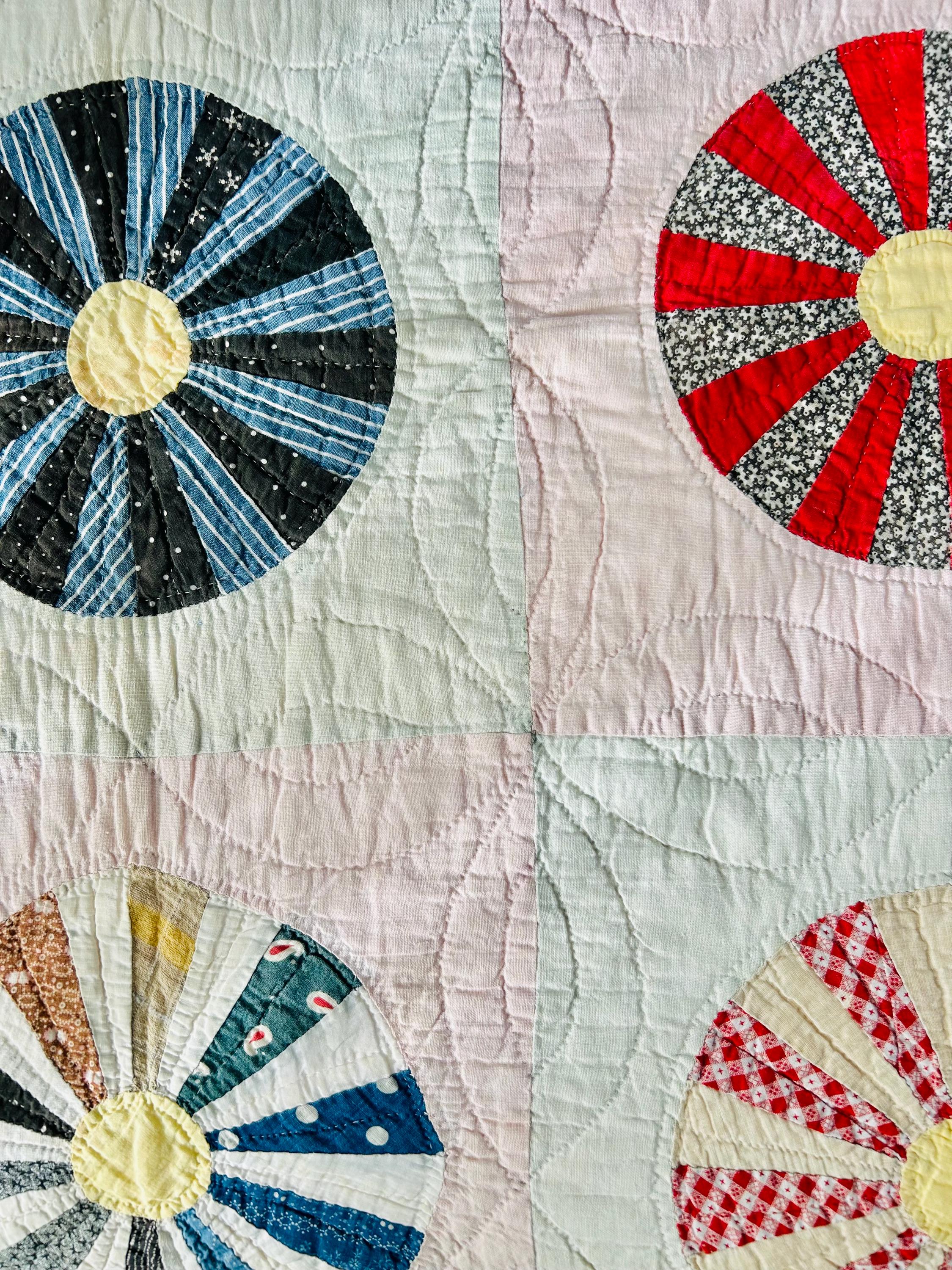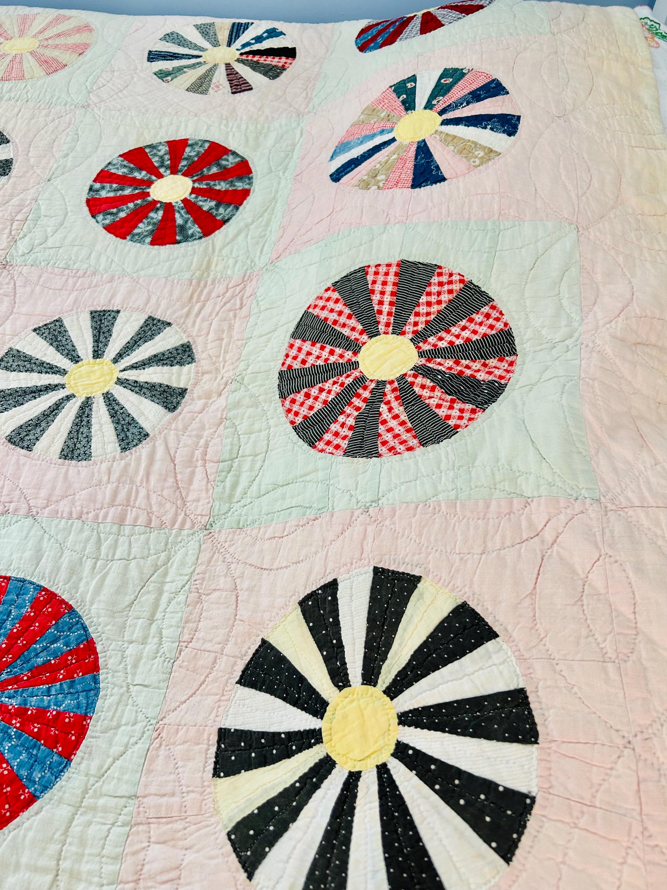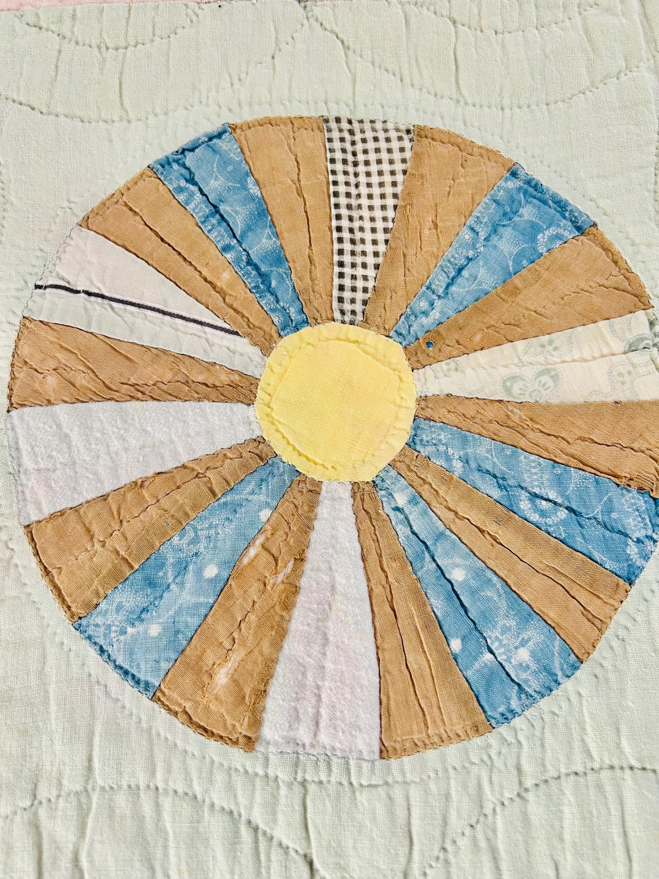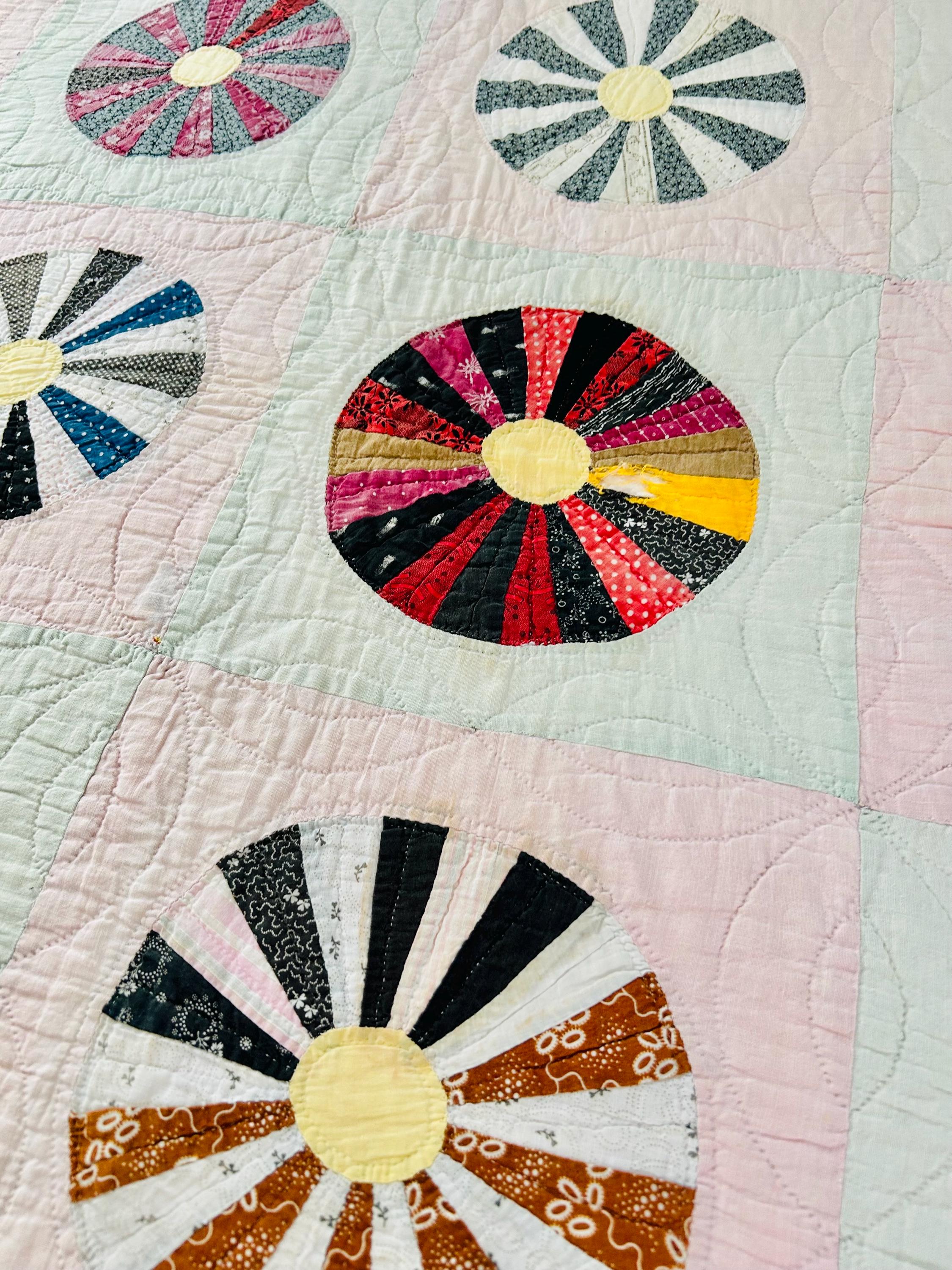 This beautiful Aster Quilt dates to the 1920s–1930s and features hand-pieced and hand-quilted construction. Each circular “Aster” is made from carefully arranged wedges of period cottons—tiny florals, stripes, geometrics, and classic Depression-era color combinations. The soft pastel block settings are pink and mint green making each Aster stand out.