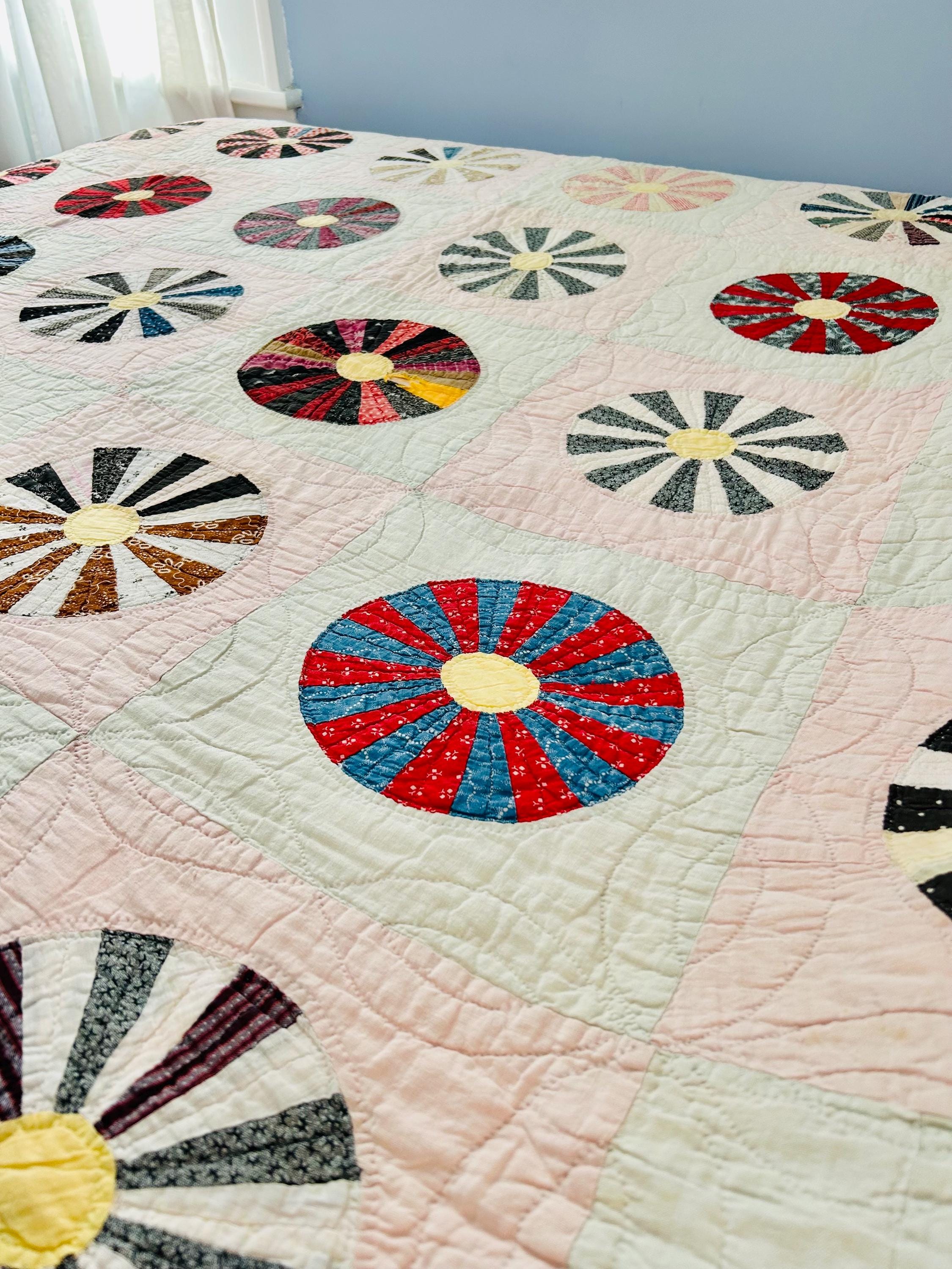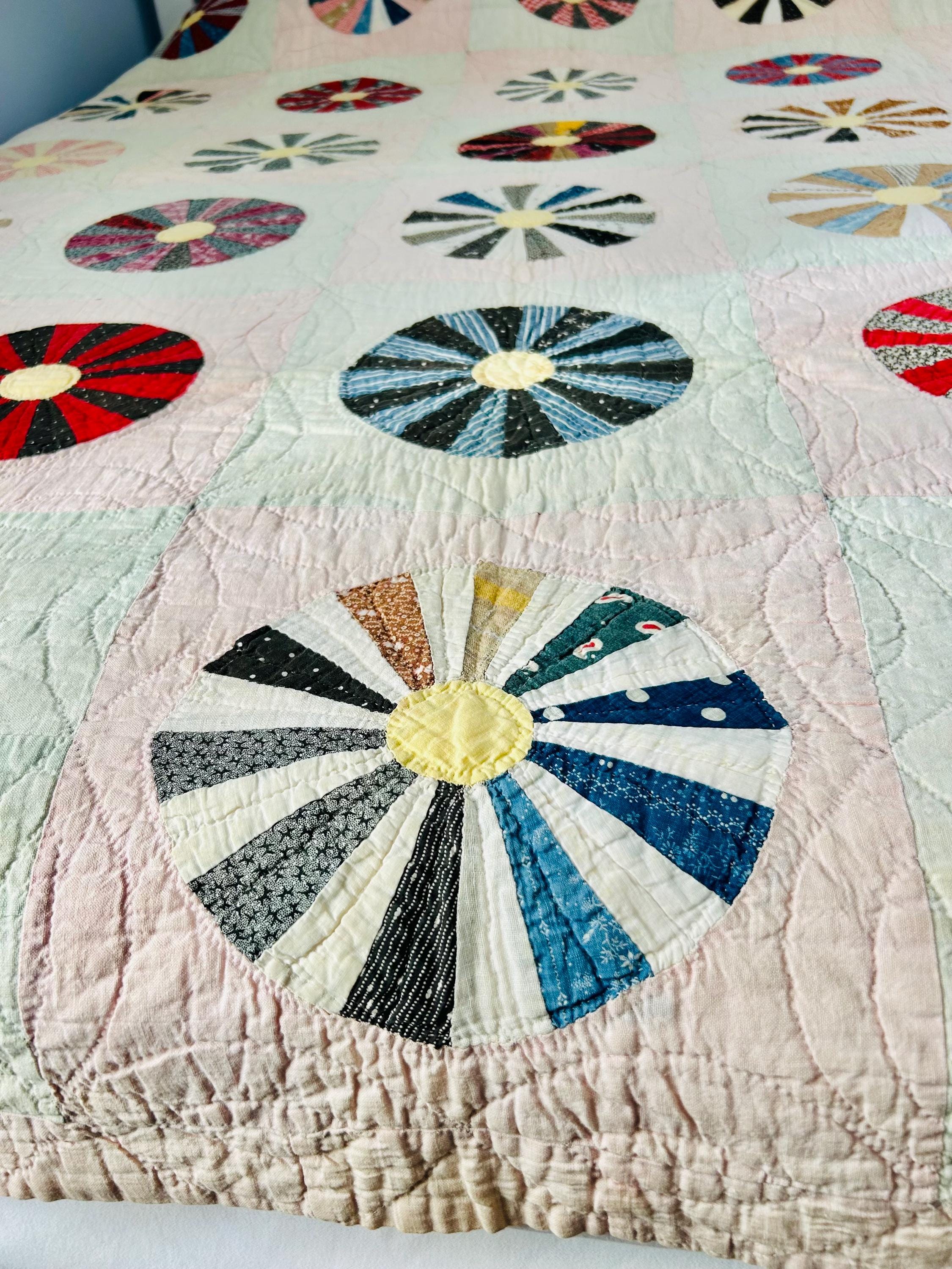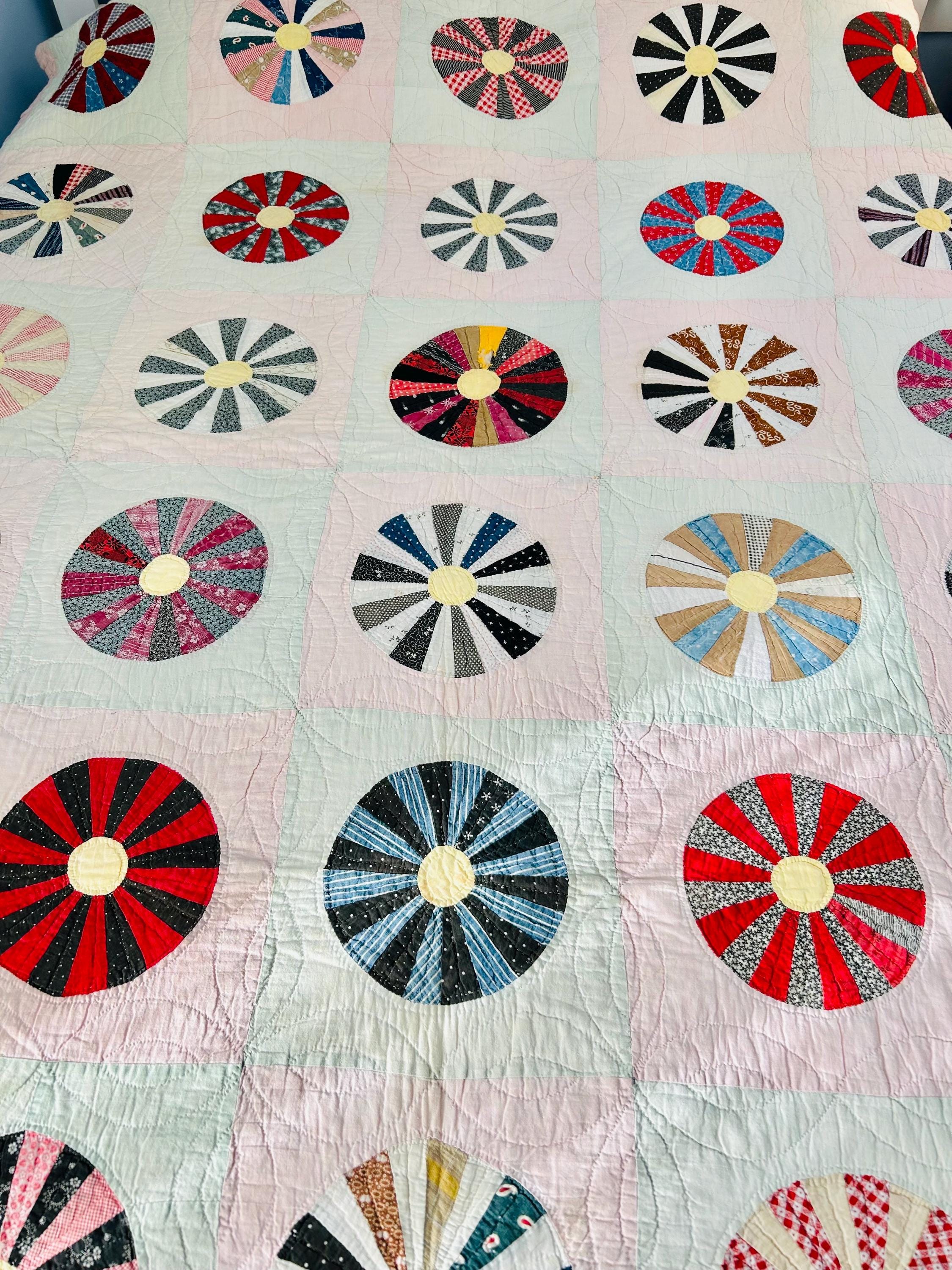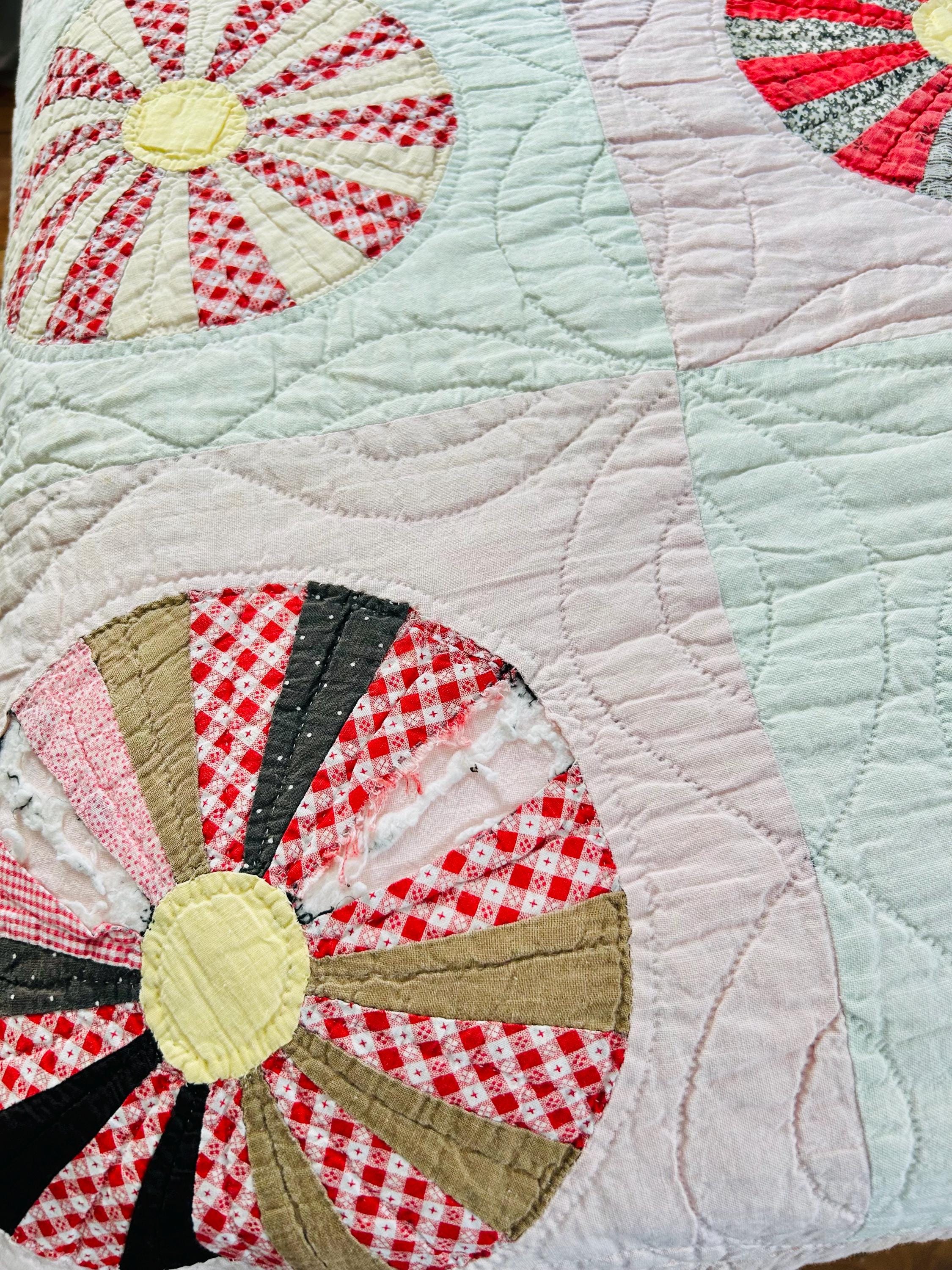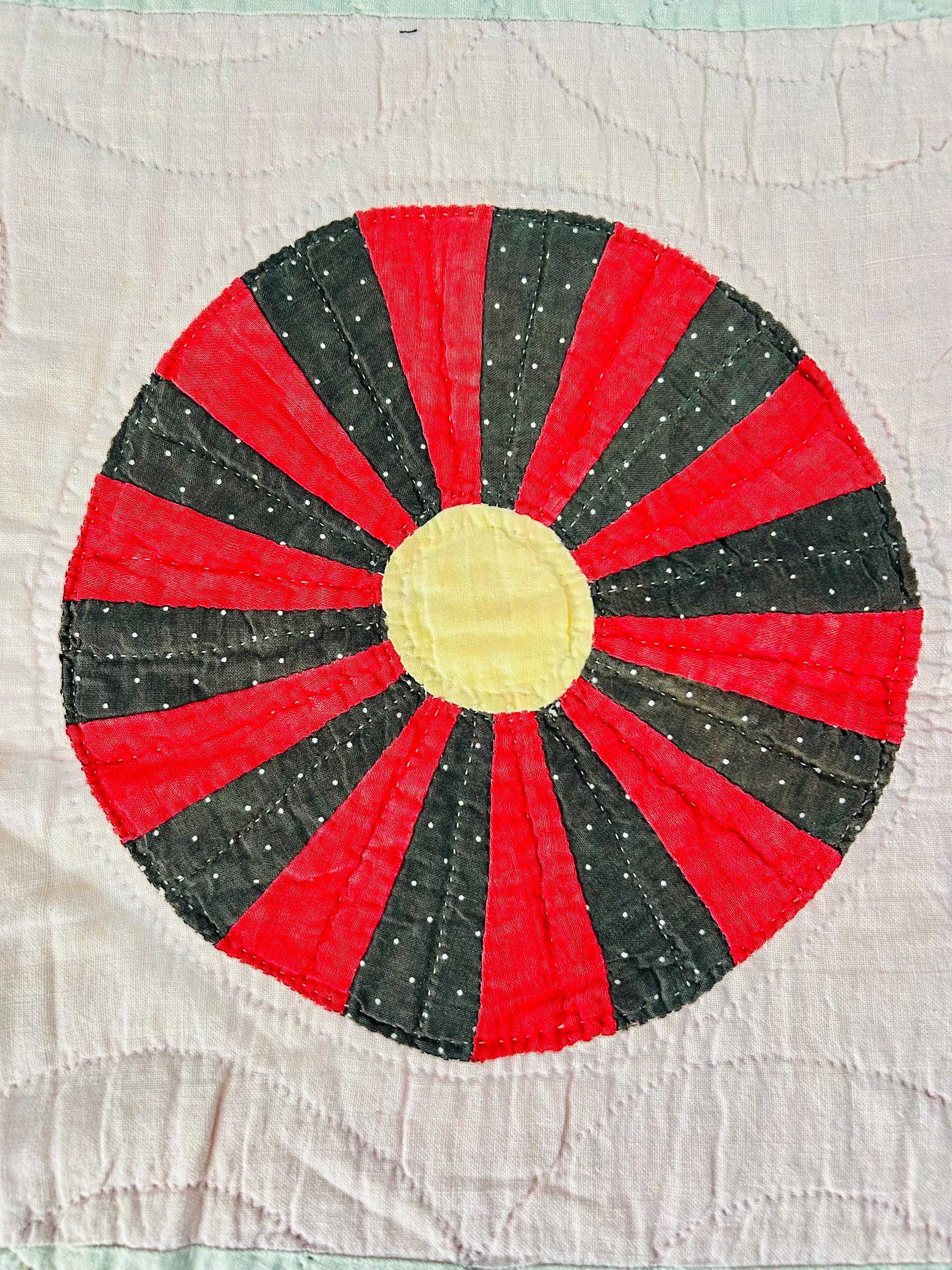 This beautiful Aster Quilt dates to the 1920s–1930s and features hand-pieced and hand-quilted construction. Each circular “Aster” is made from carefully arranged wedges of period cottons—tiny florals, stripes, geometrics, and classic Depression-era color combinations. The soft pastel block settings are pink and mint green making each Aster stand out.