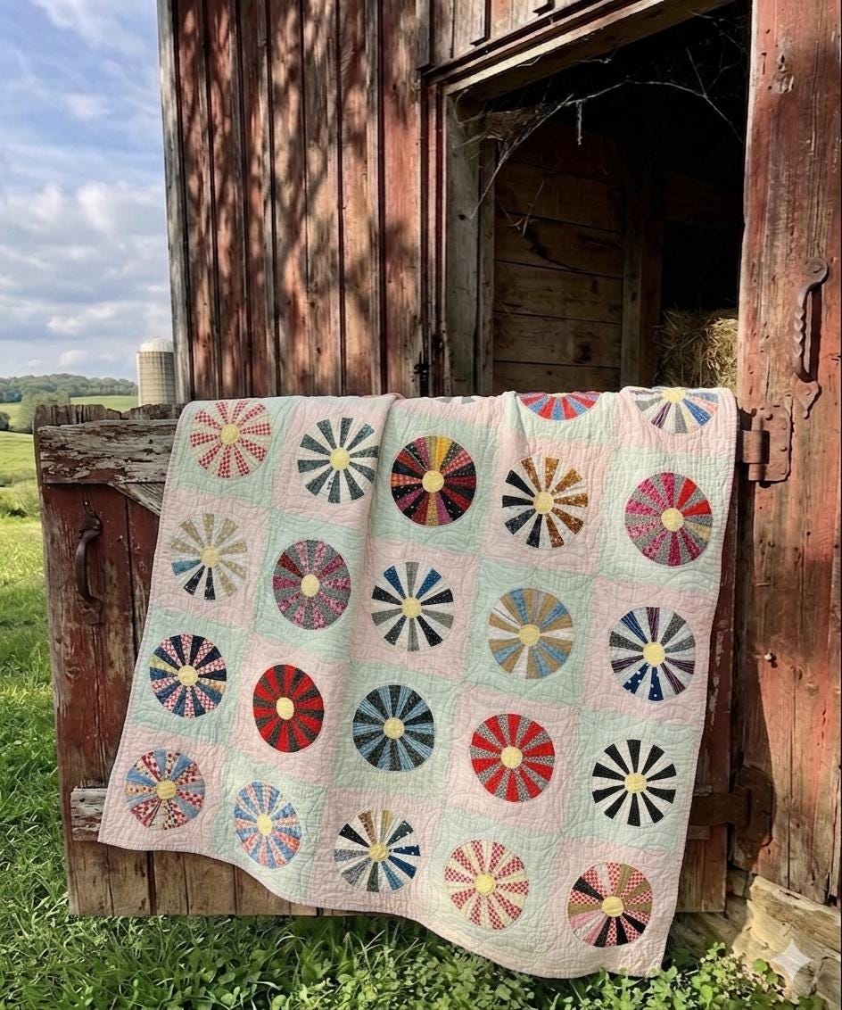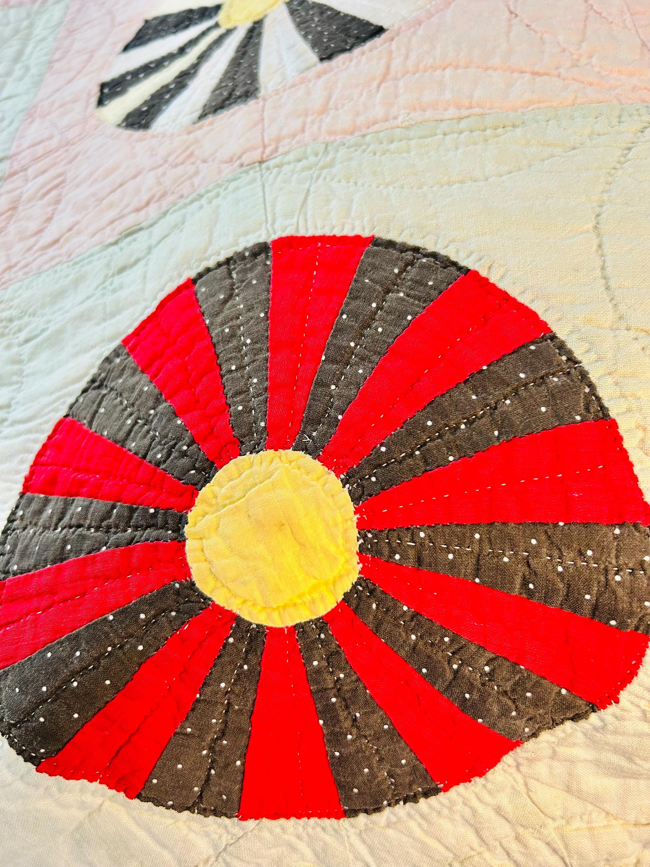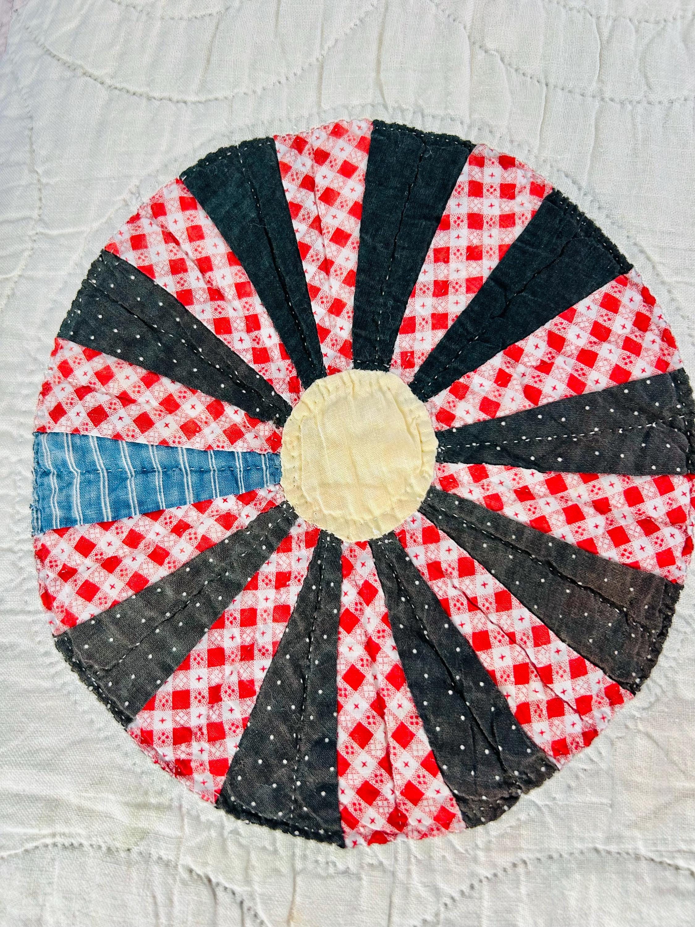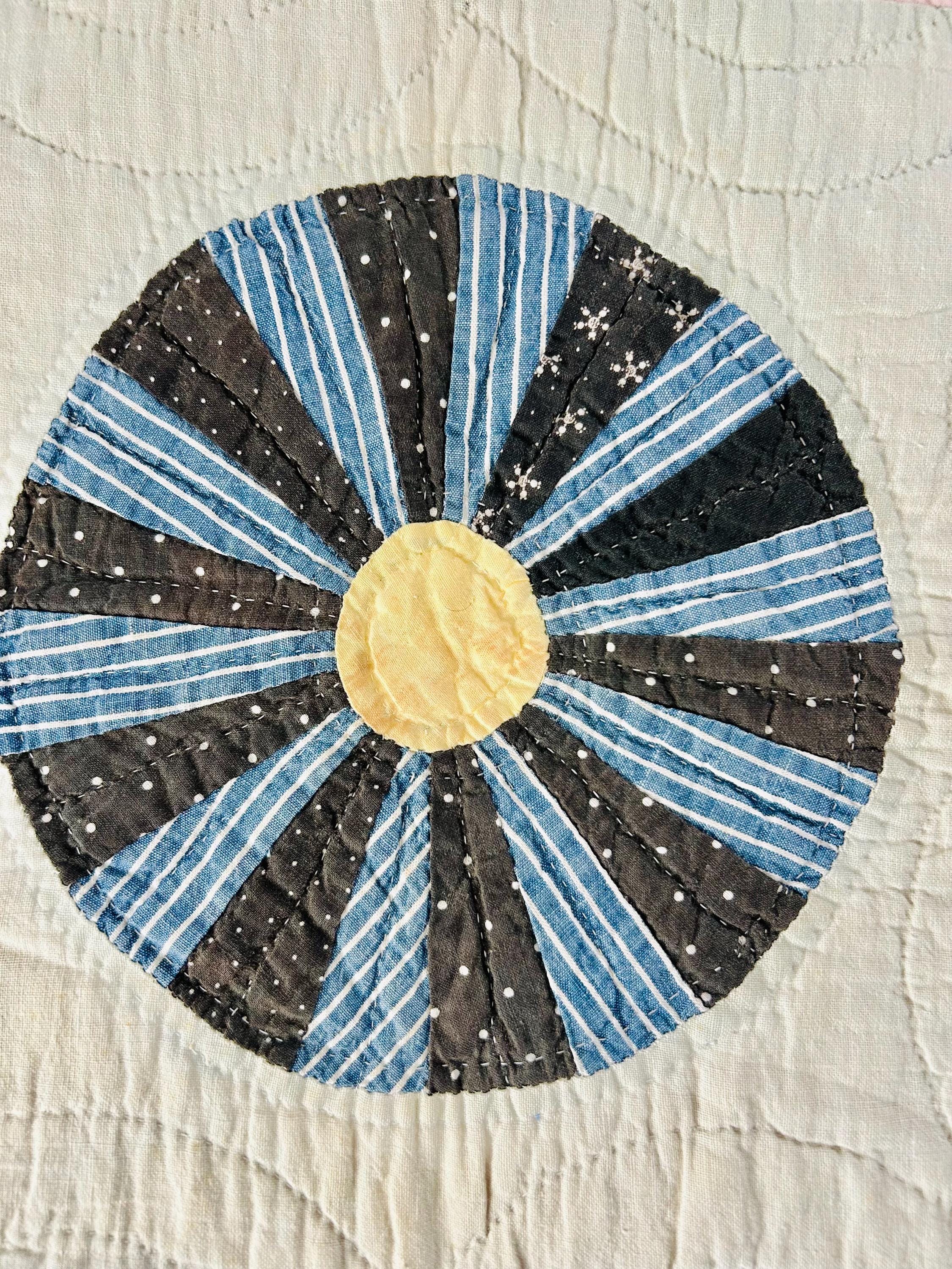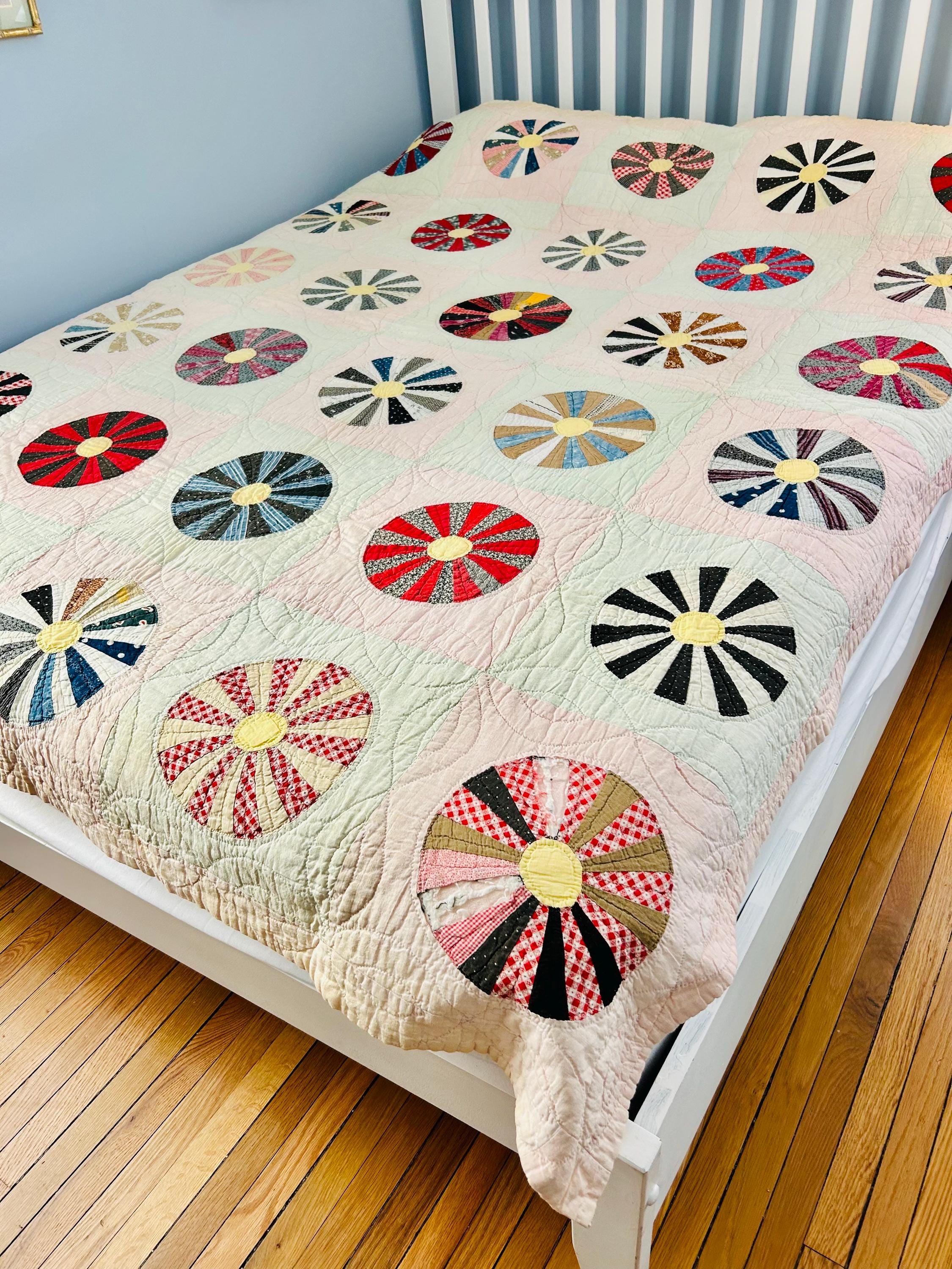 This beautiful Aster Quilt dates to the 1920s–1930s and features hand-pieced and hand-quilted construction. Each circular “Aster” is made from carefully arranged wedges of period cottons—tiny florals, stripes, geometrics, and classic Depression-era color combinations. The soft pastel block settings are pink and mint green making each Aster stand out.