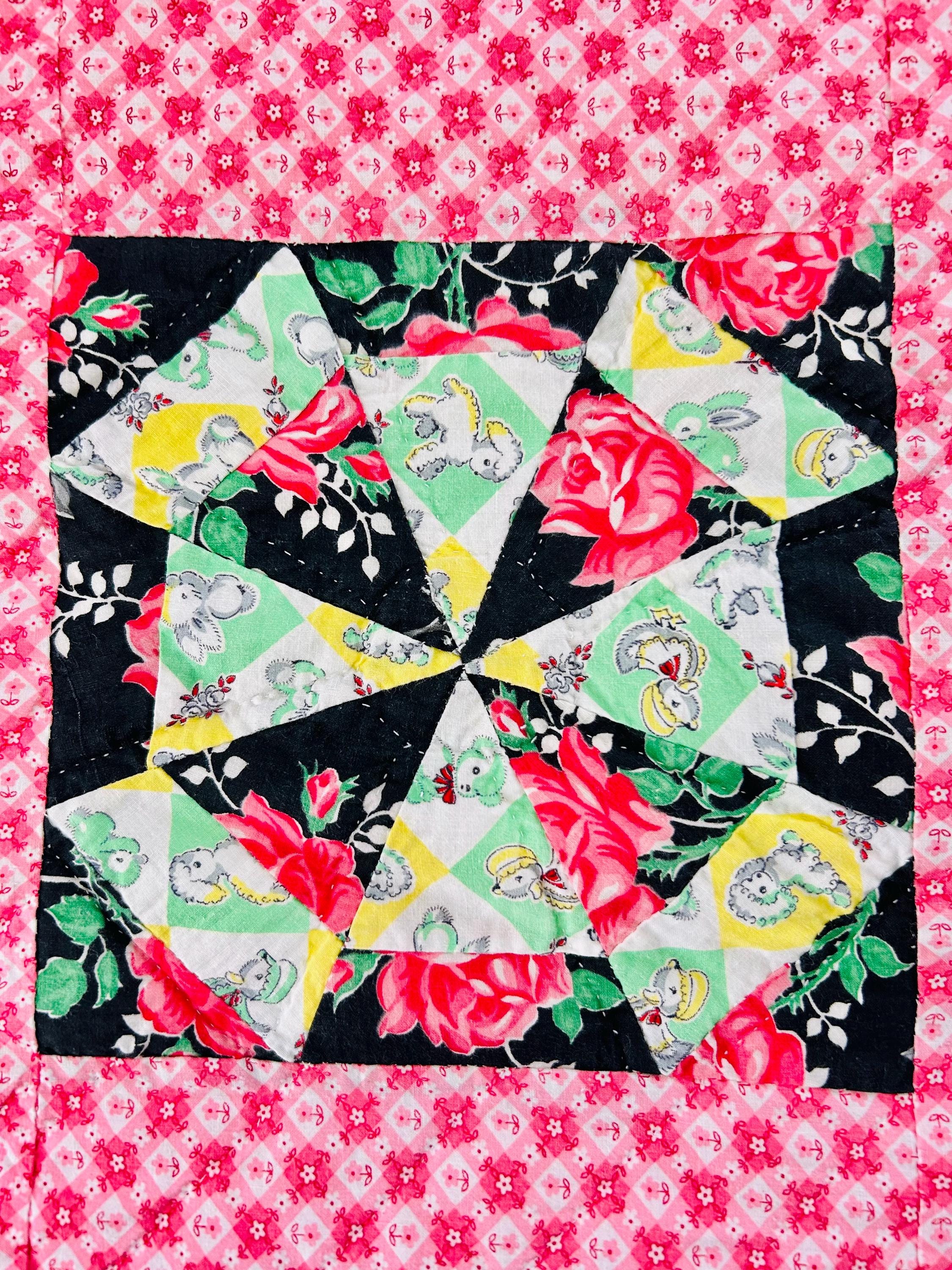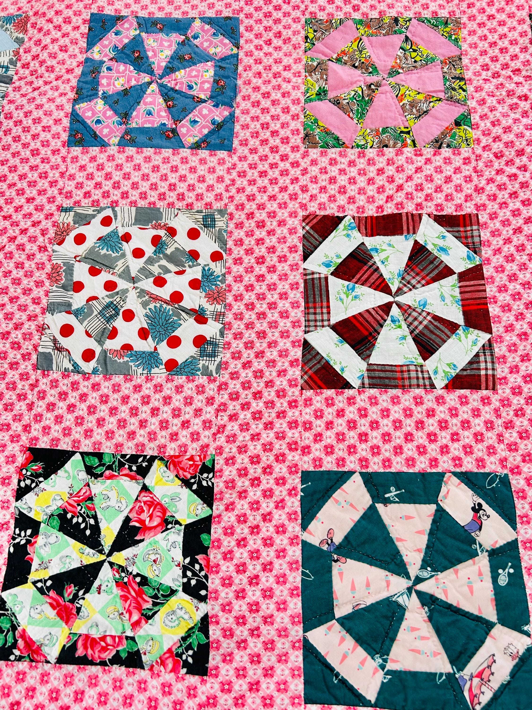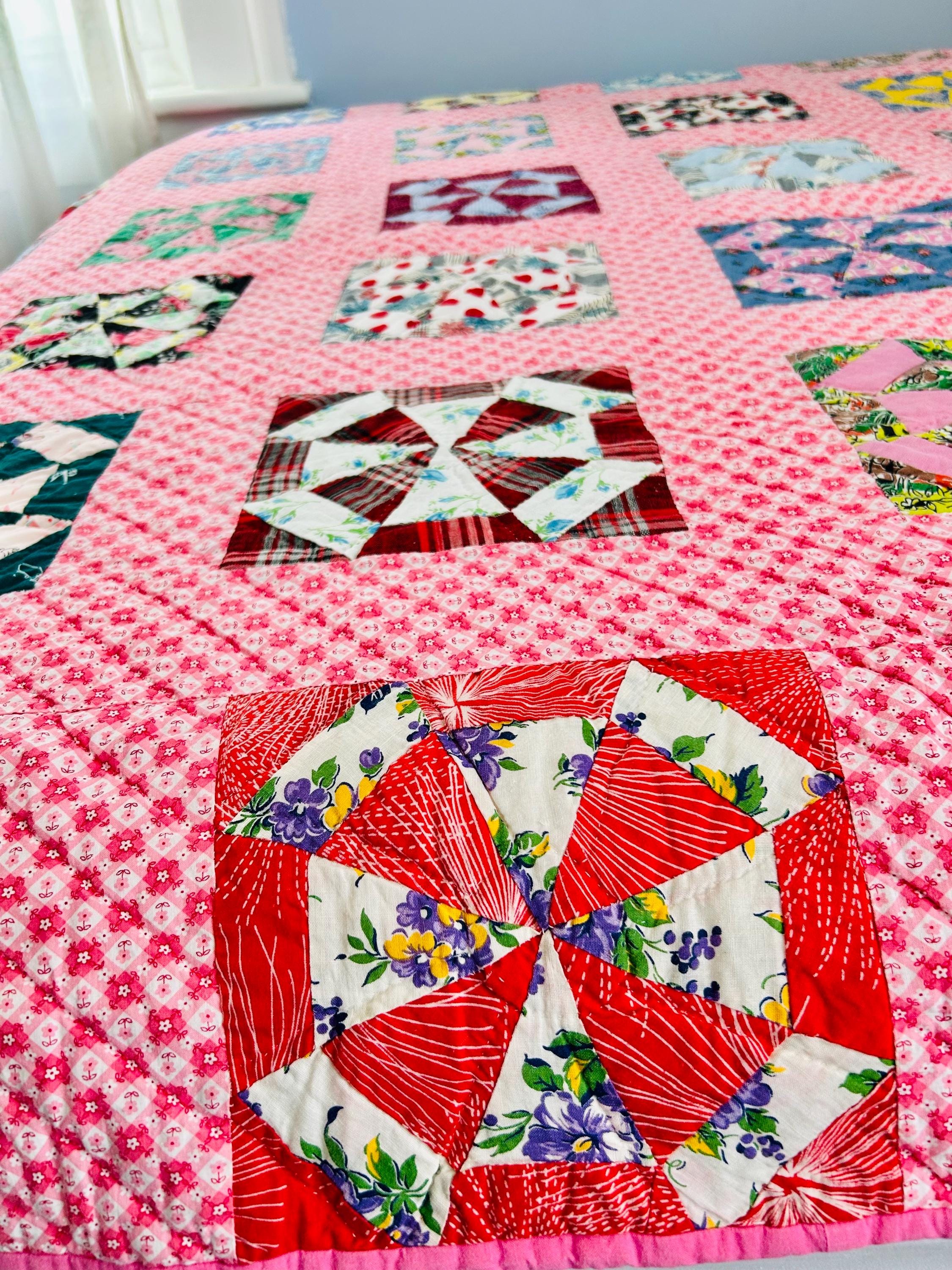 This is a joyful, scrappy mid-century Mystic Maze Quilt composed of hand-pieced blocks set in a soft pink calico background. The blocks are made of florals, geometrics, plaids, and charming novelty fabrics—some featuring whimsical motifs like mice, toys, and mid-century novelty designs. The hand-quilting is in outlines of the patchwork and -- in the sashing and four-sided border - in diagonal grids.