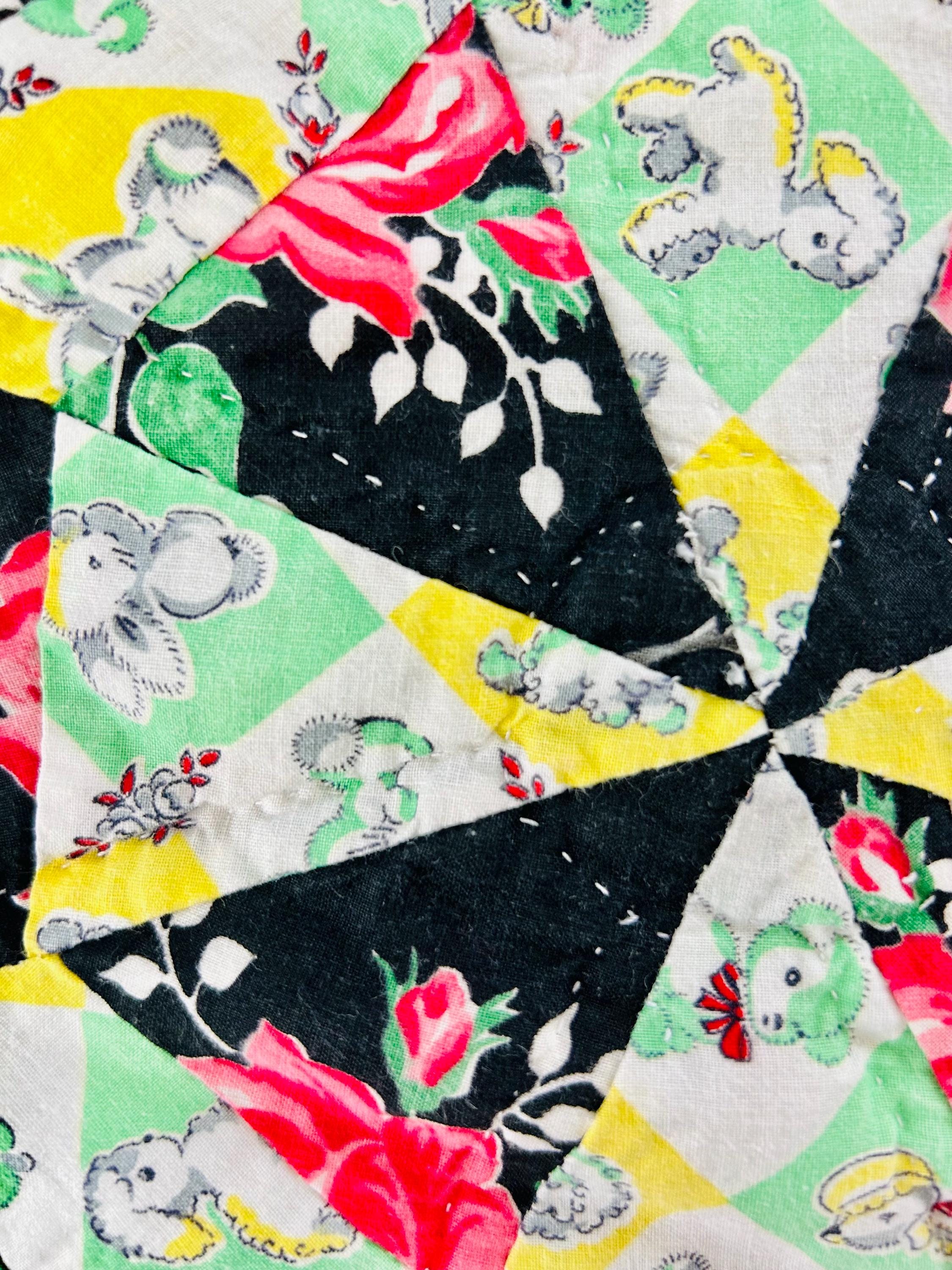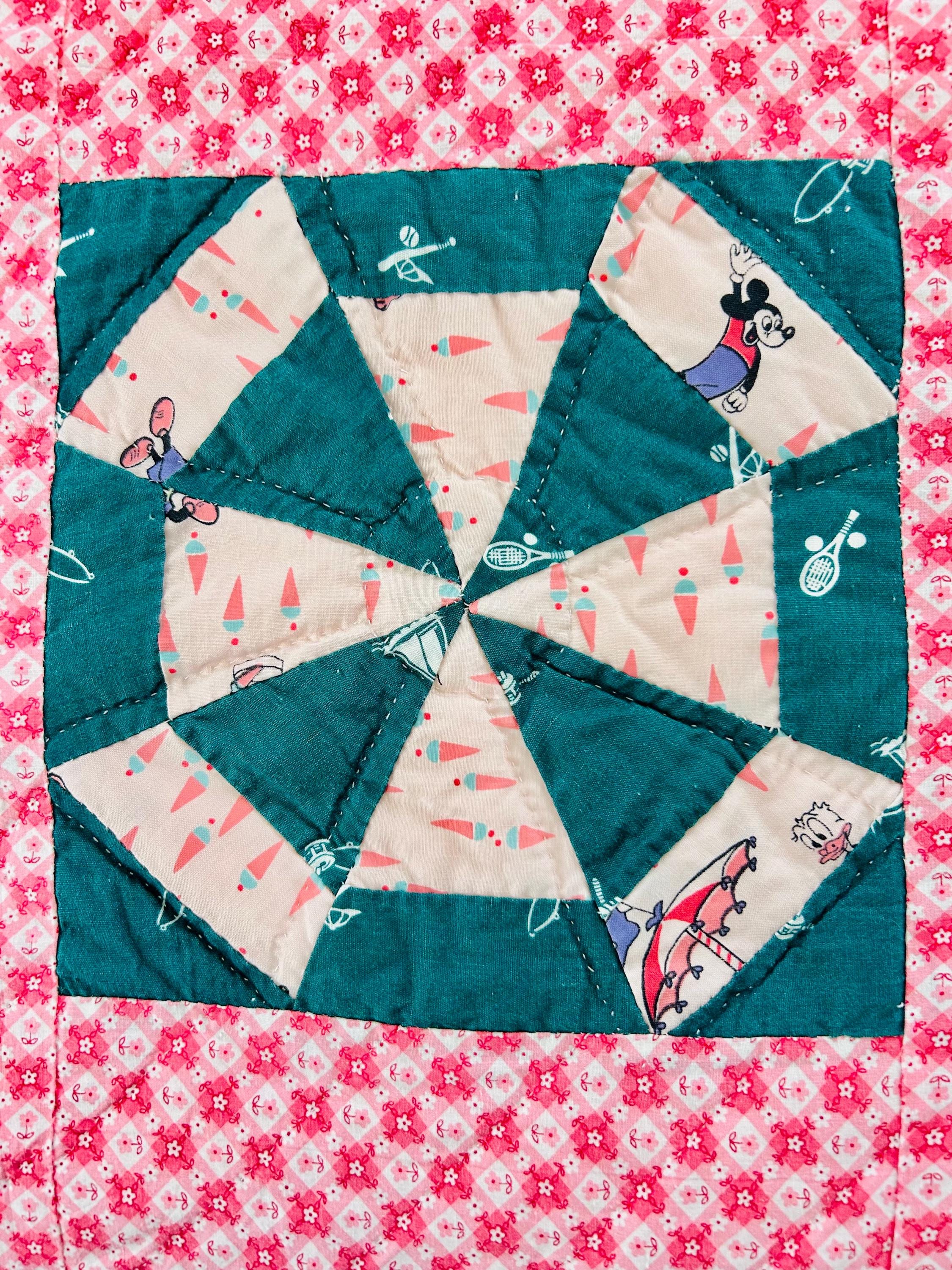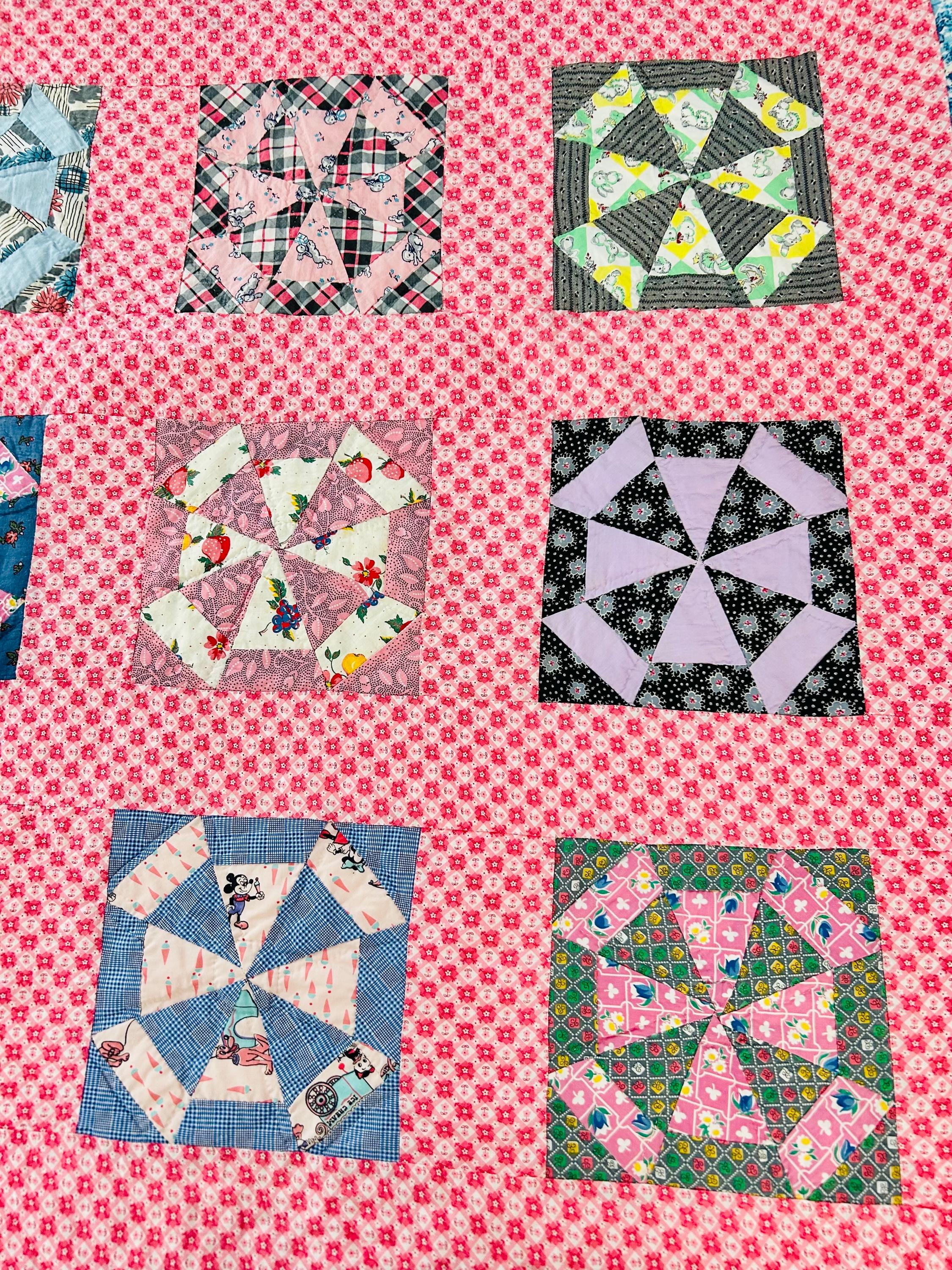 This is a joyful, scrappy mid-century Mystic Maze Quilt composed of hand-pieced blocks set in a soft pink calico background. The blocks are made of florals, geometrics, plaids, and charming novelty fabrics—some featuring whimsical motifs like mice, toys, and mid-century novelty designs. The hand-quilting is in outlines of the patchwork and -- in the sashing and four-sided border - in diagonal grids.
