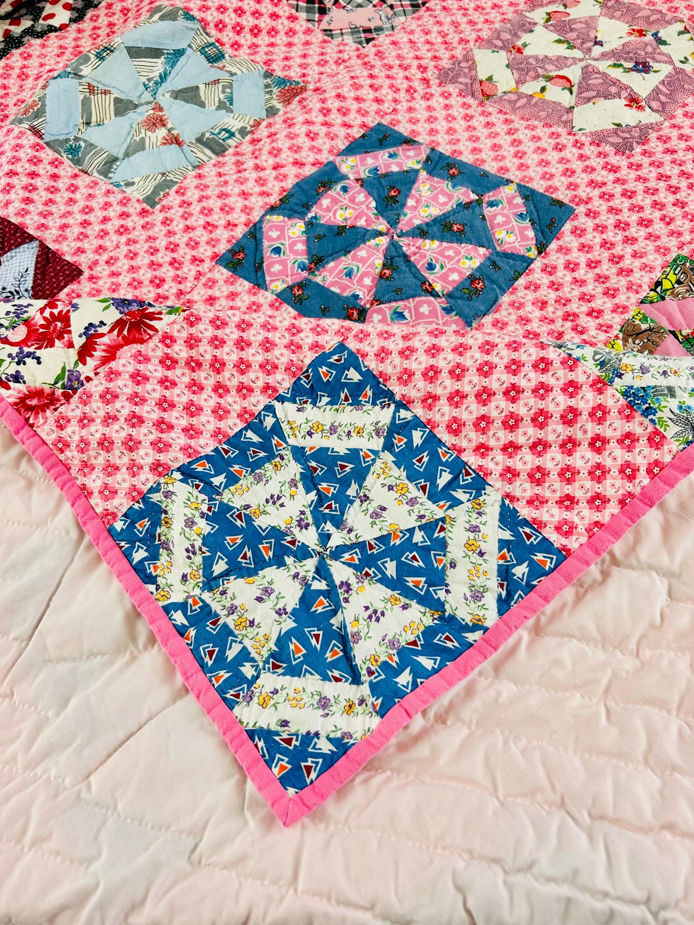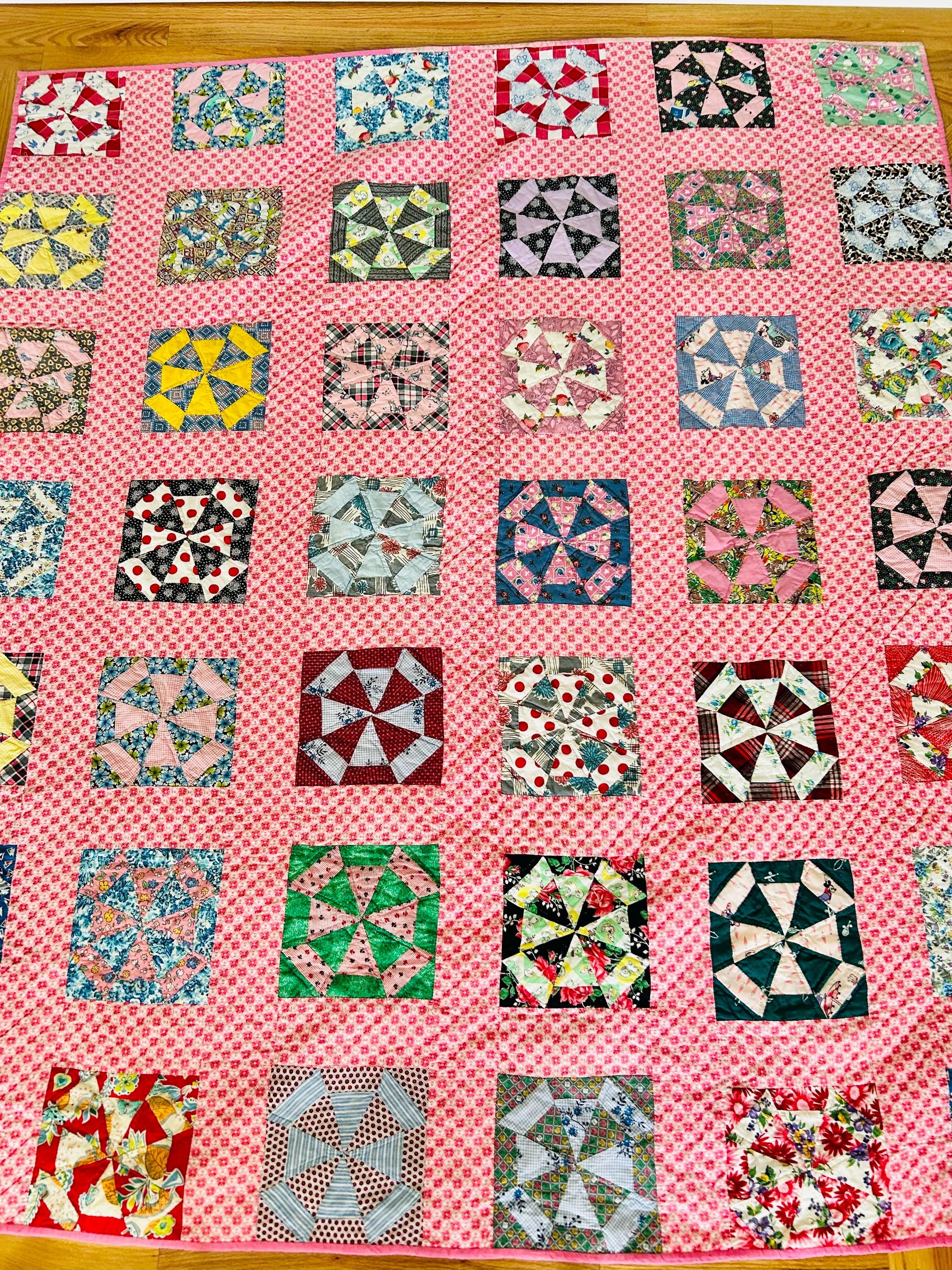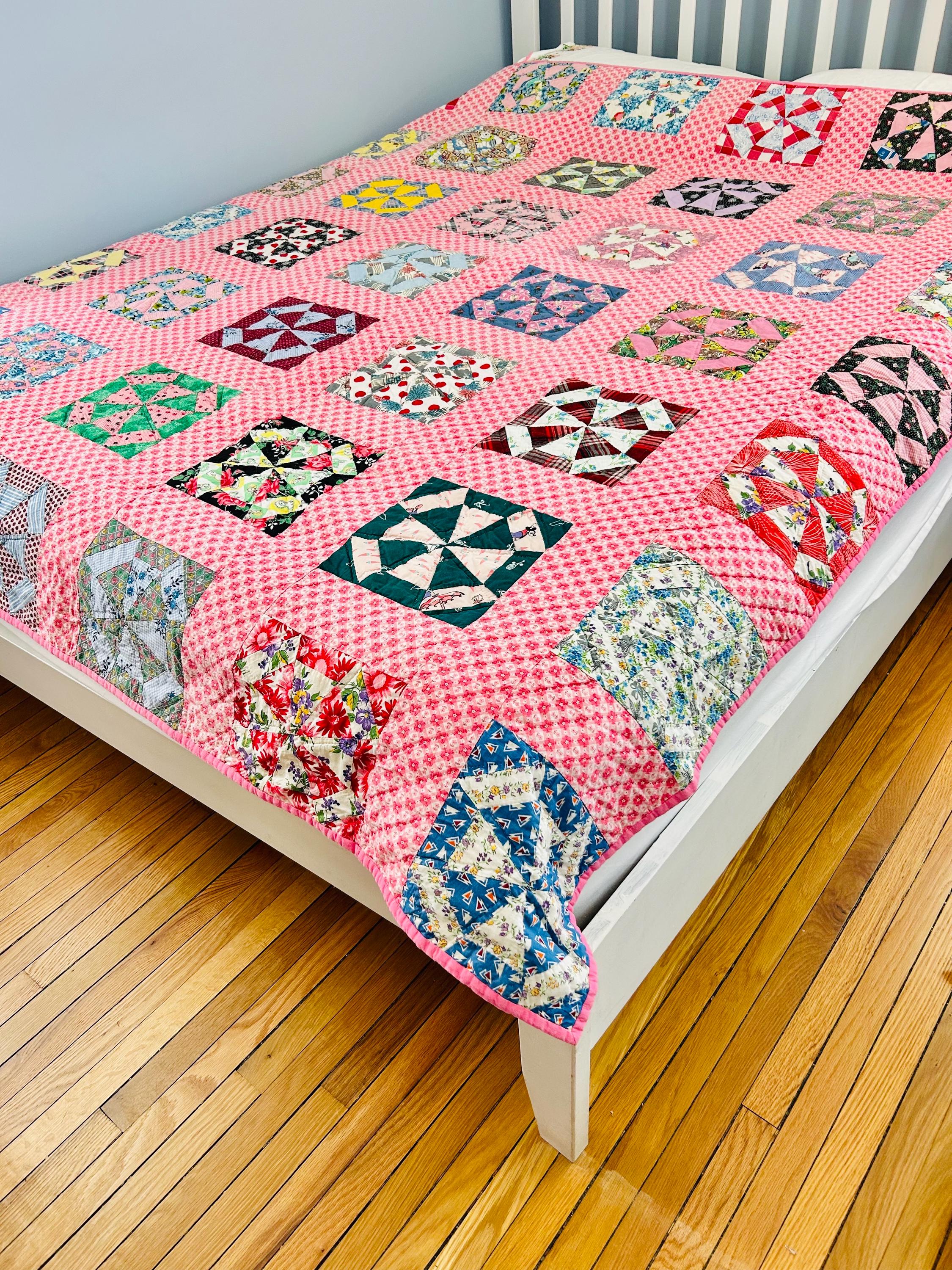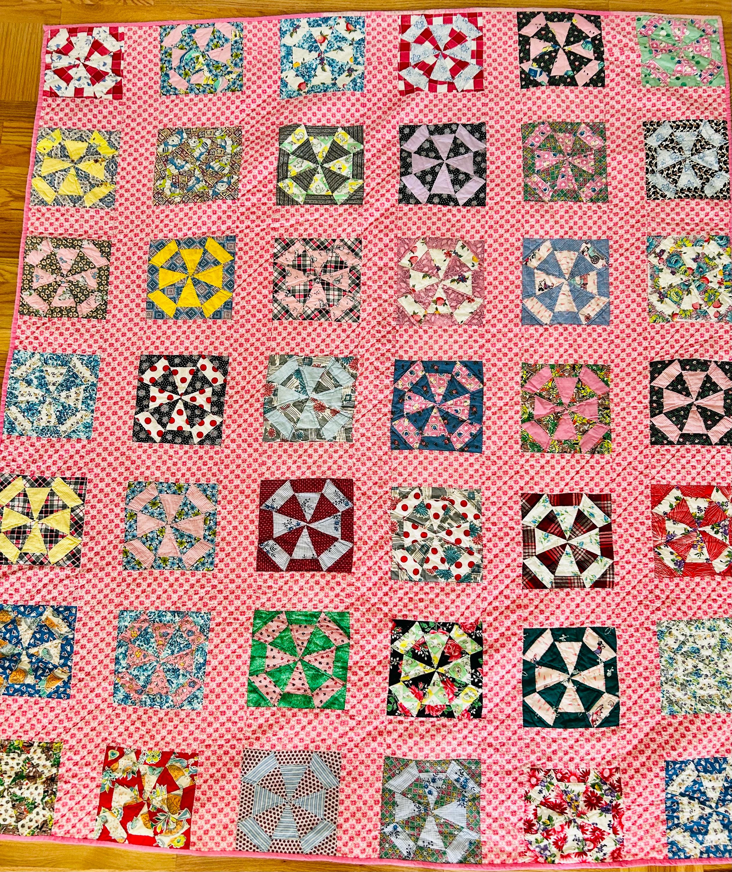 Details: * Pattern: Mystic Maze * Date: 1960s * Size: 66” x 76” (nice throw / small bed size) * Materials: Cotton fabrics * Batting: Lightweight batting * Backing: Solid white * Construction: Machine and hand-pieced, hand quilted * Colors: Pink ground with multicolor blocks (reds, blues, greens, yellows, black, white)