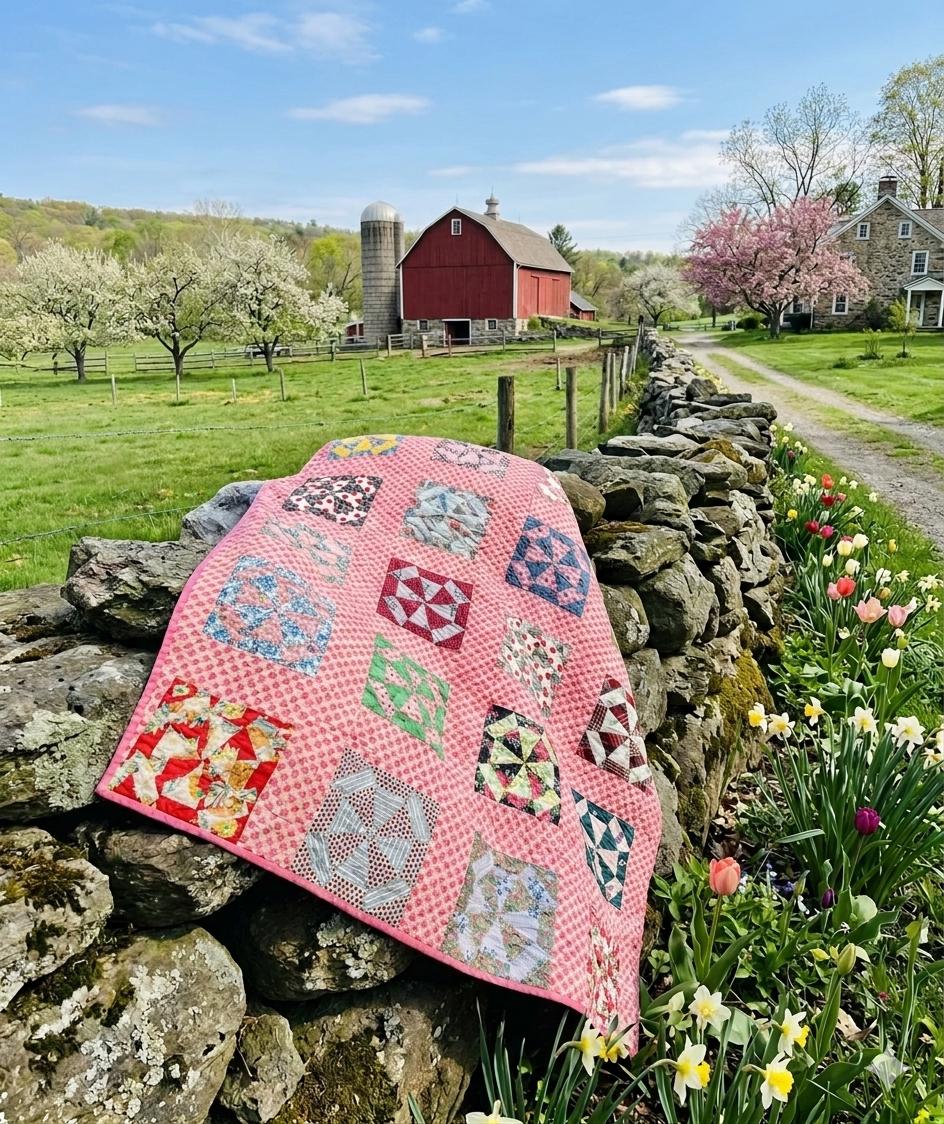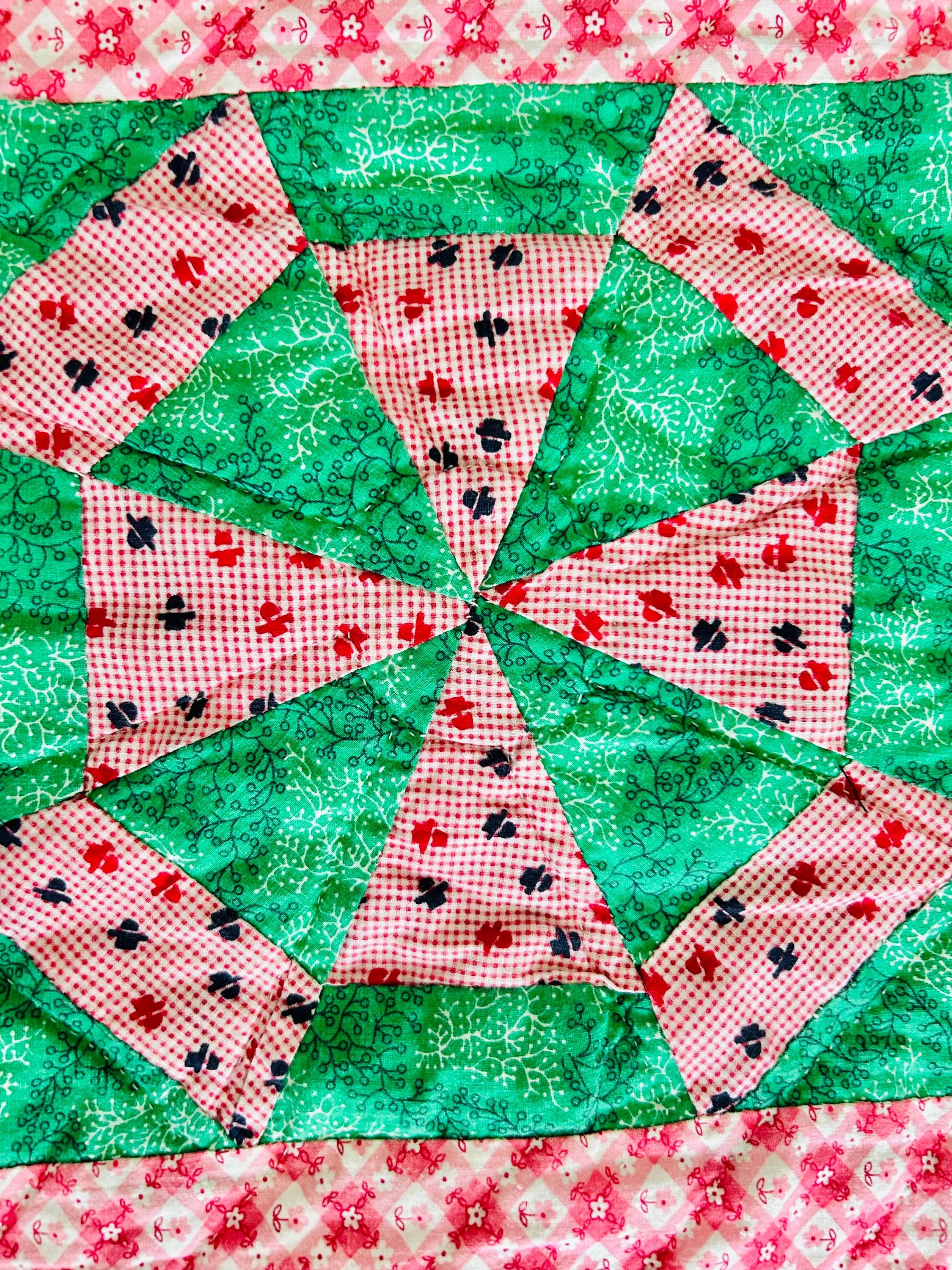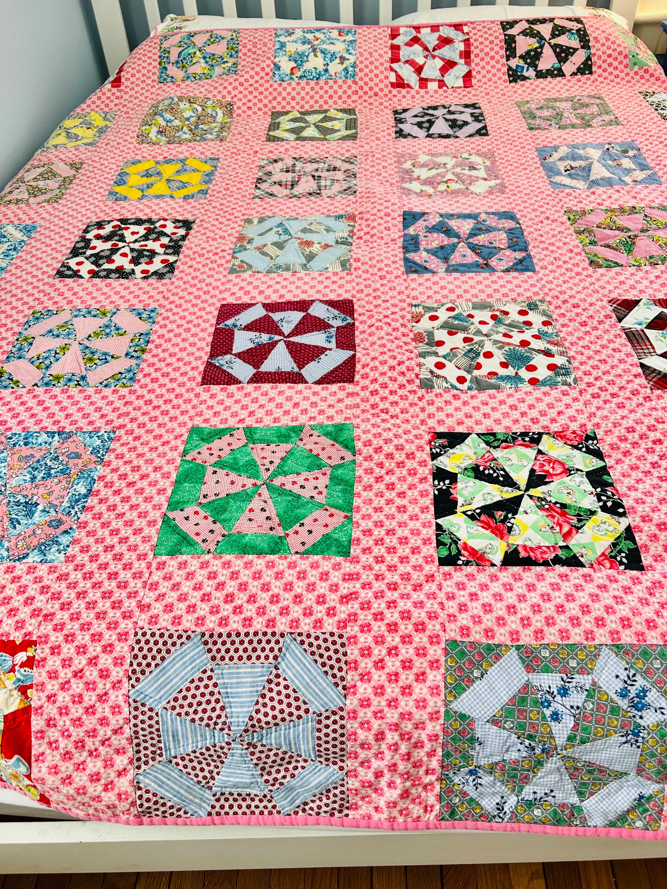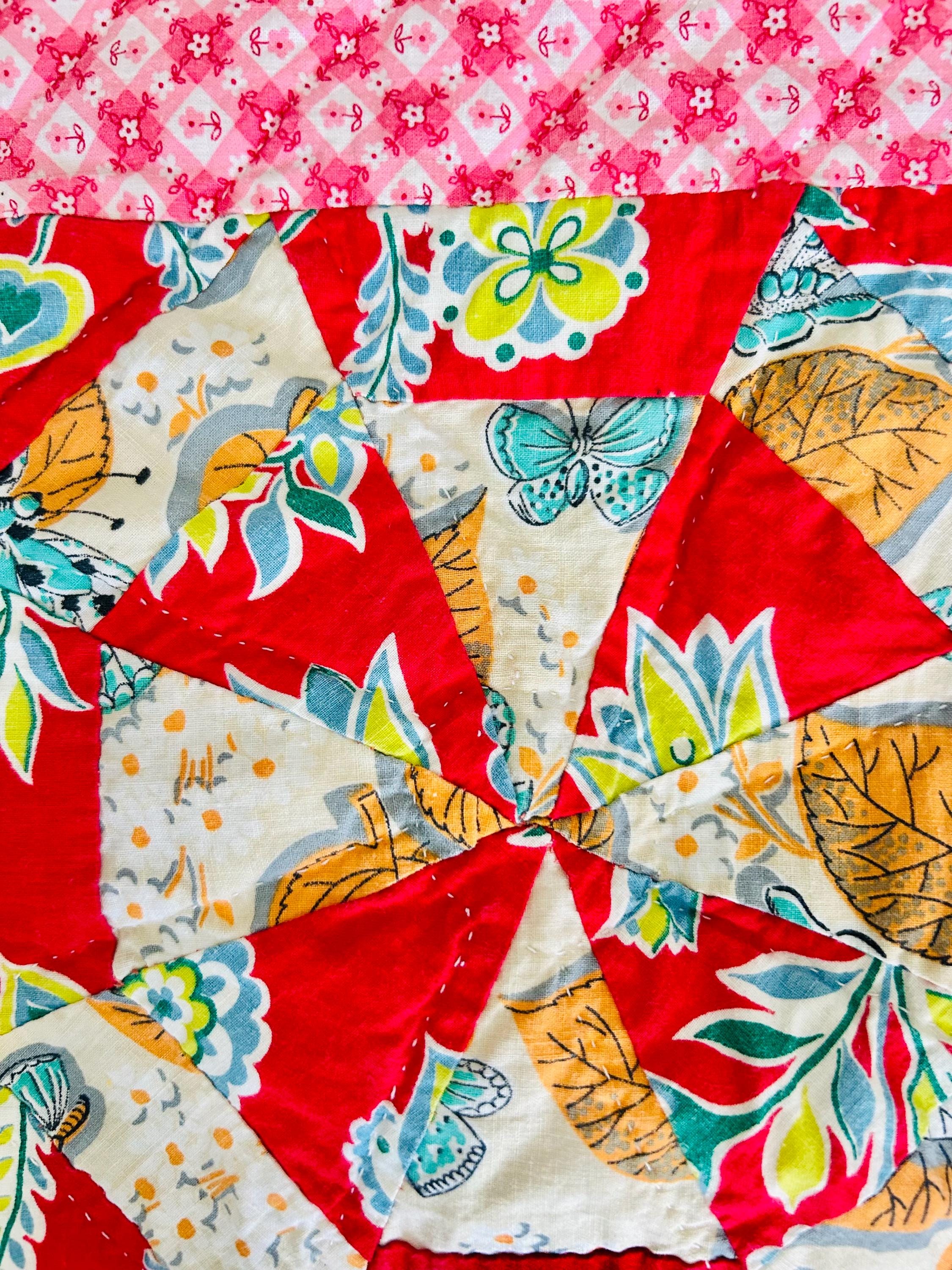 Details: * Pattern: Mystic Maze * Date: 1960s * Size: 66” x 76” (nice throw / small bed size) * Materials: Cotton fabrics * Batting: Lightweight batting * Backing: Solid white * Construction: Machine and hand-pieced, hand quilted * Colors: Pink ground with multicolor blocks (reds, blues, greens, yellows, black, white)