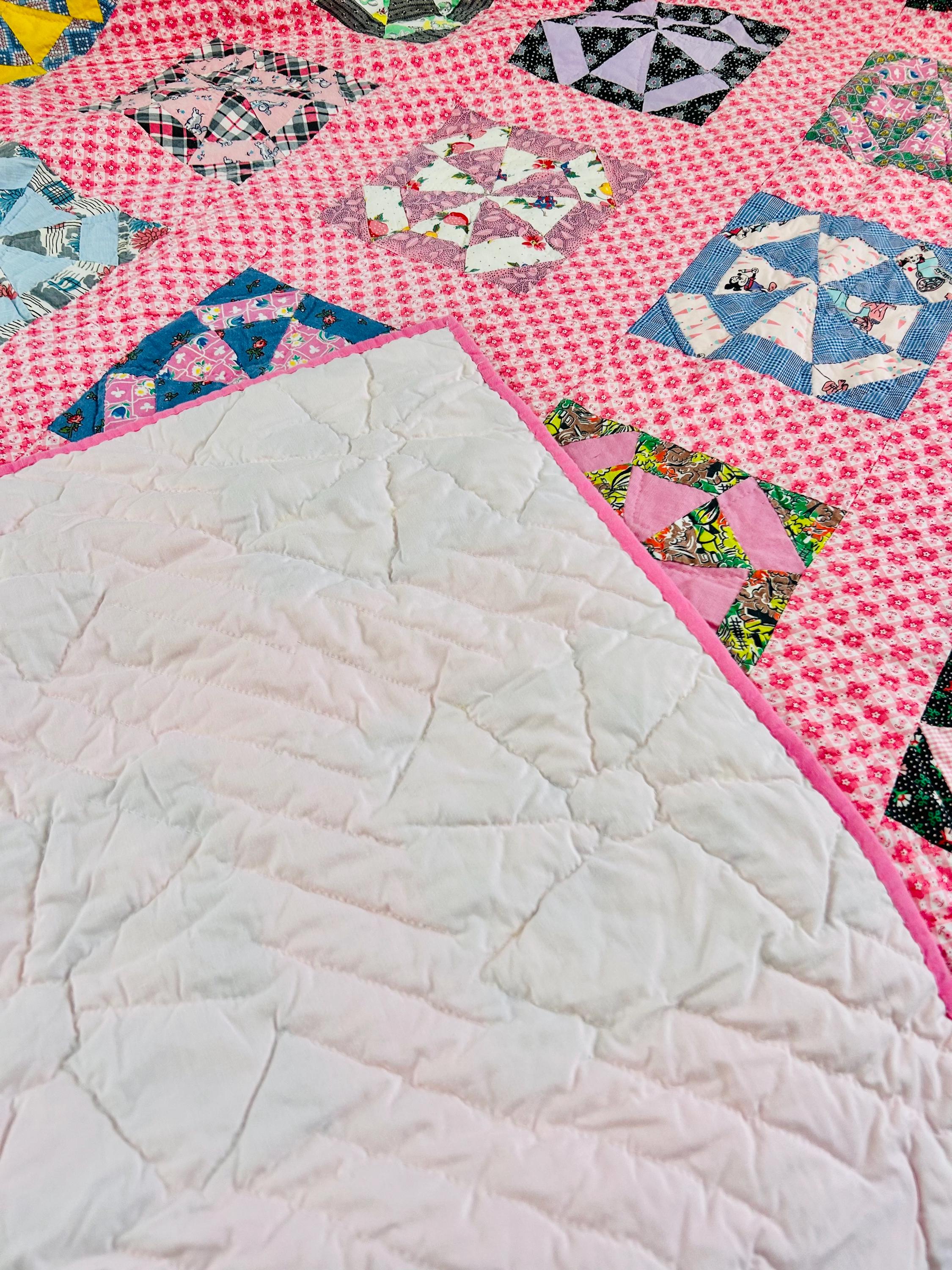 The back is a solid white cotton while the binding is pink cotton that has been machine stitched to the front and hand-stitched to the back. The batting is lightweight.