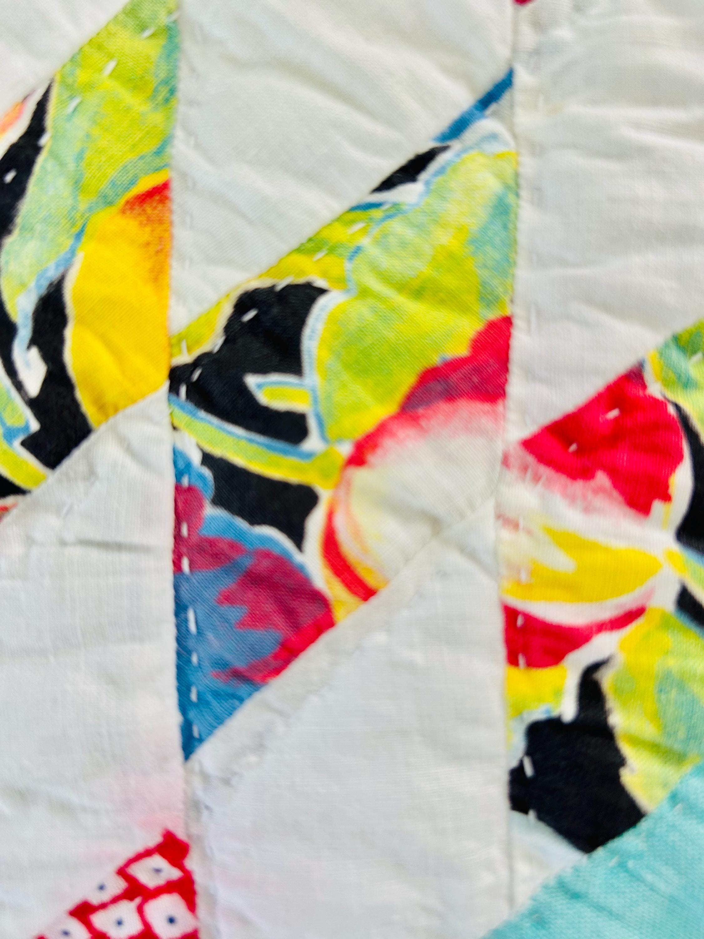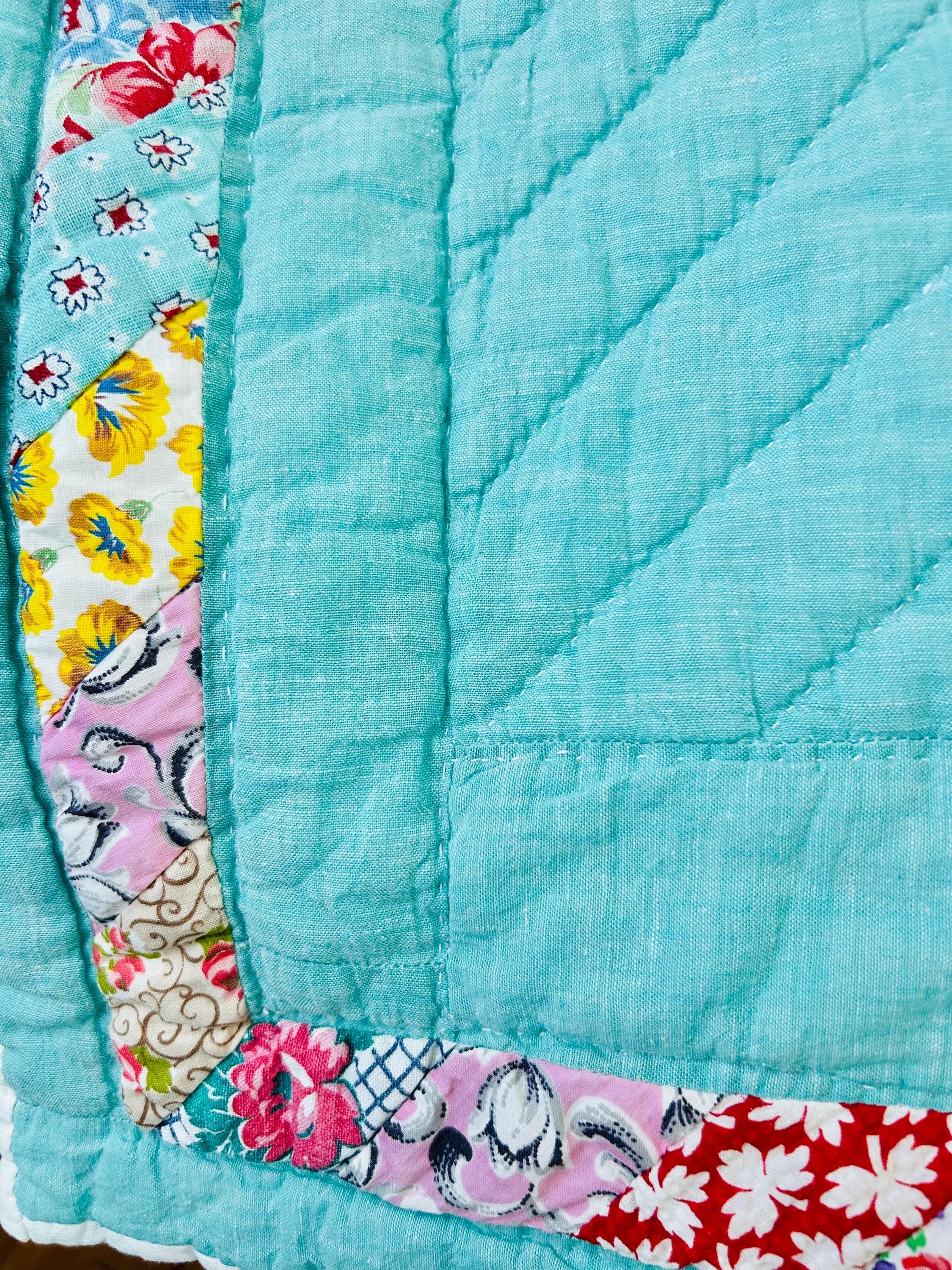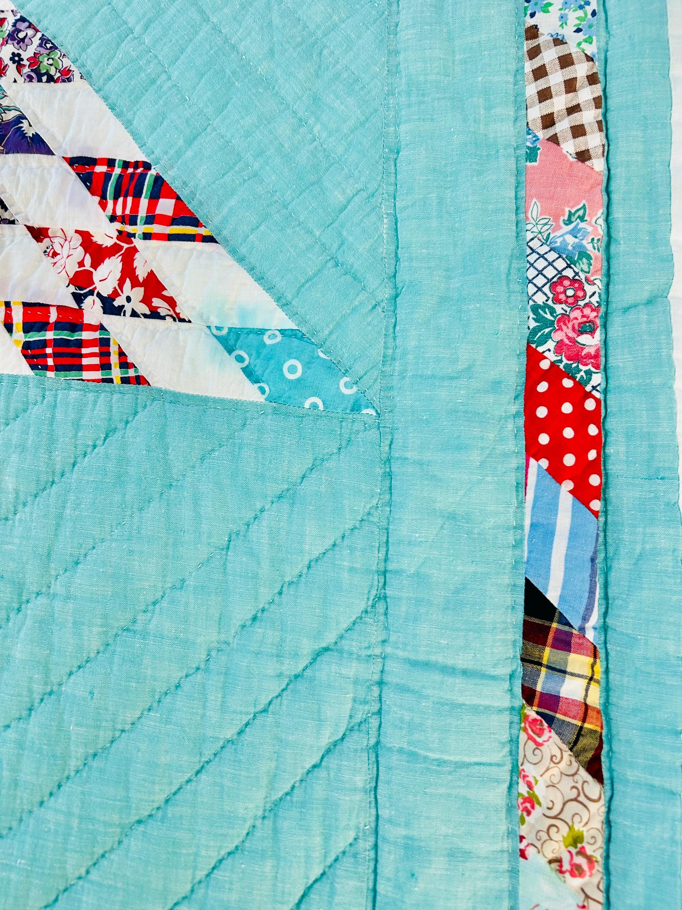 The hand-quilting is in outlines of the diamond patchwork and in a geometric chevron pattern in the open aqua blocks. The back is white cotton that has been turned to the front and hand-stitched to form the binding. The batting is lightweight.