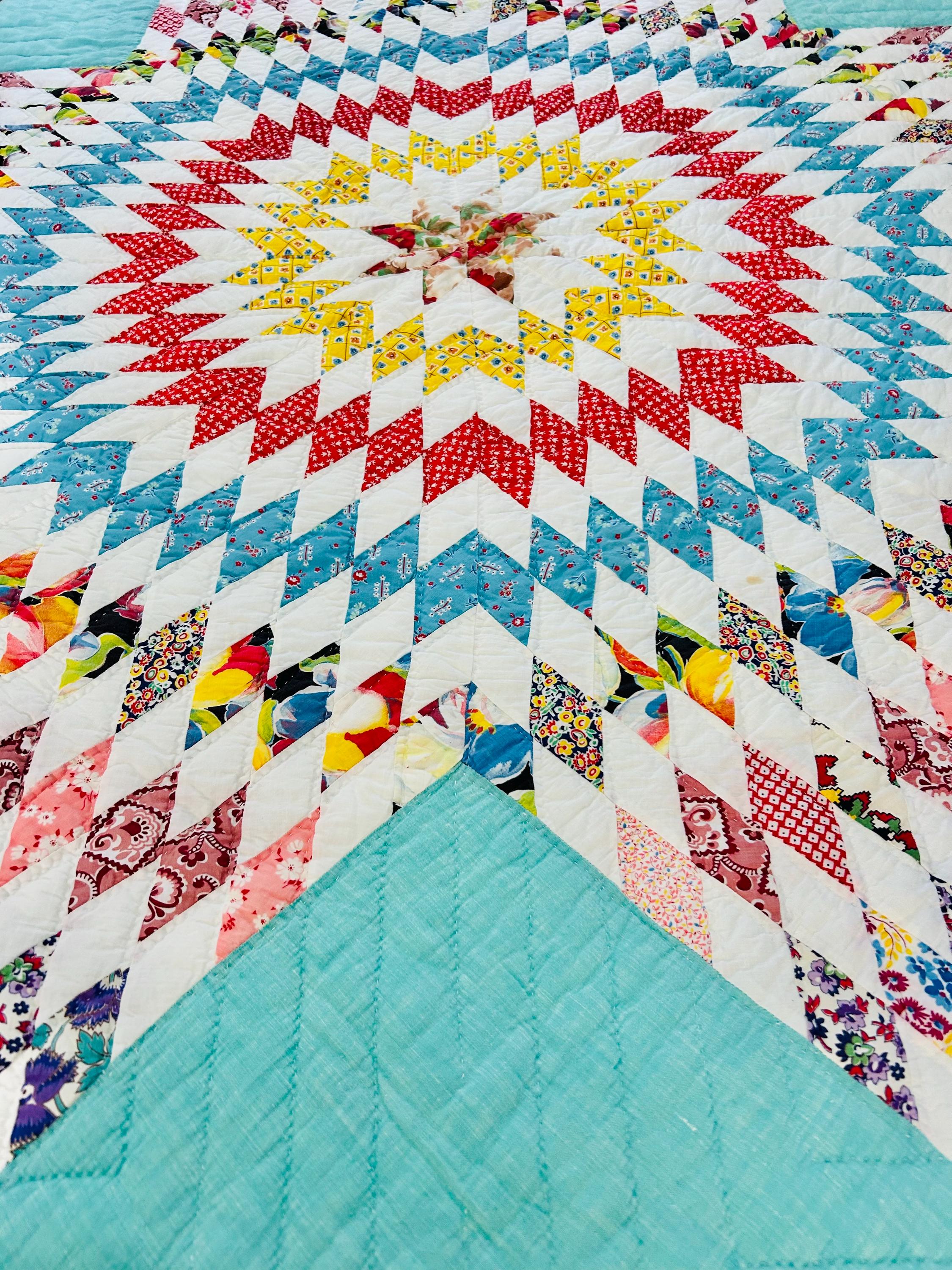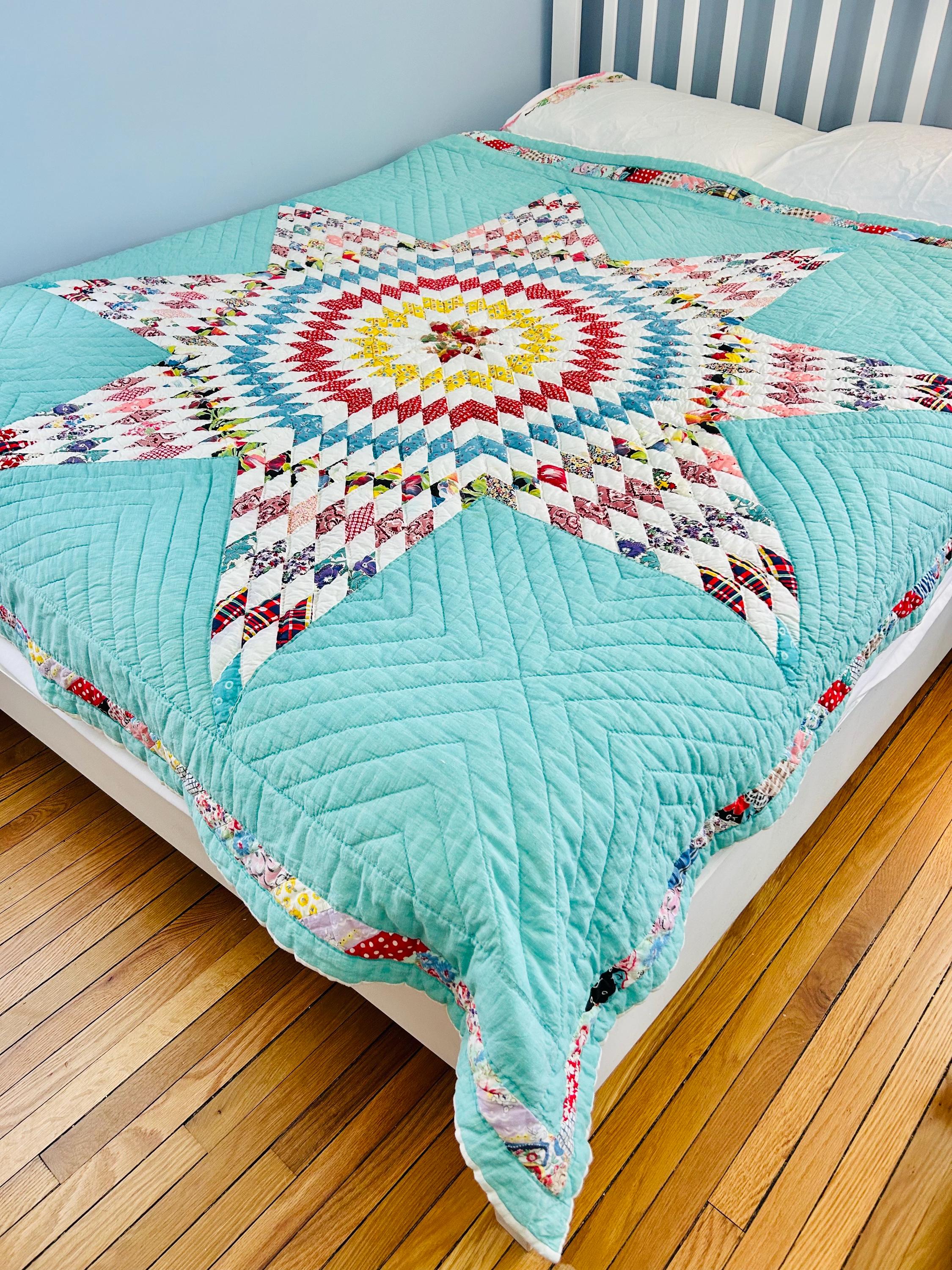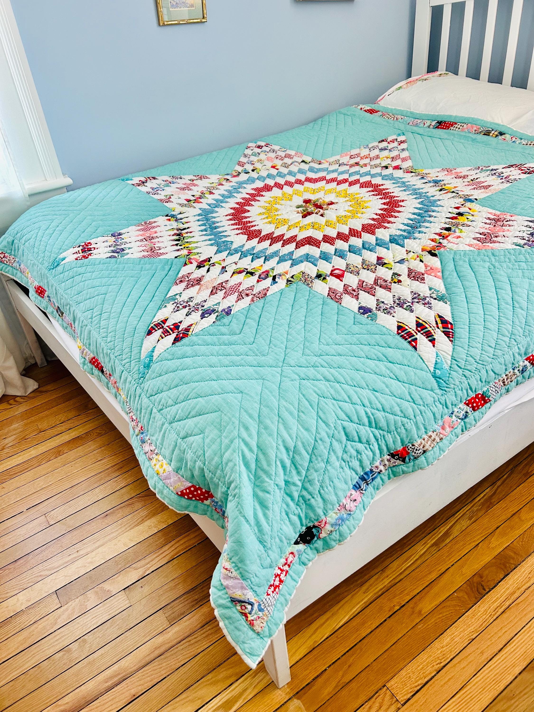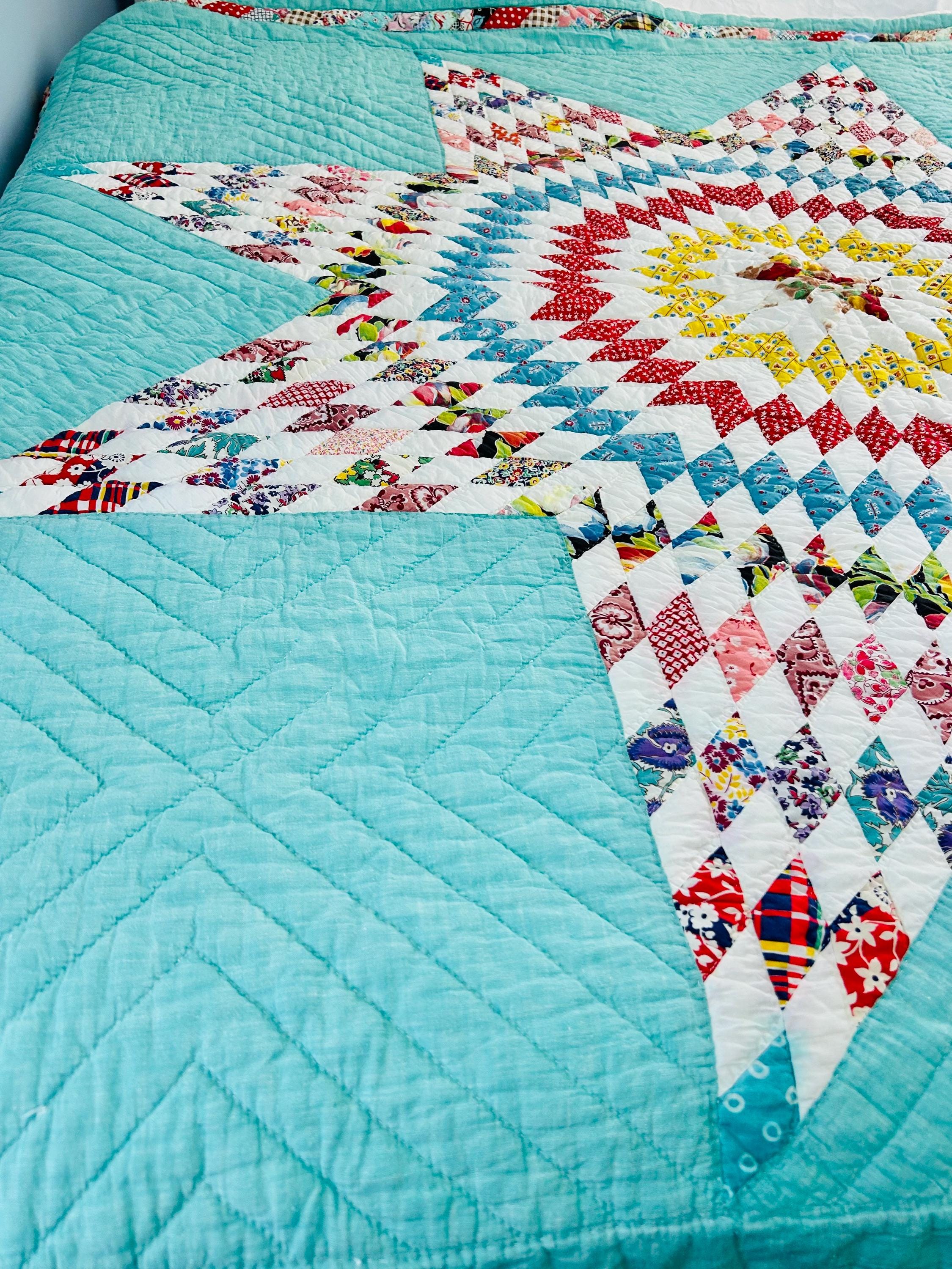 Details: * Pattern: Lone Star / Star of Bethlehem * Date: Circa 1950s–1960s * Size: 68” x 70” (nice throw / lap size) * Materials: Cotton fabrics; hand-pieced and hand-quilted * Batting: Lightweight cotton batting * Backing: White cotton backing * Quilting: Hand quilted in a geometric chevron pattern across the aqua field