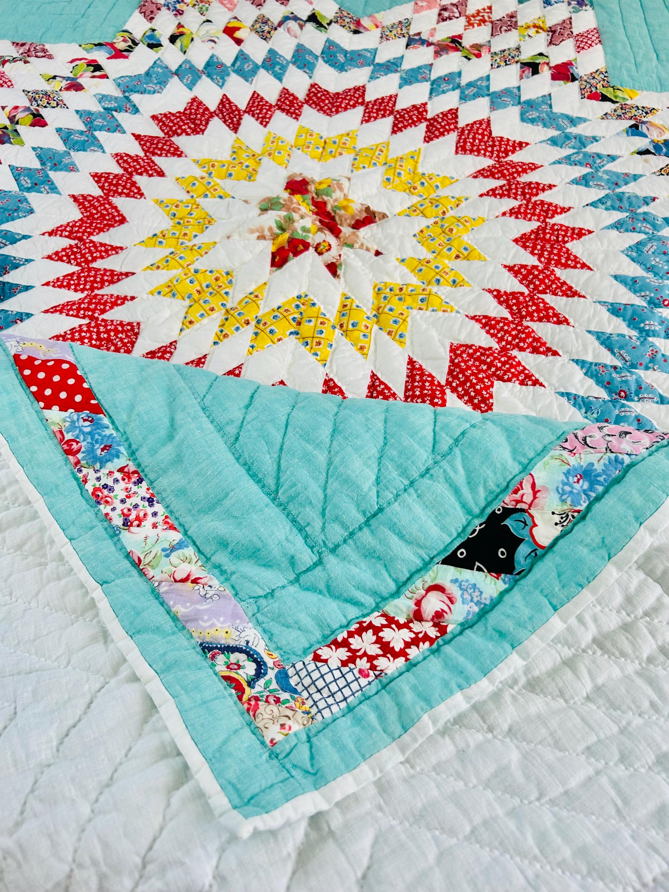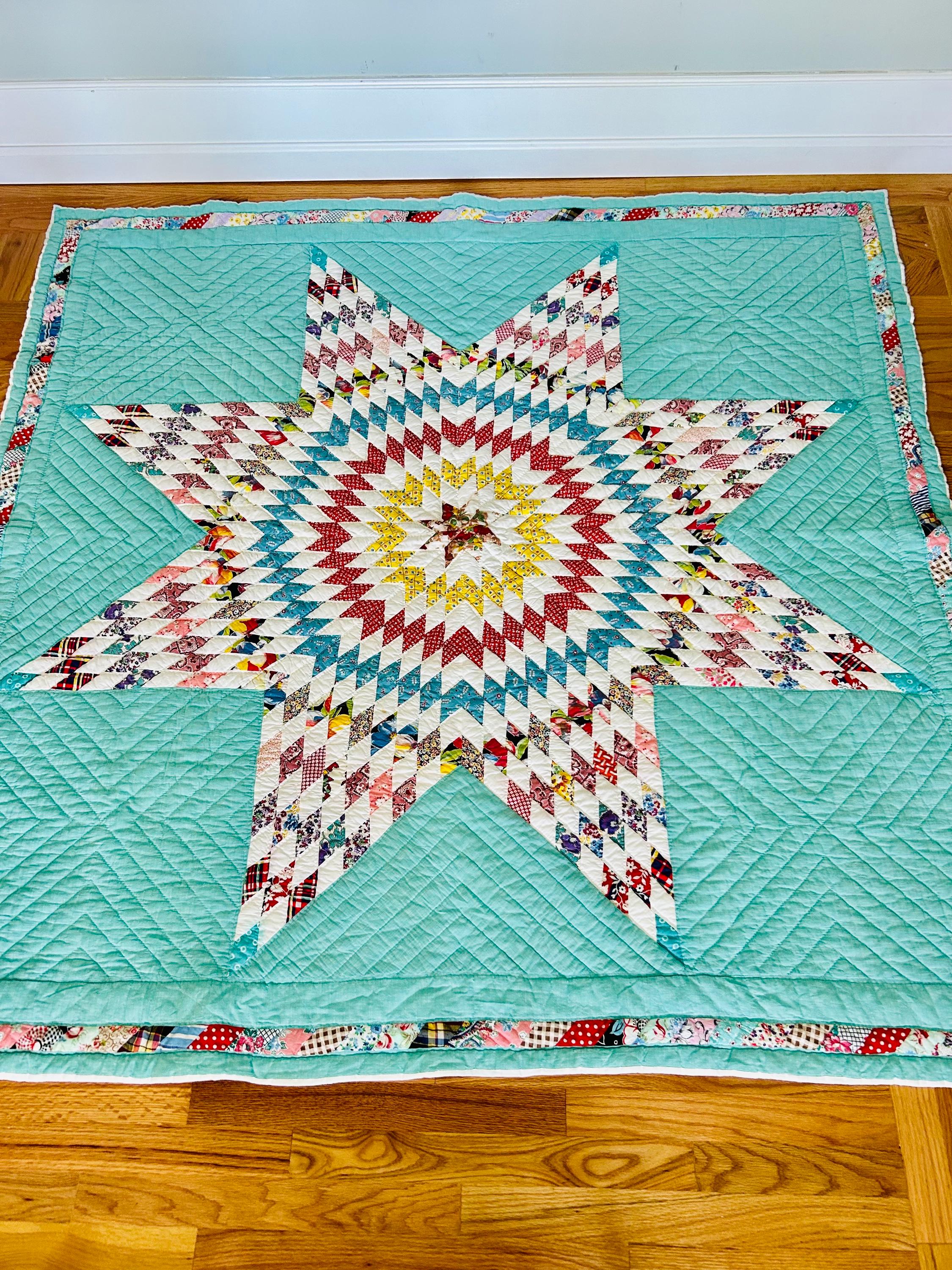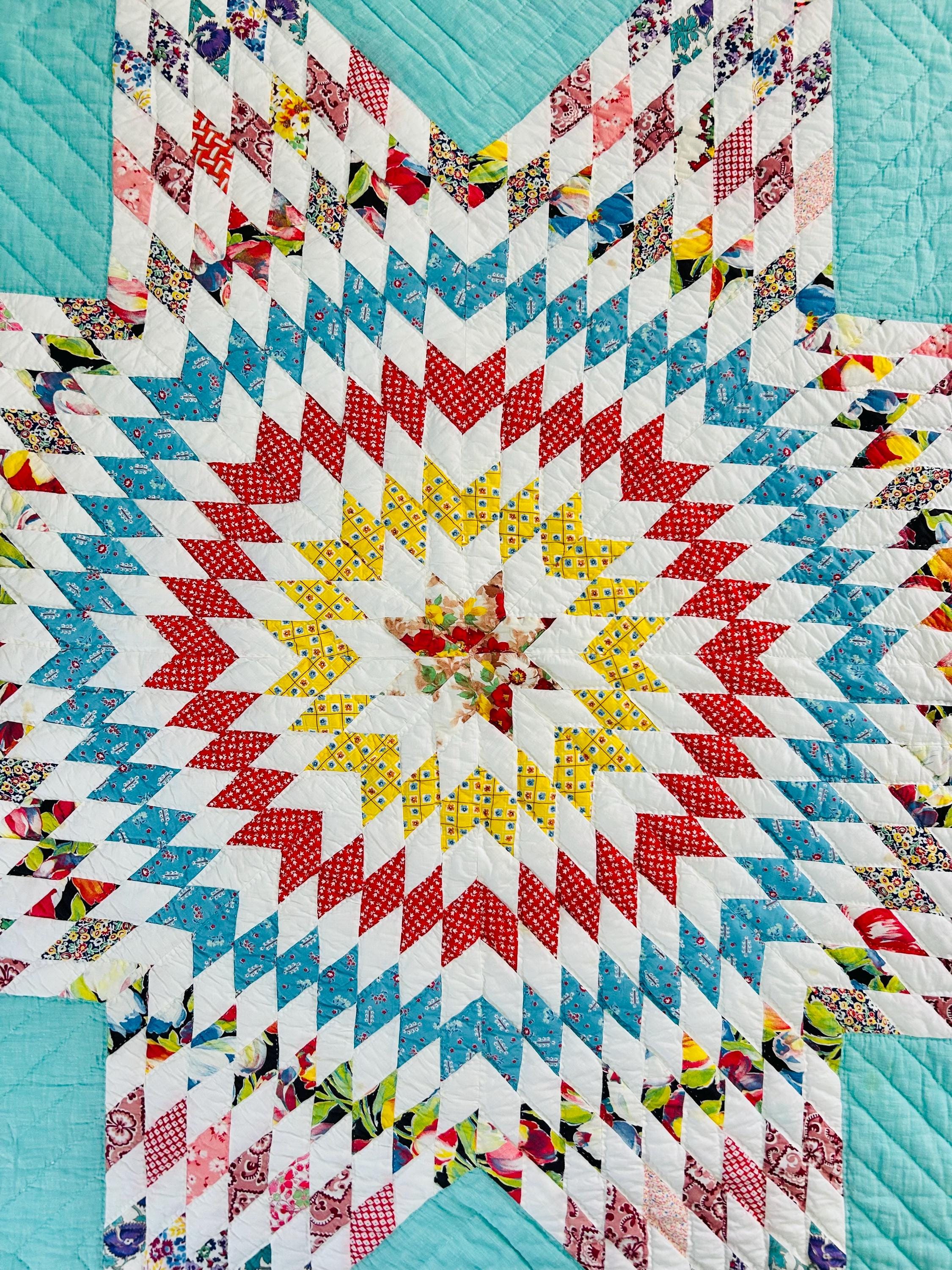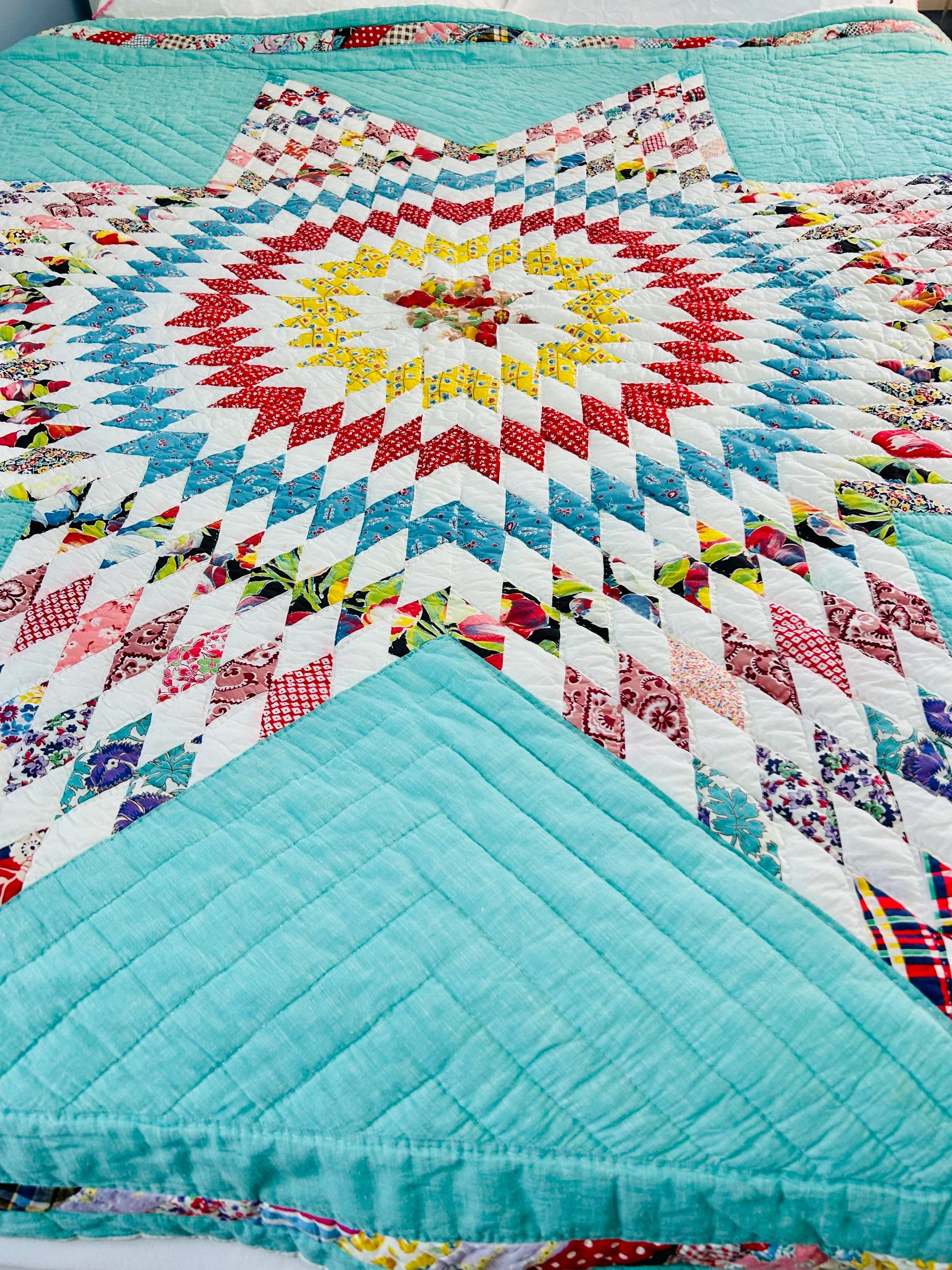 Details: * Pattern: Lone Star / Star of Bethlehem * Date: Circa 1950s–1960s * Size: 68” x 70” (nice throw / lap size) * Materials: Cotton fabrics; hand-pieced and hand-quilted * Batting: Lightweight cotton batting * Backing: White cotton backing * Quilting: Hand quilted in a geometric chevron pattern across the aqua field