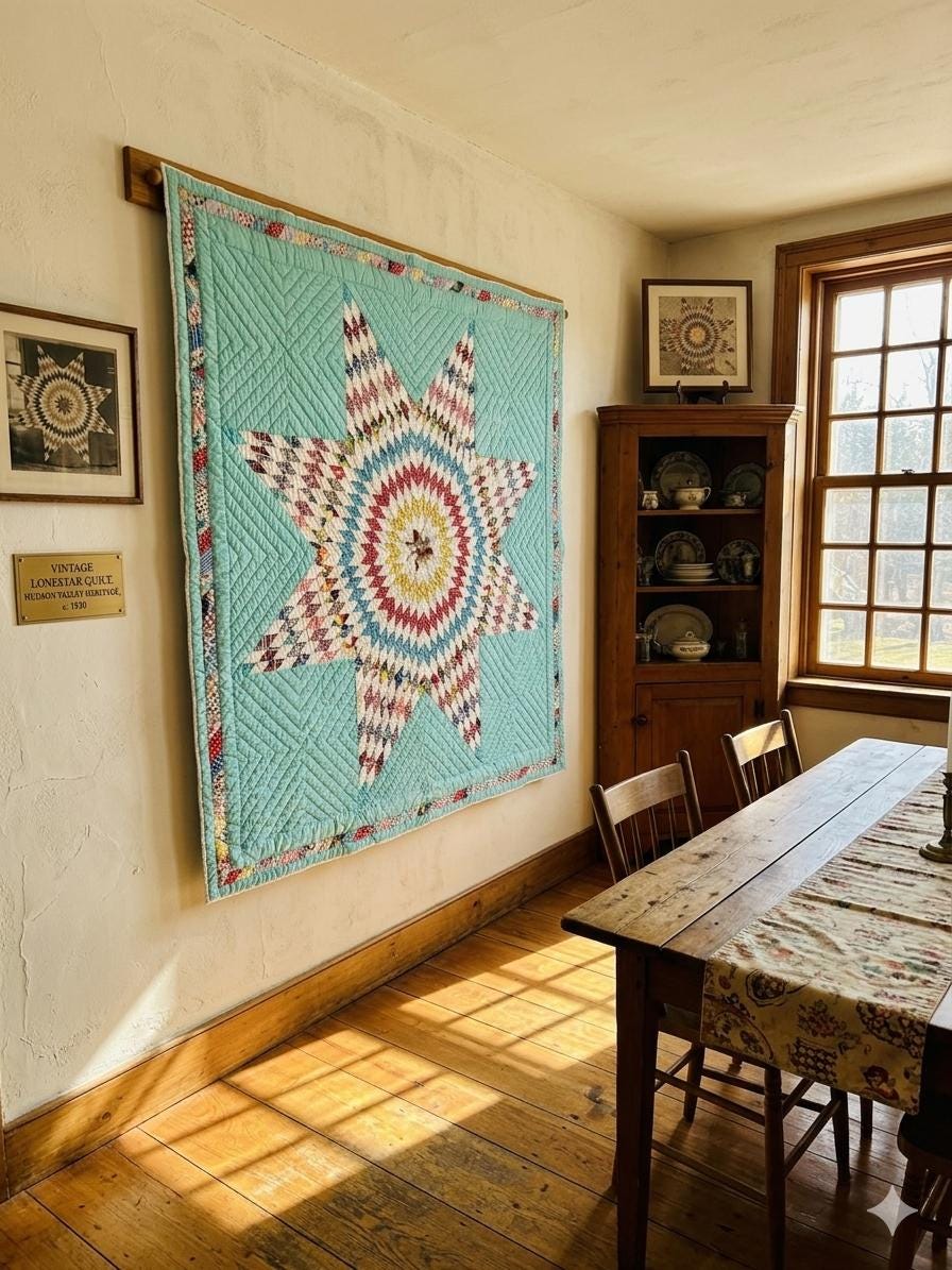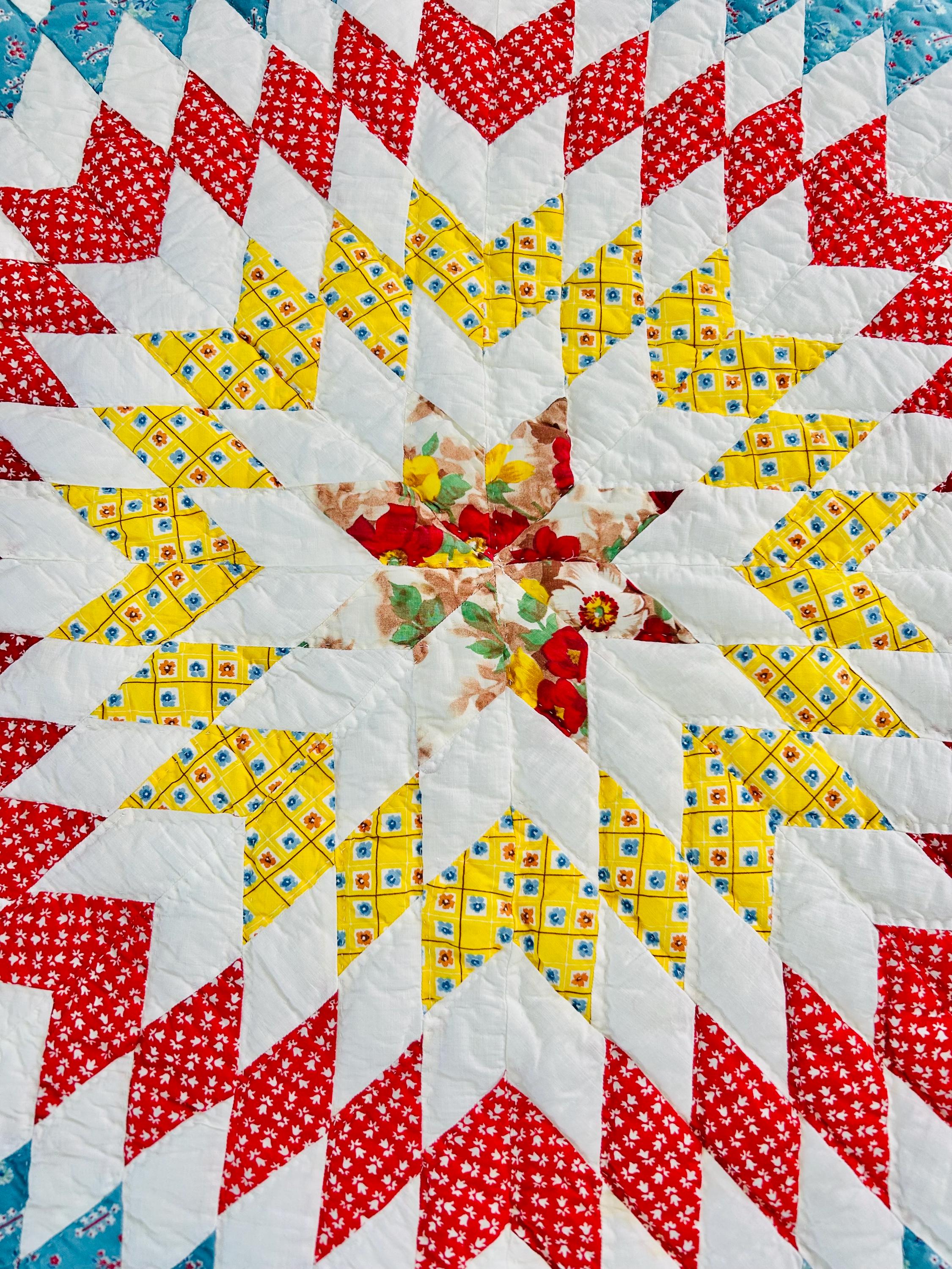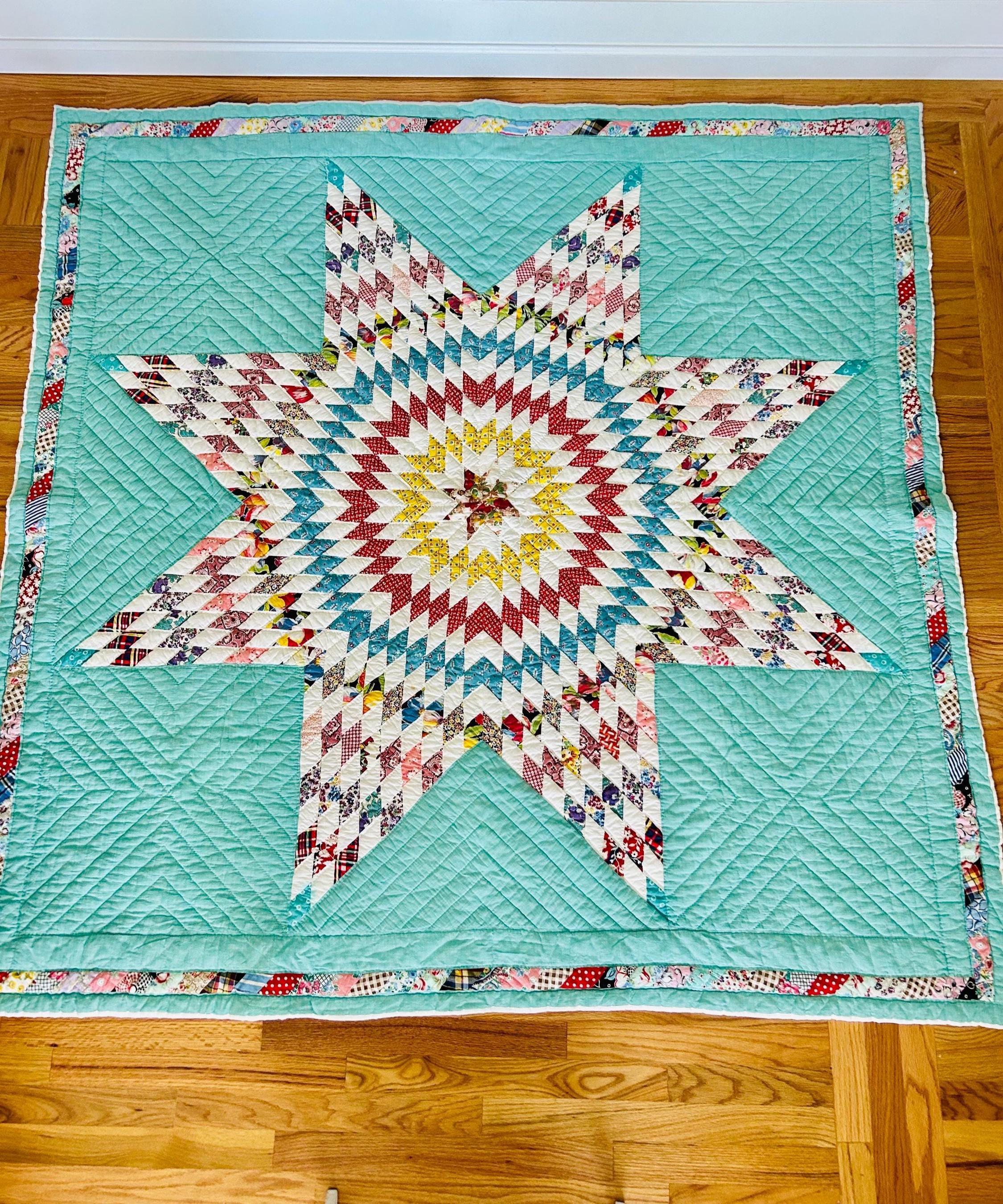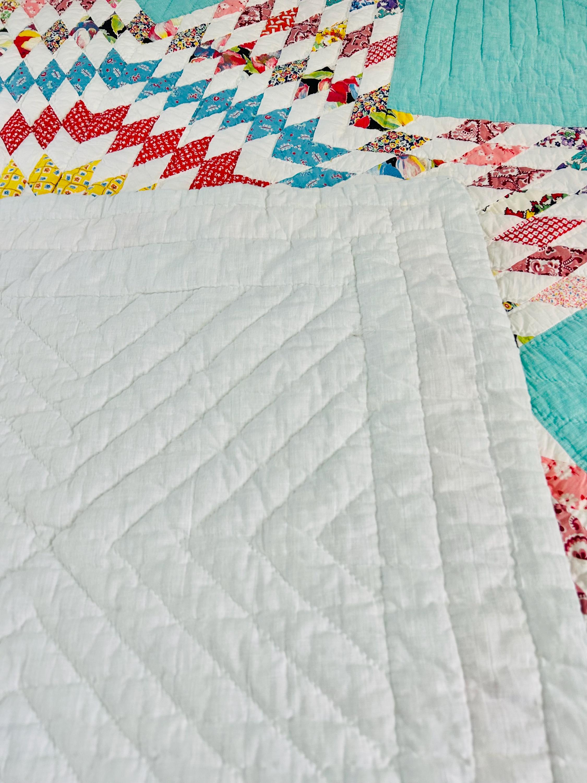 Details: * Pattern: Lone Star / Star of Bethlehem * Date: Circa 1950s–1960s * Size: 68” x 70” (nice throw / lap size) * Materials: Cotton fabrics; hand-pieced and hand-quilted * Batting: Lightweight cotton batting * Backing: White cotton backing * Quilting: Hand quilted in a geometric chevron pattern across the aqua field