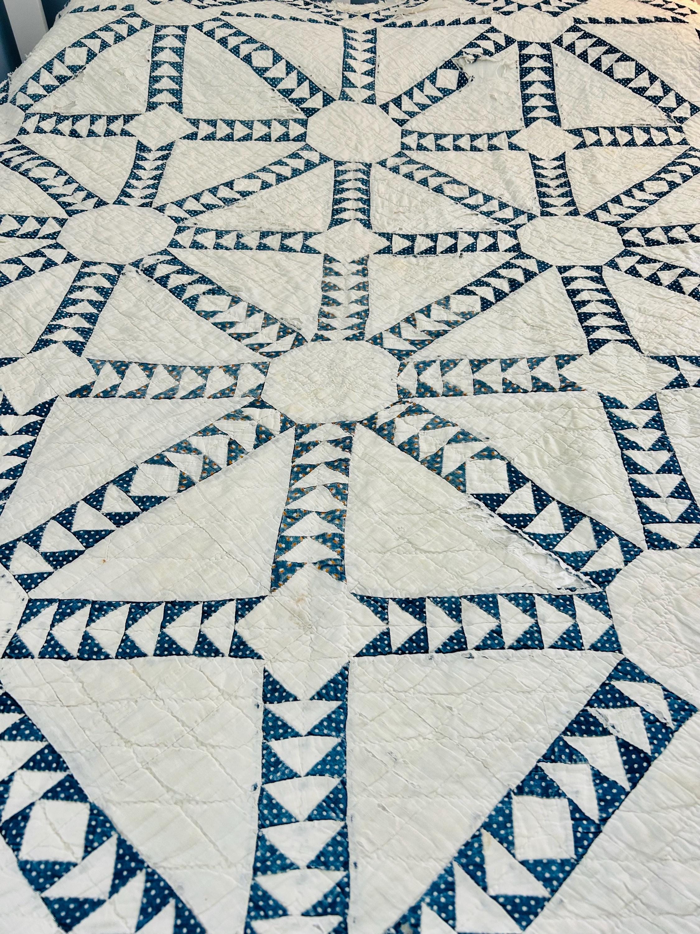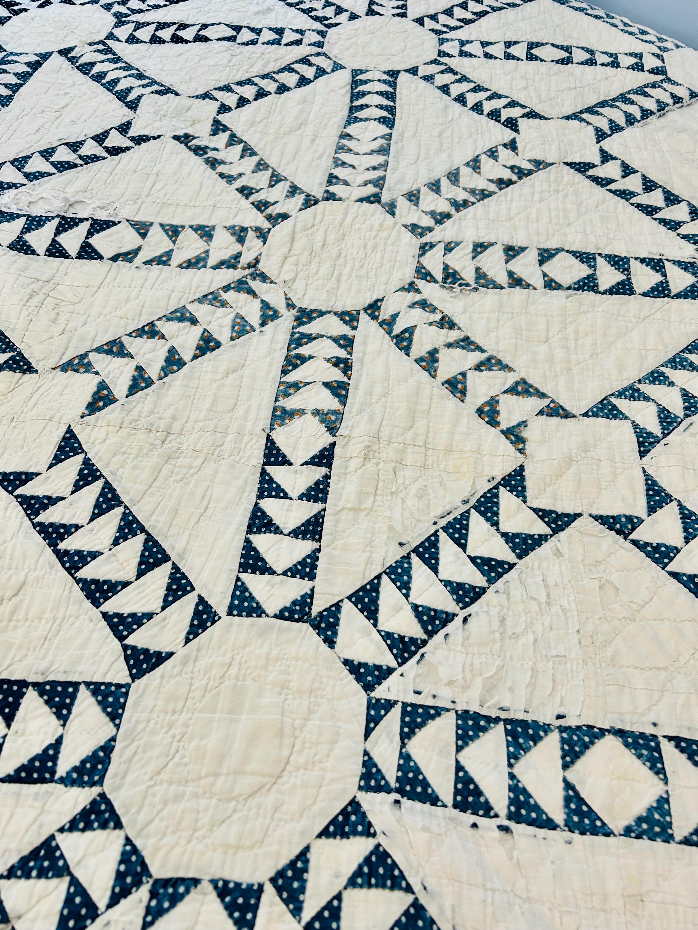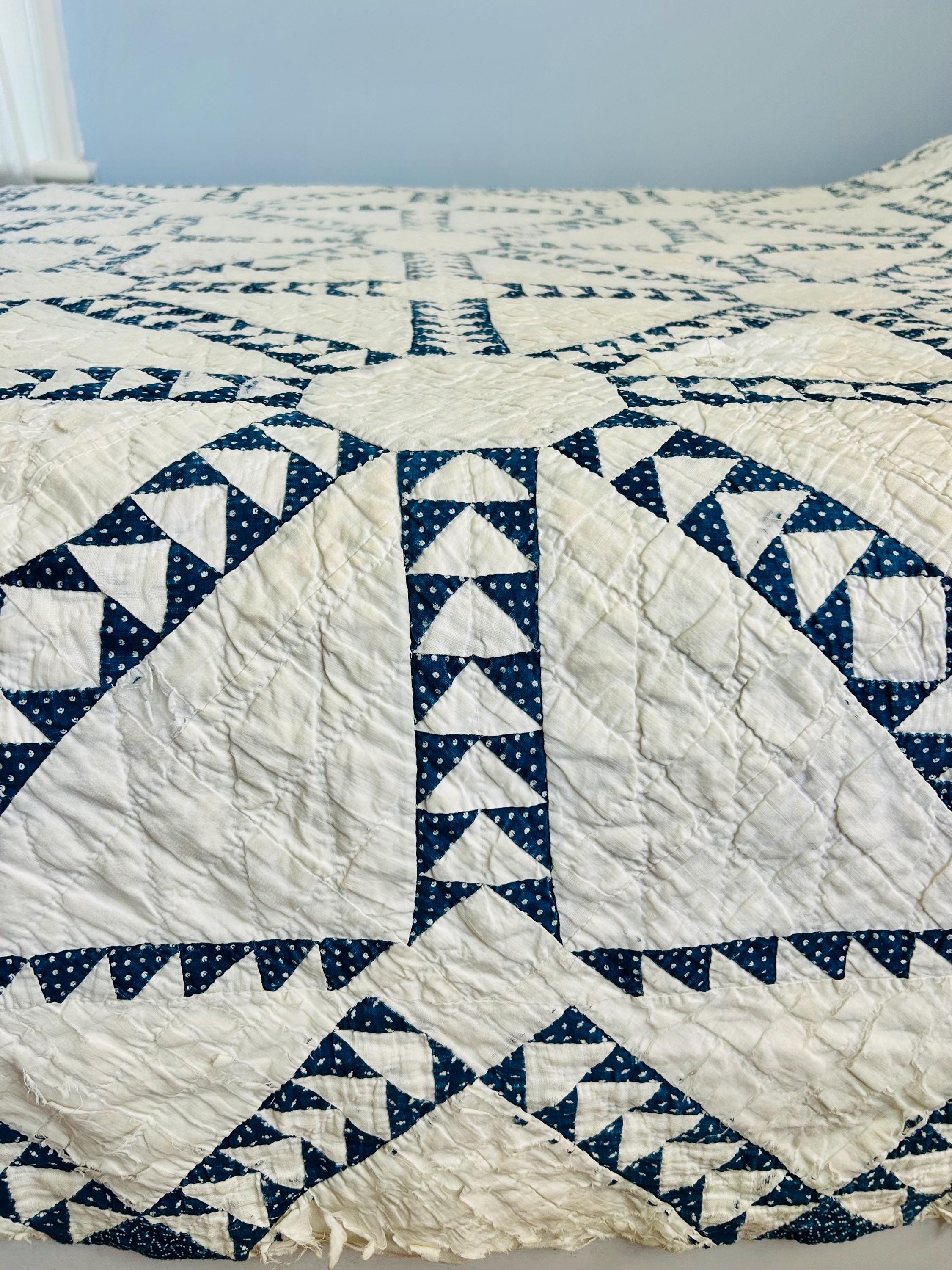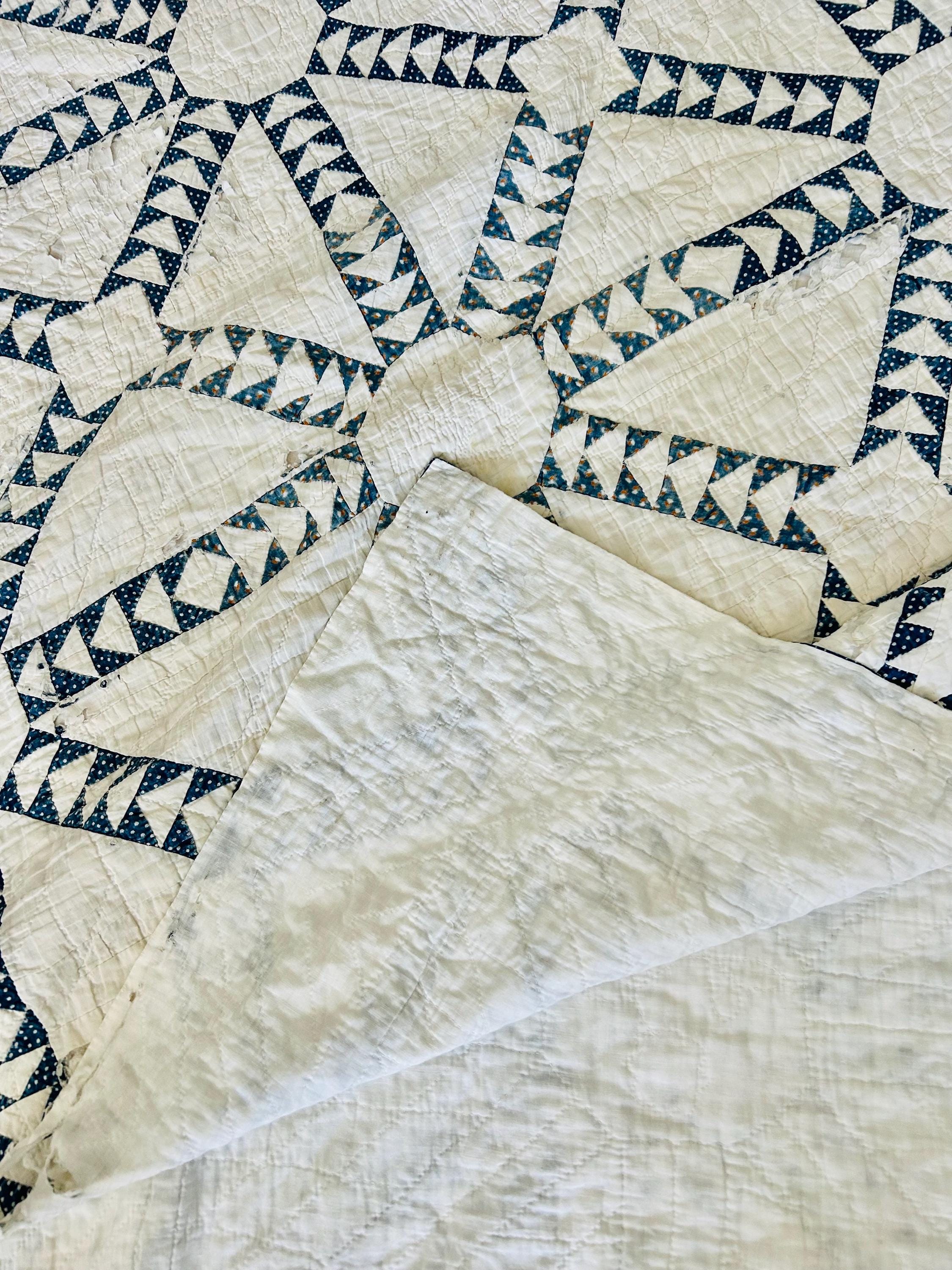 This beautiful old blue-and-white Goose in the Pond Quilt has a wonderfully graphic early 20th century look, with rows of tiny pieced geese forming bold geometric star-like blocks across a soft white ground. Even with its timeworn condition, it has tremendous visual charm and would be lovely for display, styling, photography, farmhouse décor, or creative reuse.