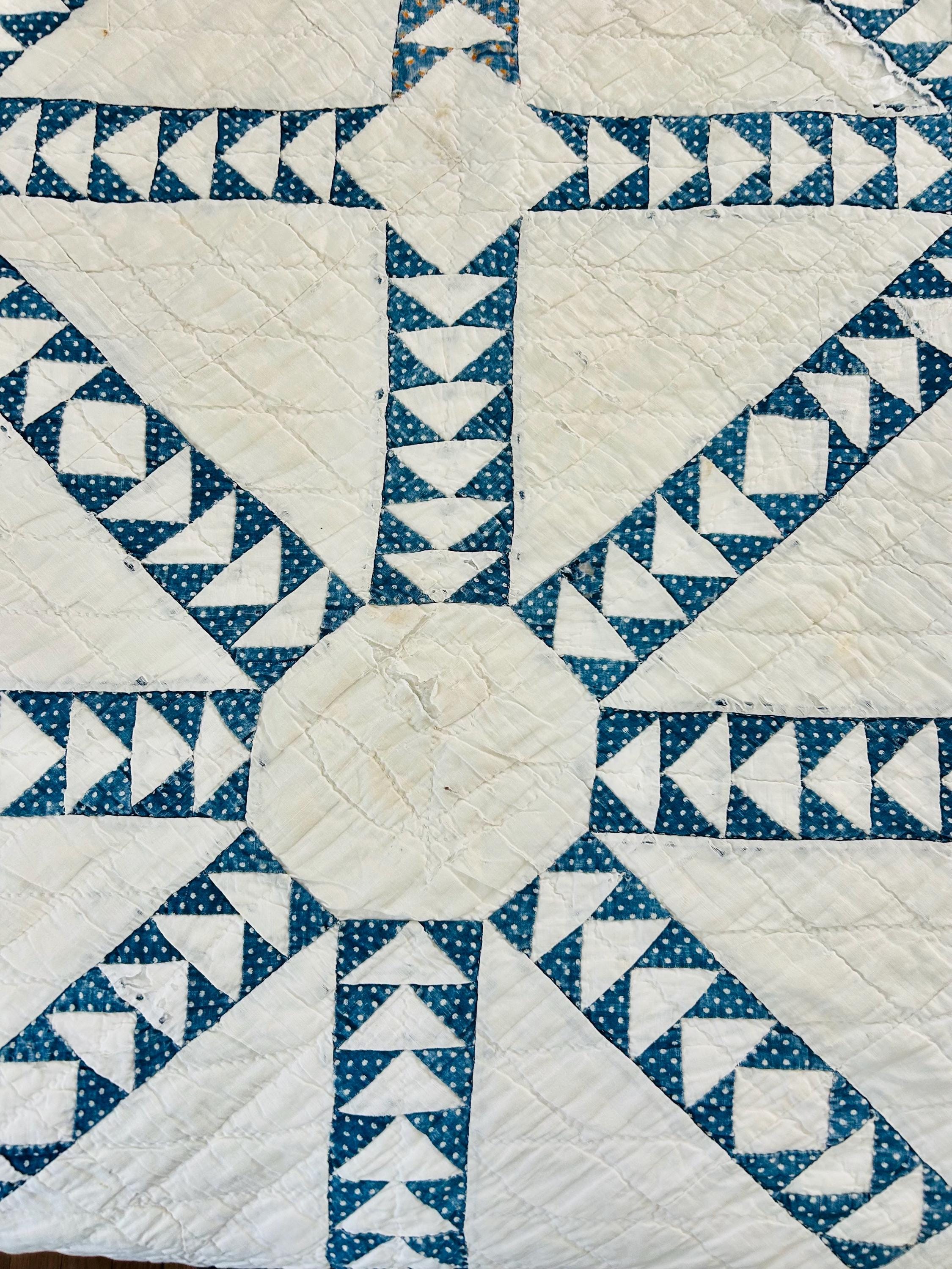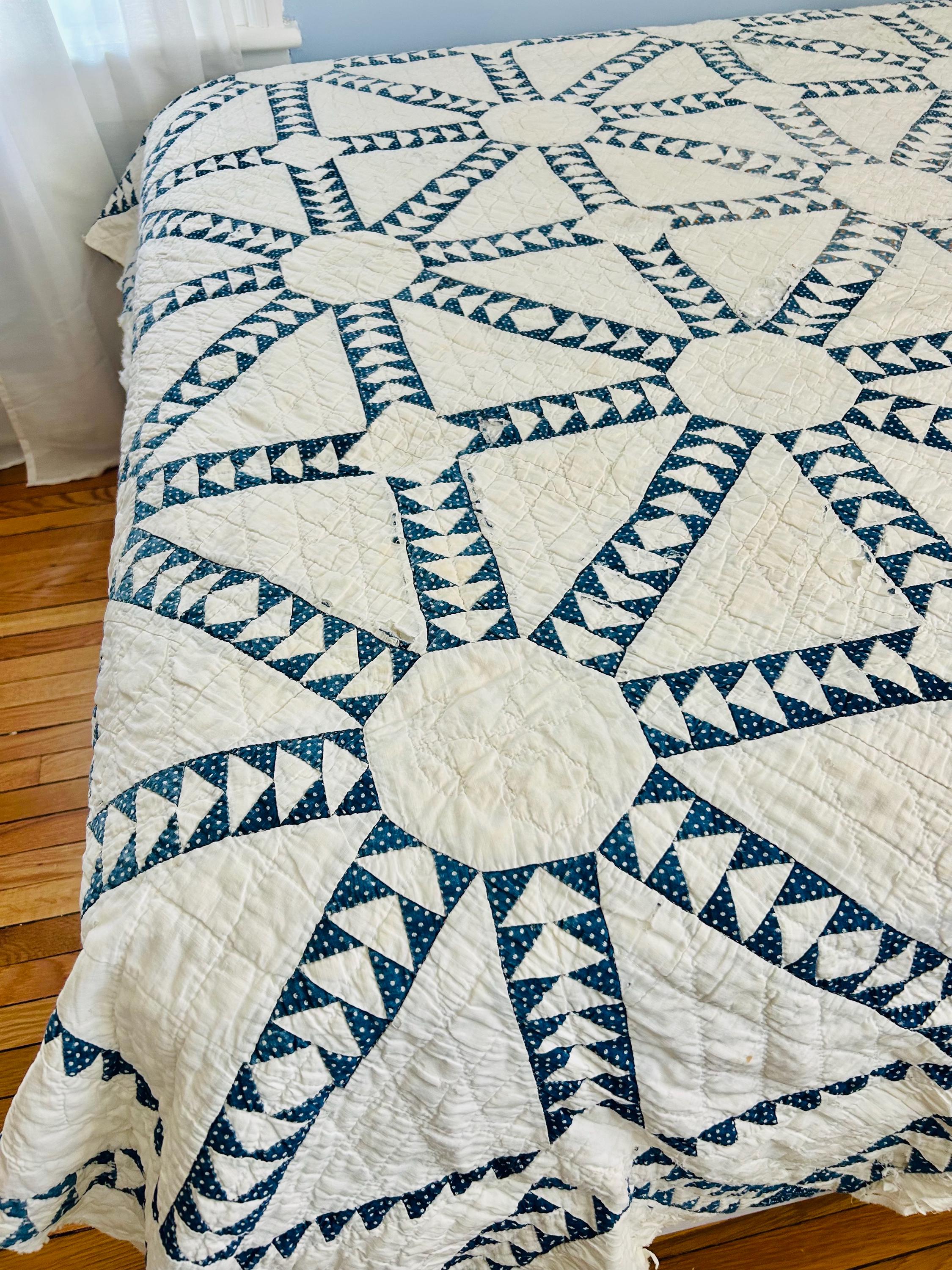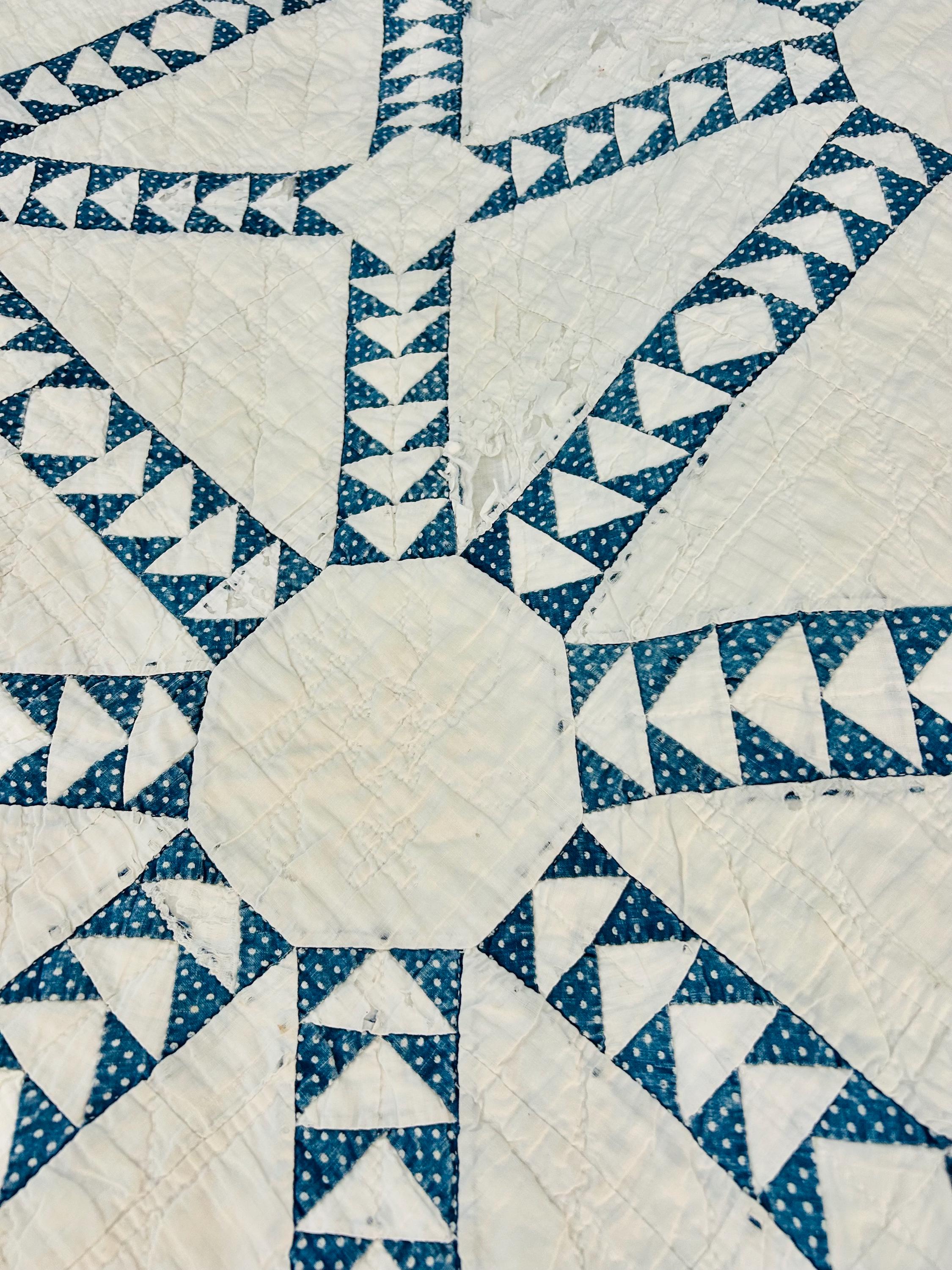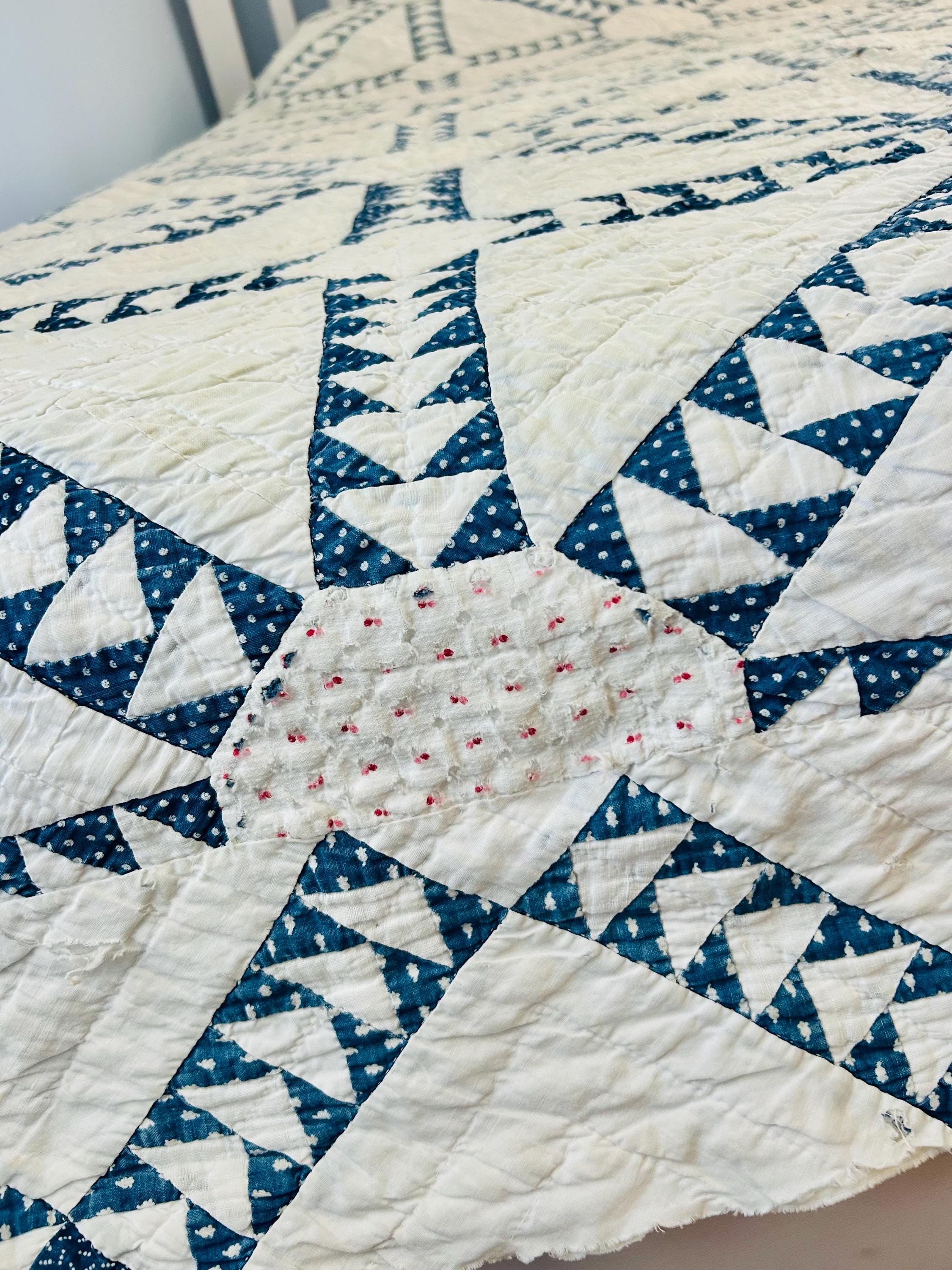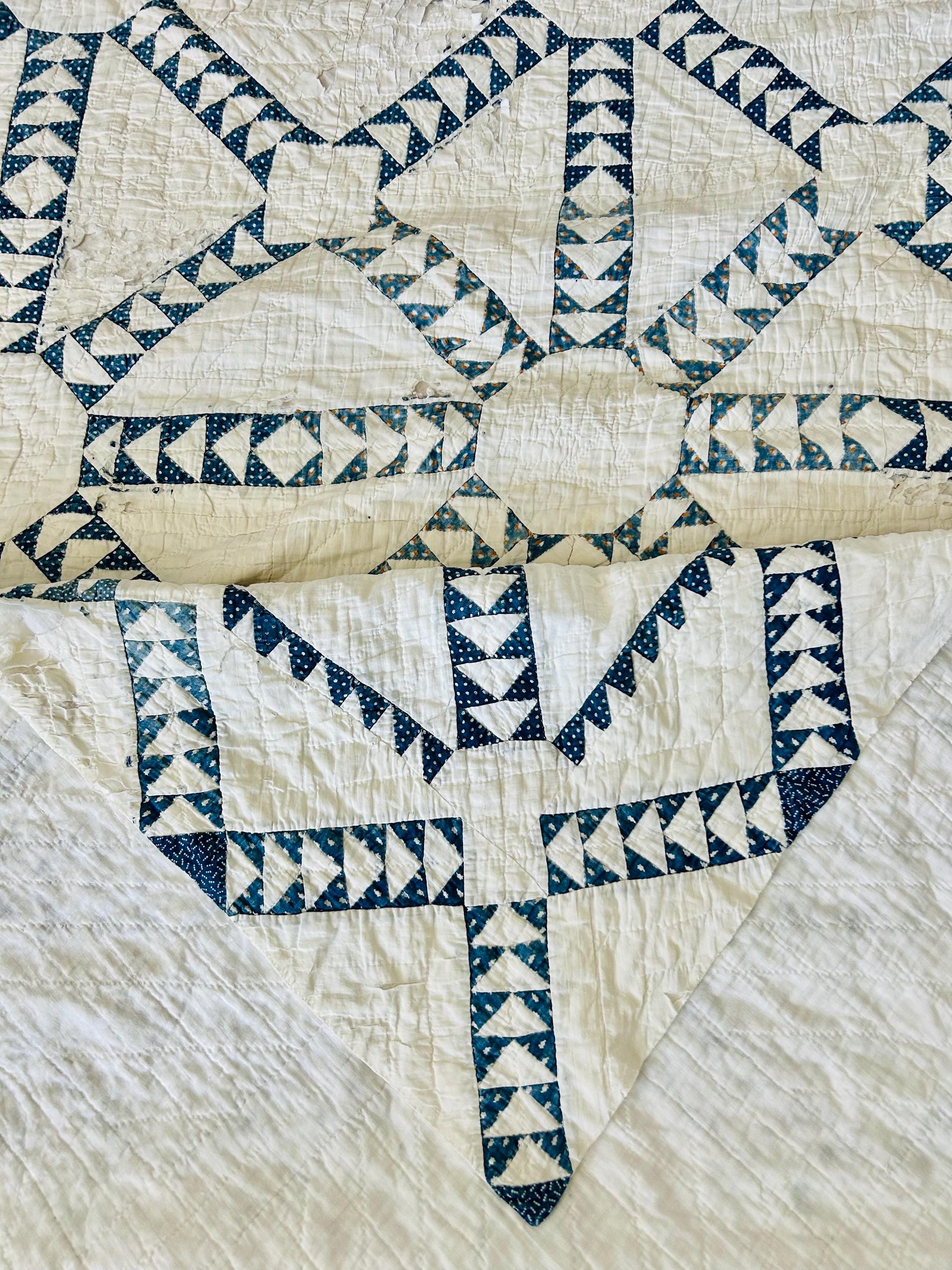 This beautiful old blue-and-white Goose in the Pond Quilt has a wonderfully graphic early 20th century look, with rows of tiny pieced geese forming bold geometric star-like blocks across a soft white ground. Even with its timeworn condition, it has tremendous visual charm and would be lovely for display, styling, photography, farmhouse décor, or creative reuse.