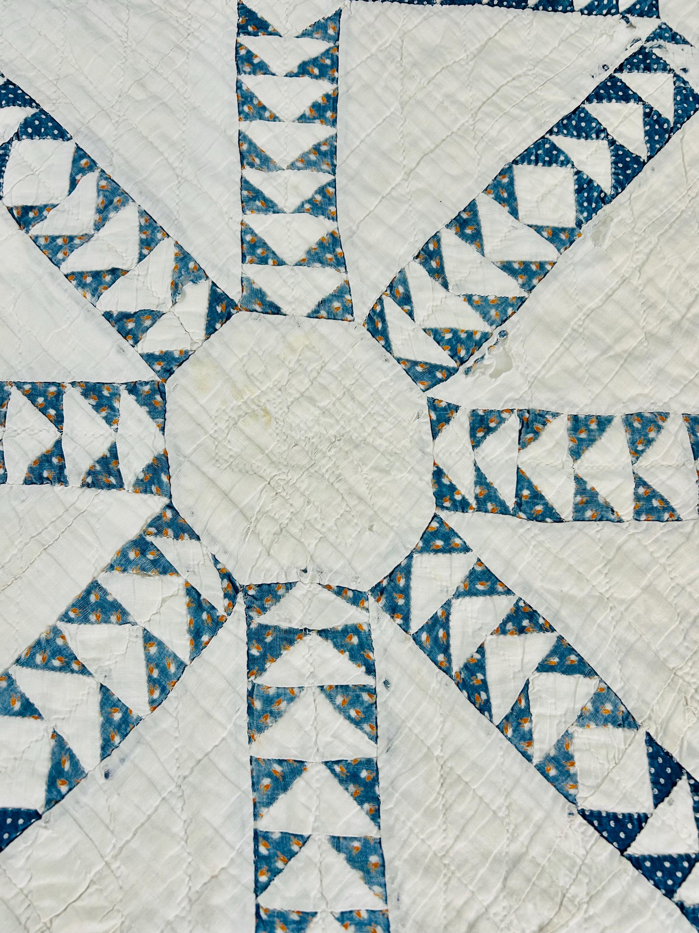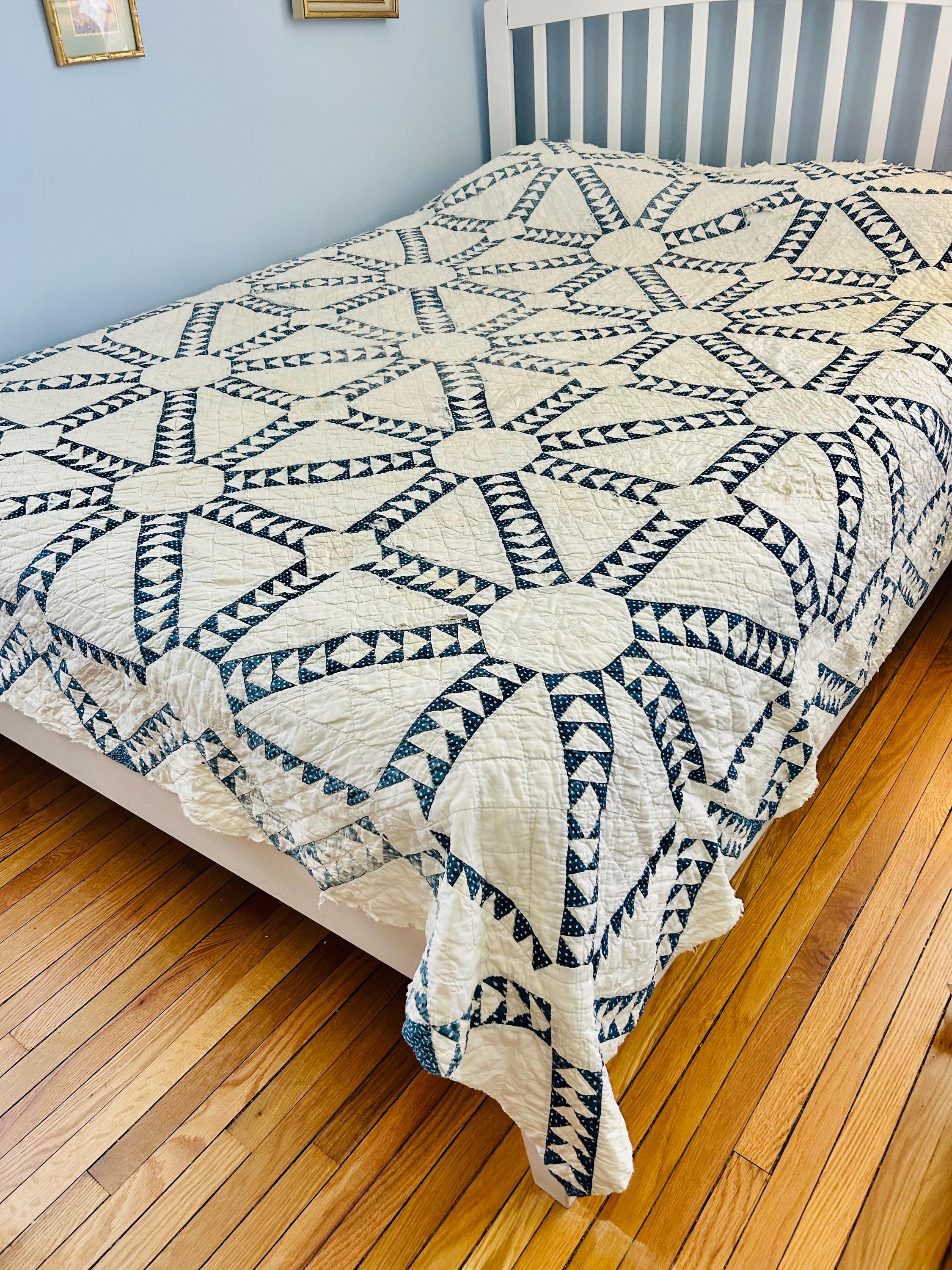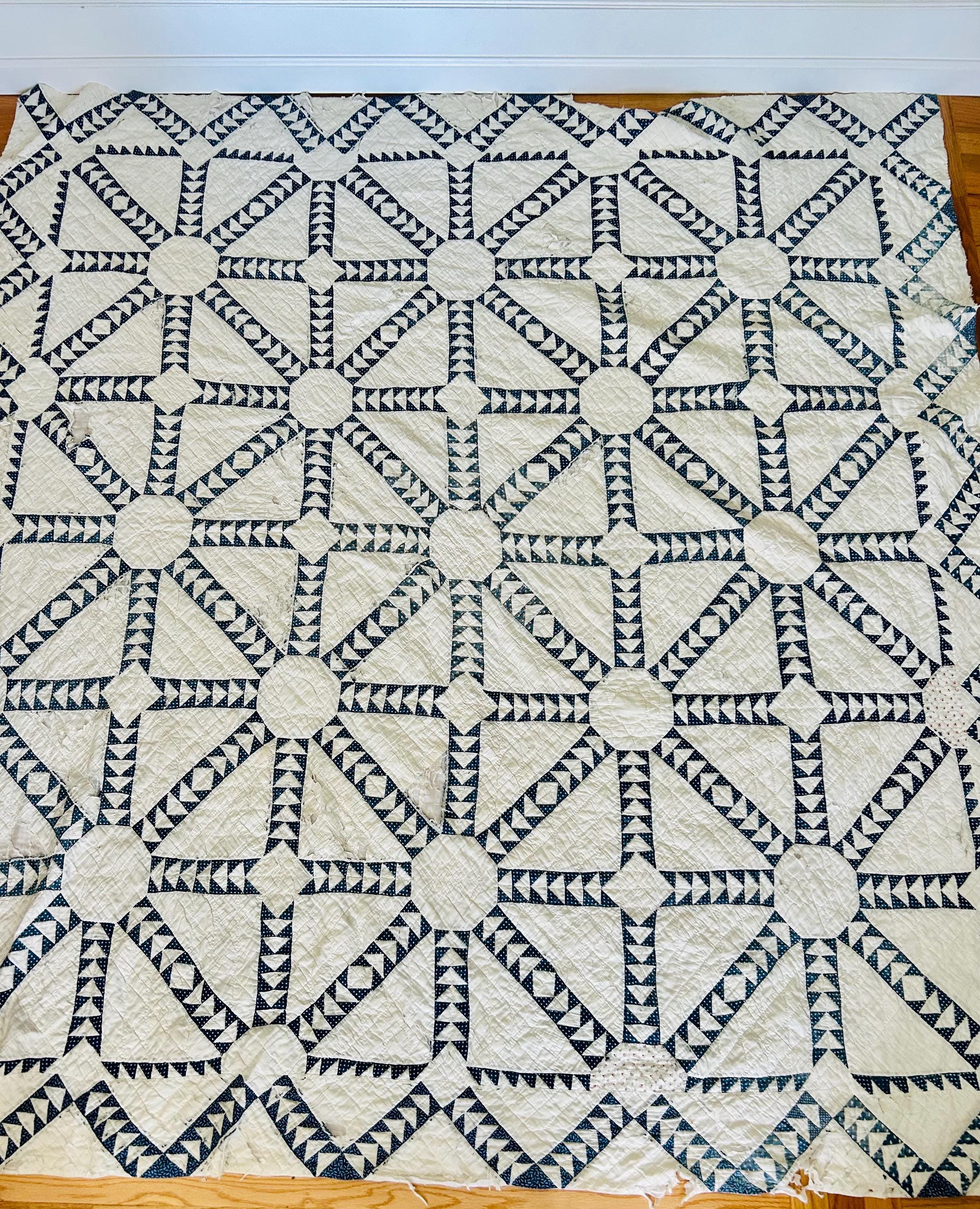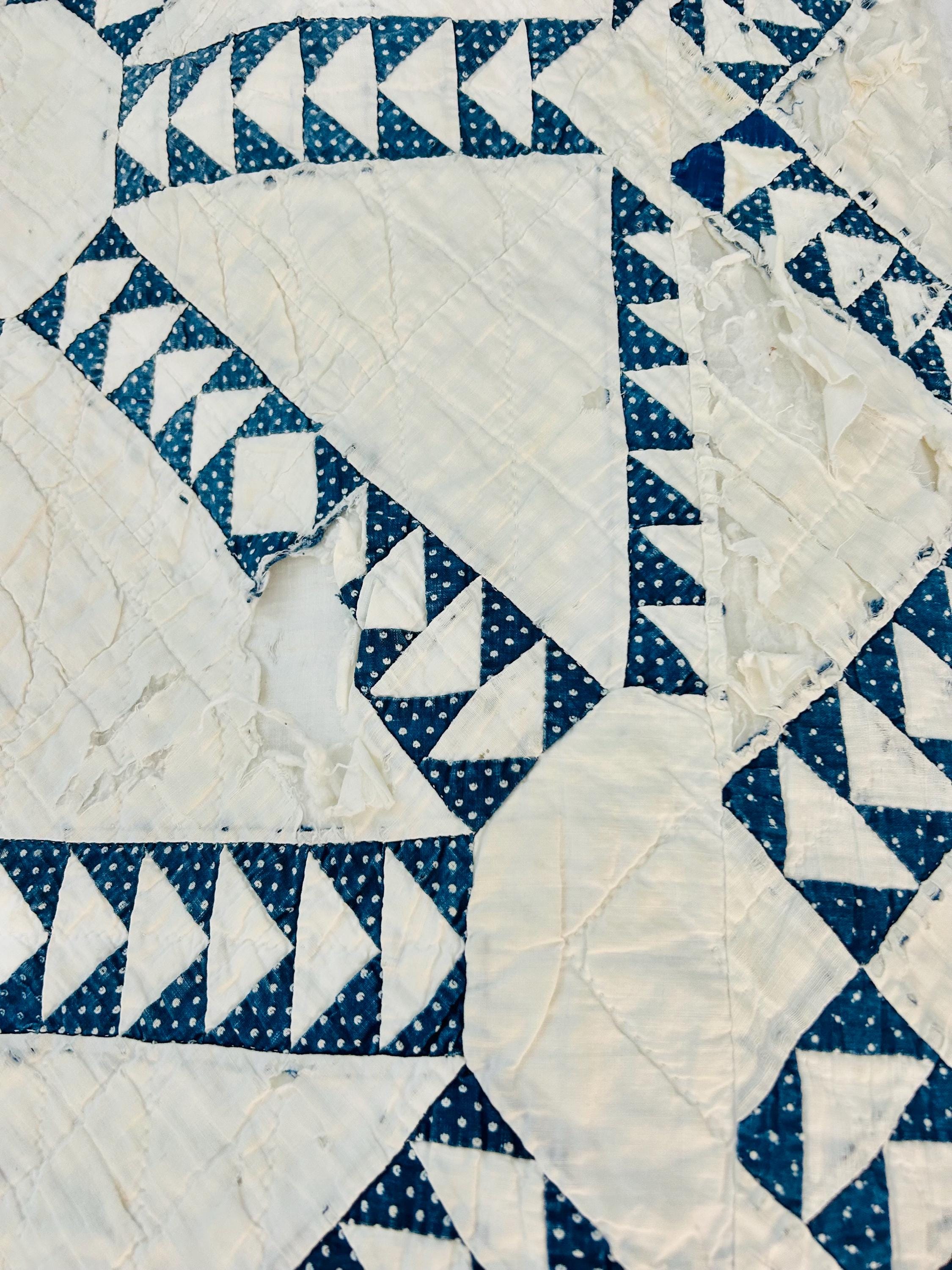 This beautiful old blue-and-white Goose in the Pond Quilt has a wonderfully graphic early 20th century look, with rows of tiny pieced geese forming bold geometric star-like blocks across a soft white ground. Even with its timeworn condition, it has tremendous visual charm and would be lovely for display, styling, photography, farmhouse décor, or creative reuse.