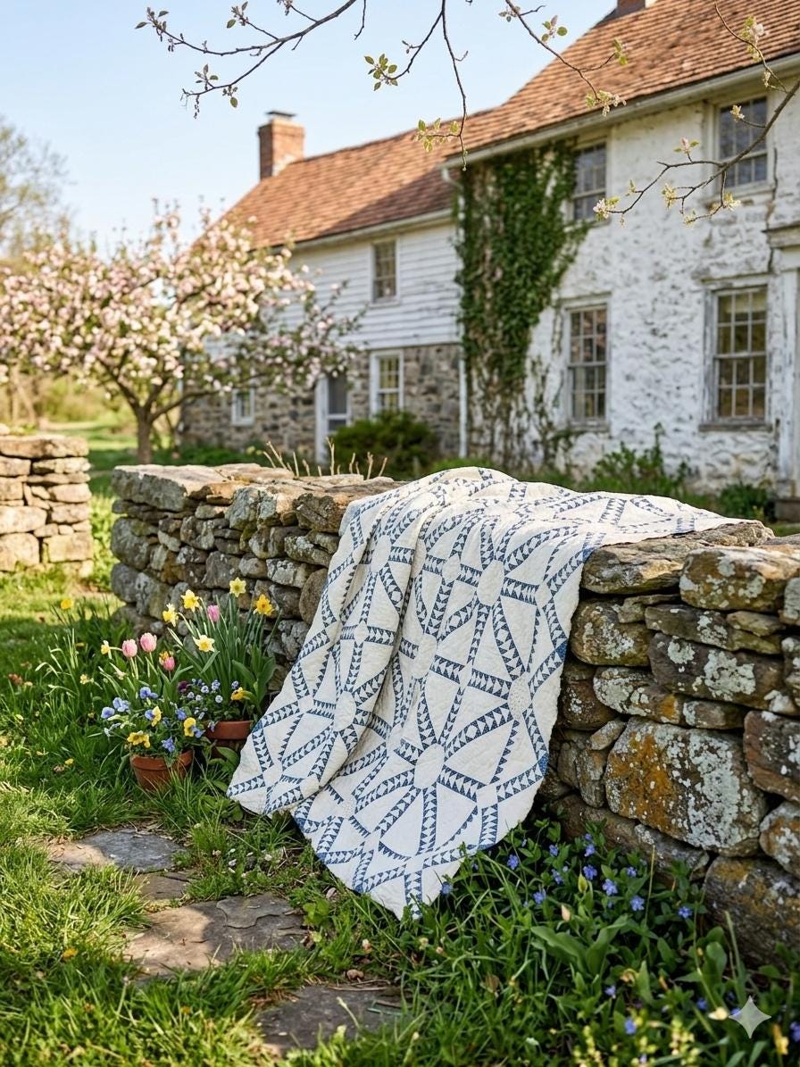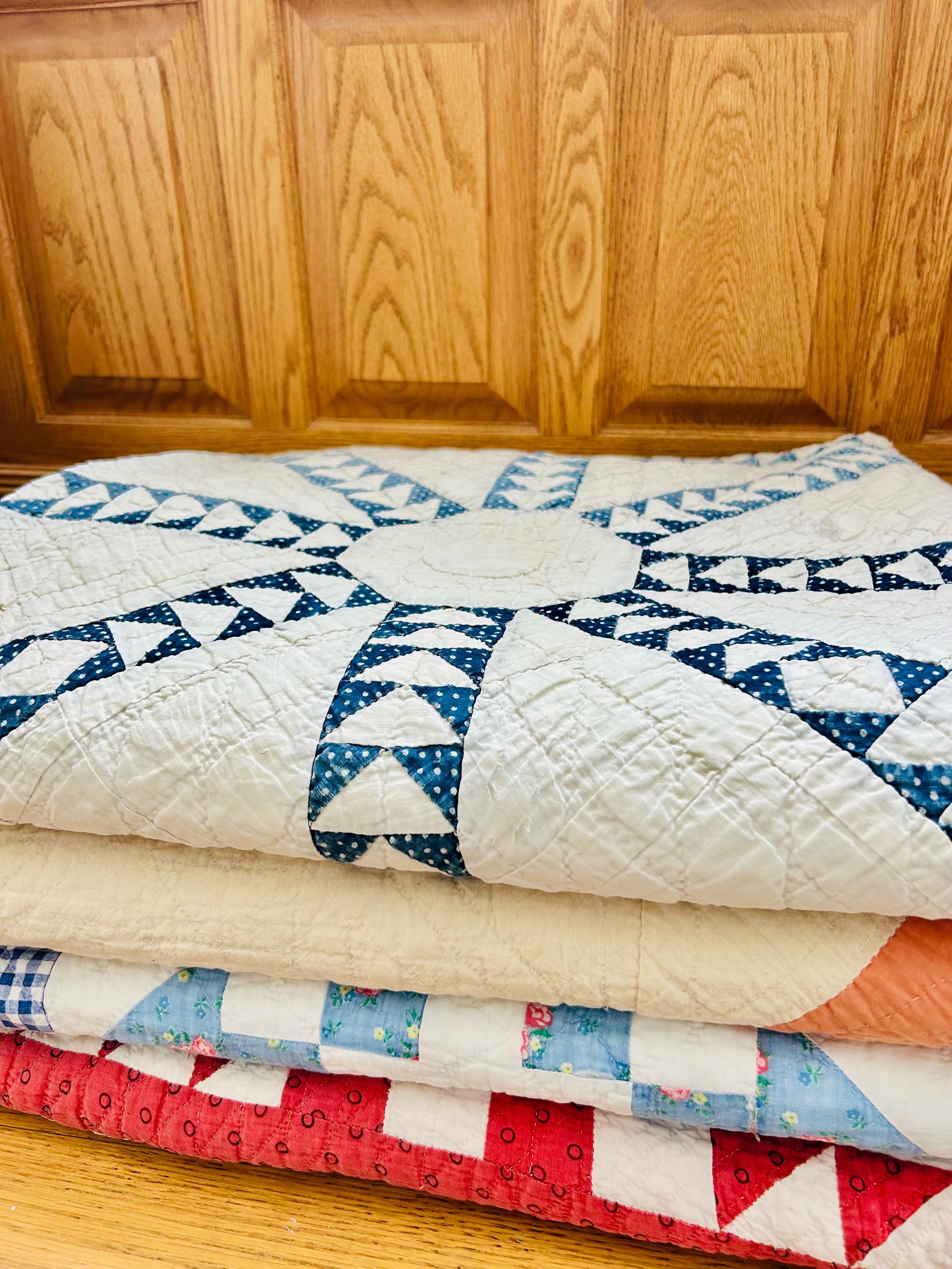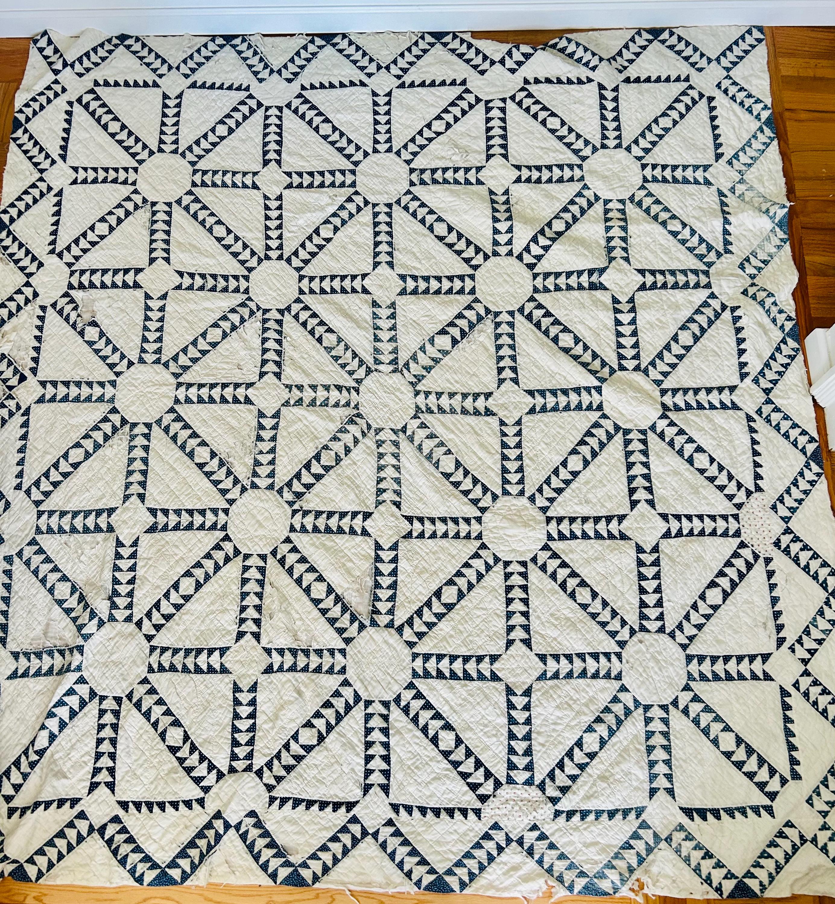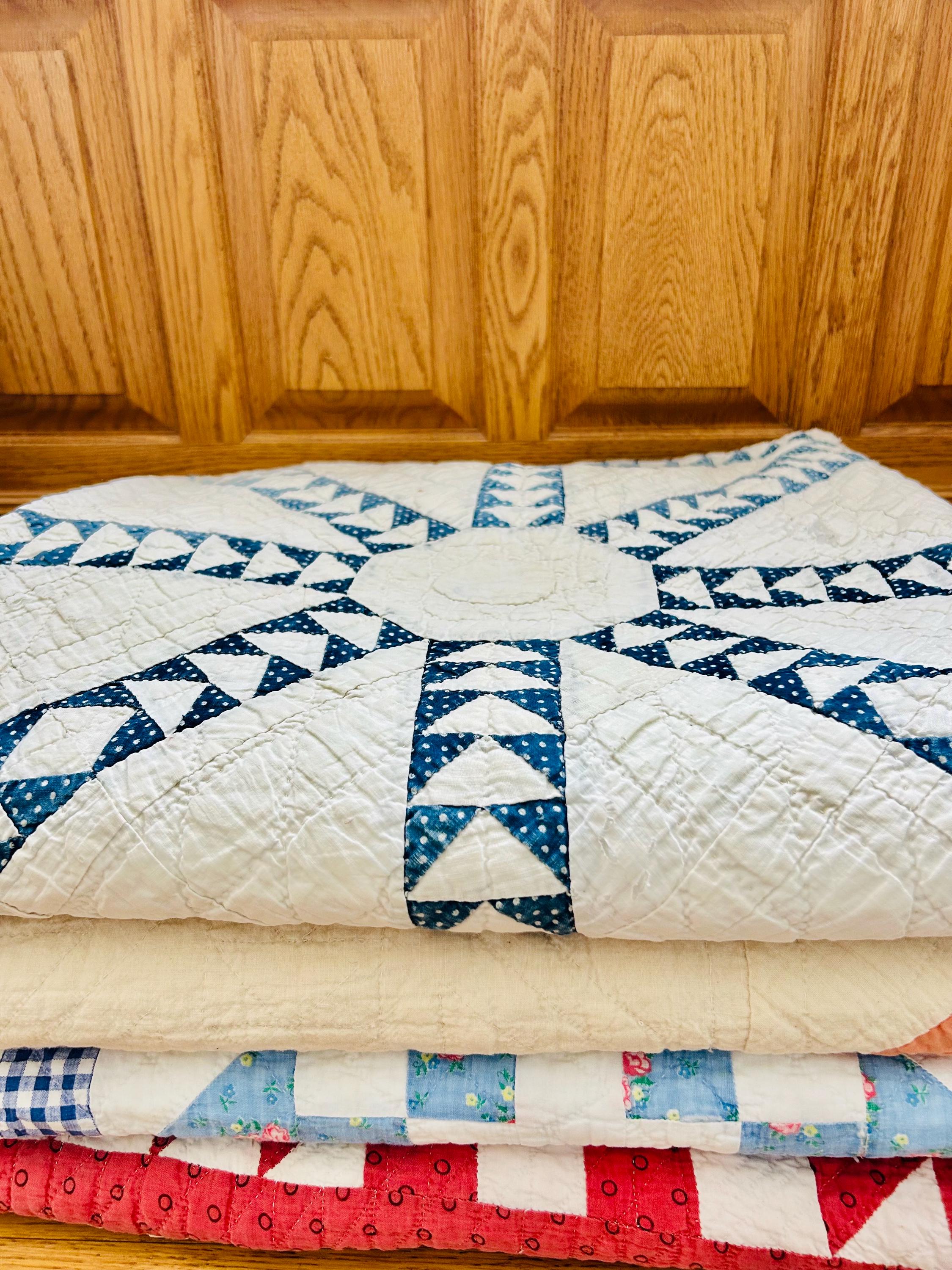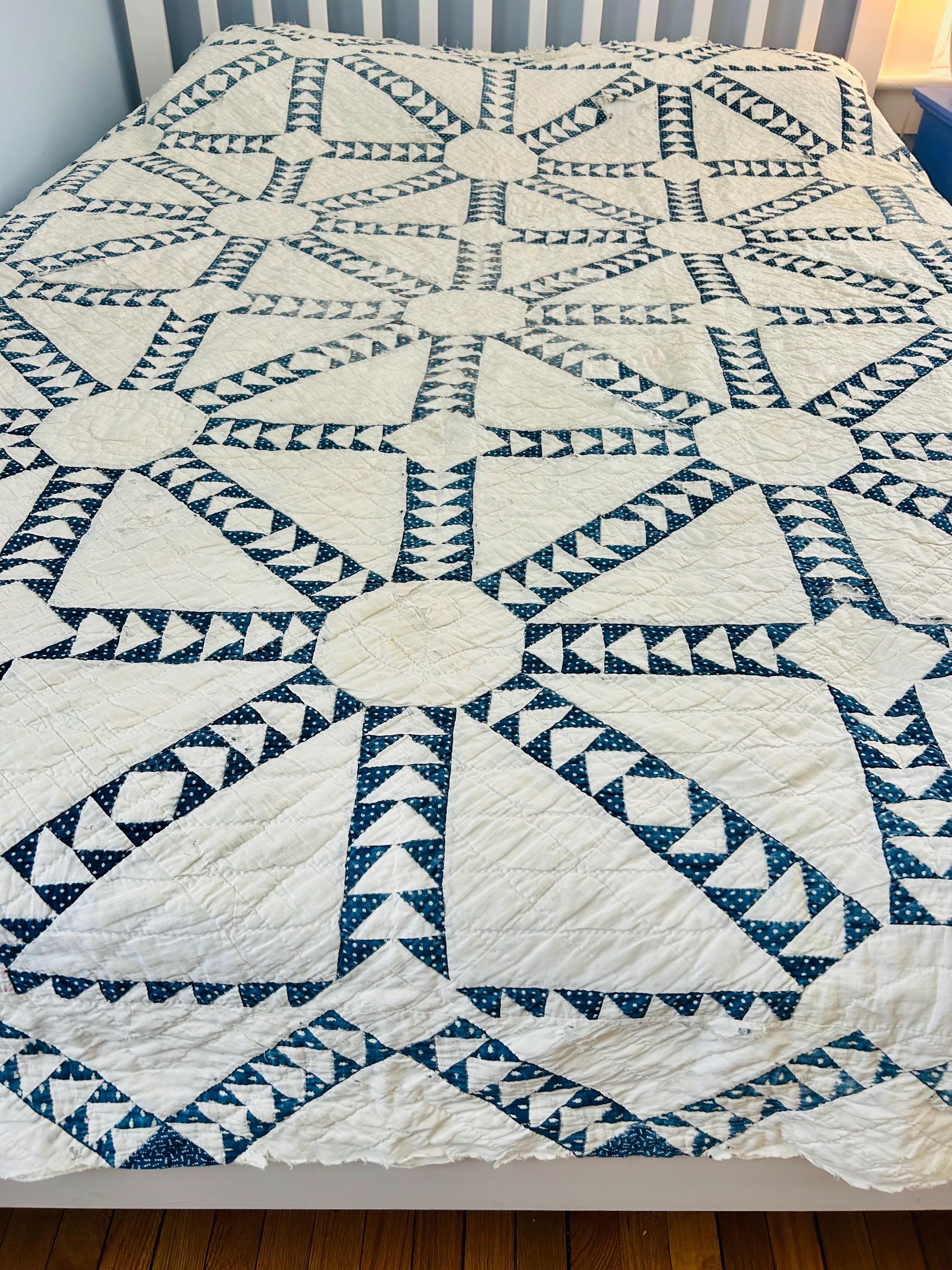 This beautiful old blue-and-white Goose in the Pond Quilt has a wonderfully graphic early 20th century look, with rows of tiny pieced geese forming bold geometric star-like blocks across a soft white ground. Even with its timeworn condition, it has tremendous visual charm and would be lovely for display, styling, photography, farmhouse décor, or creative reuse.