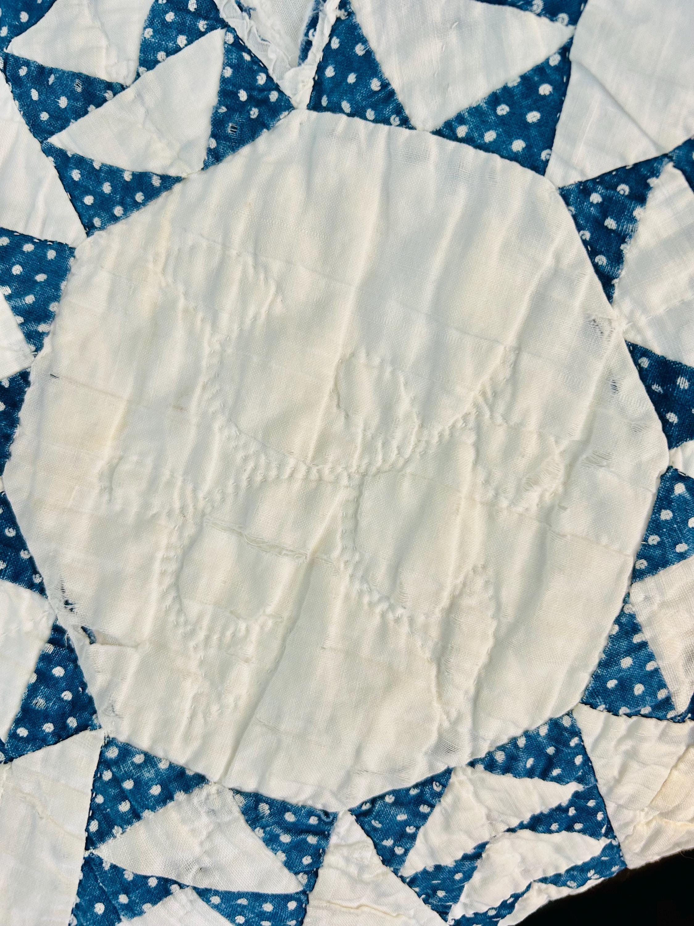 Dating to approximately 1900–1920, this quilt is hand pieced and hand quilted, with indigo/navy and blue printed cottons set against white cotton. The hand-quilting is in outlines of the patchwork and in diagonal grids.