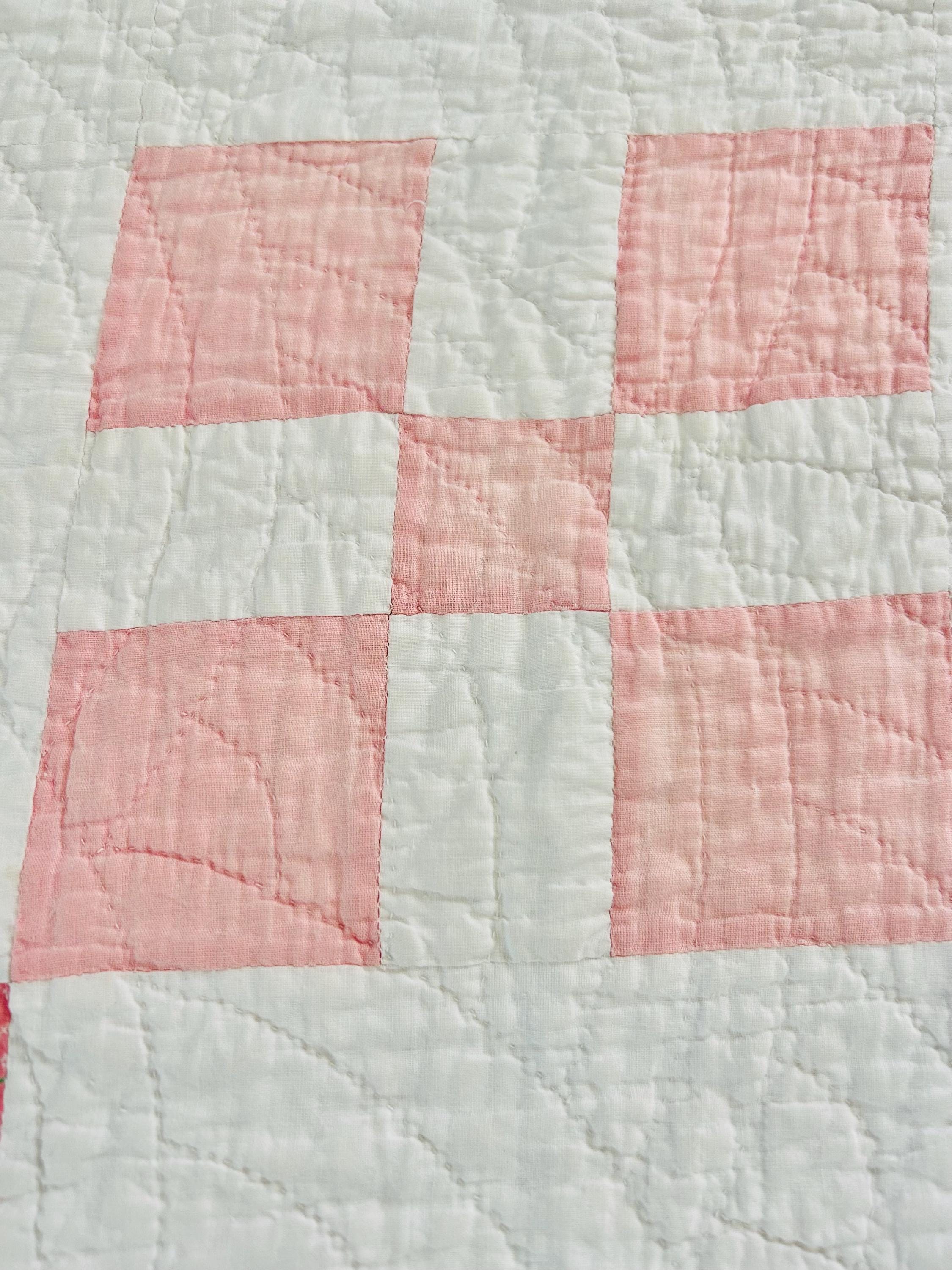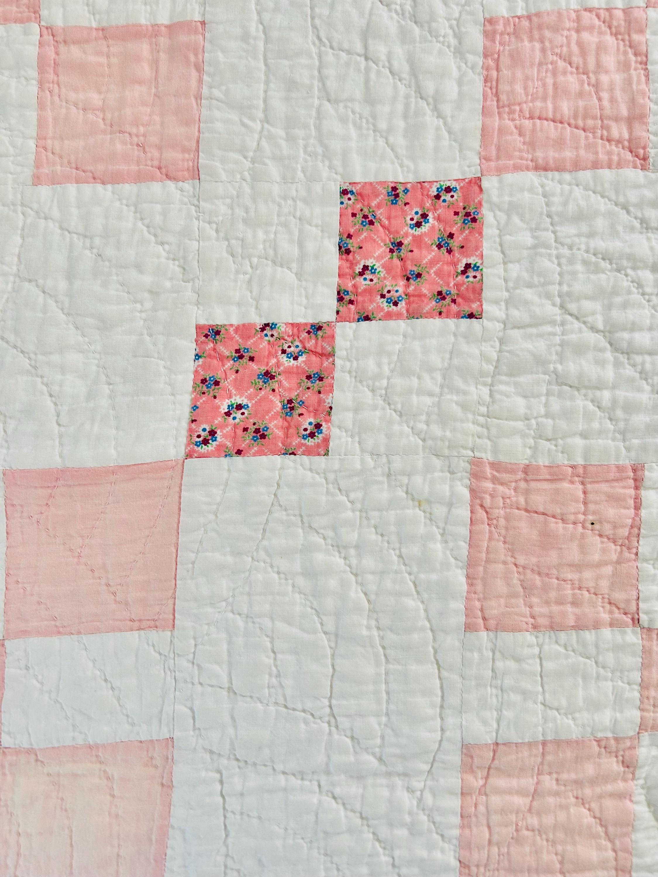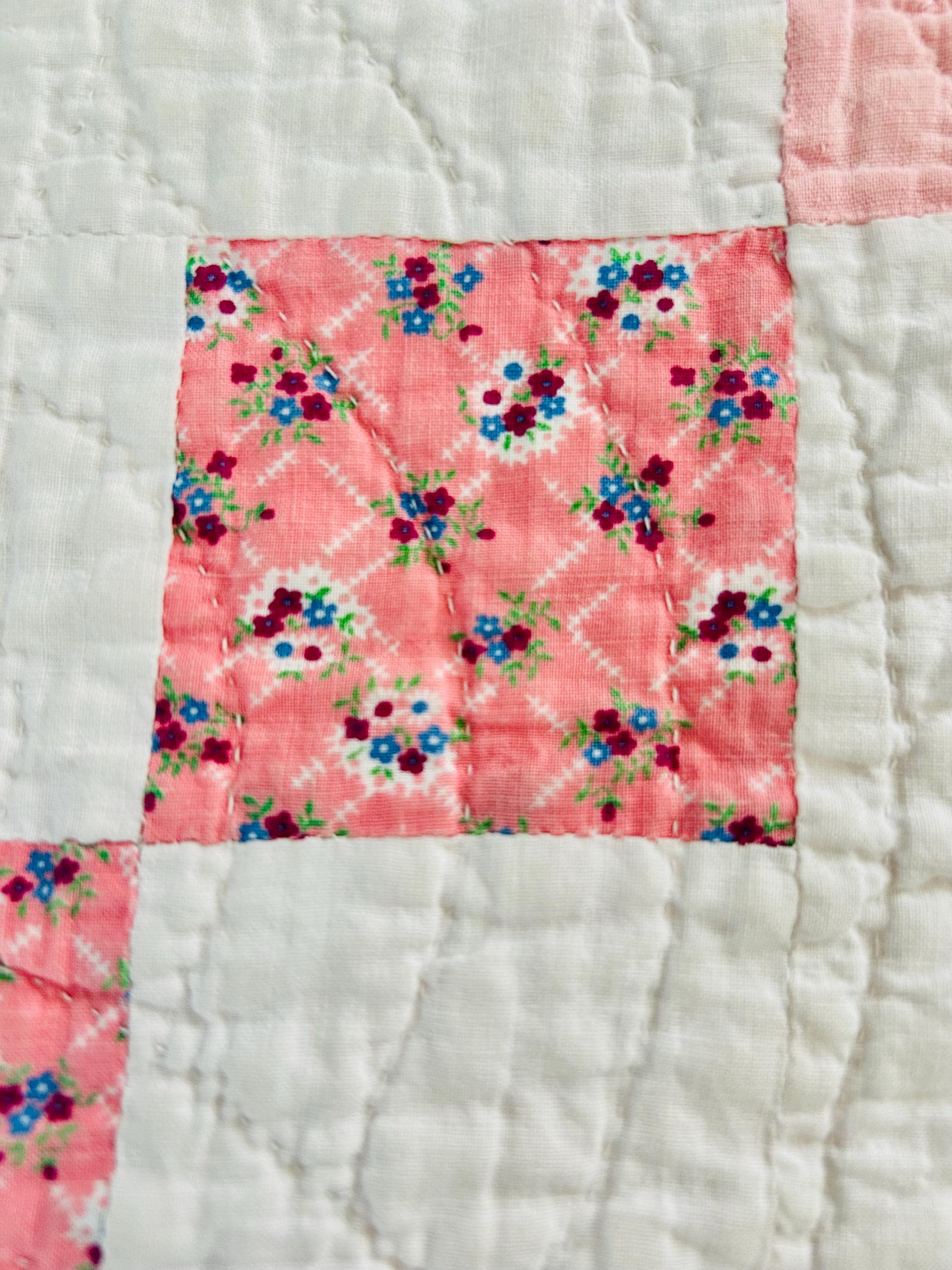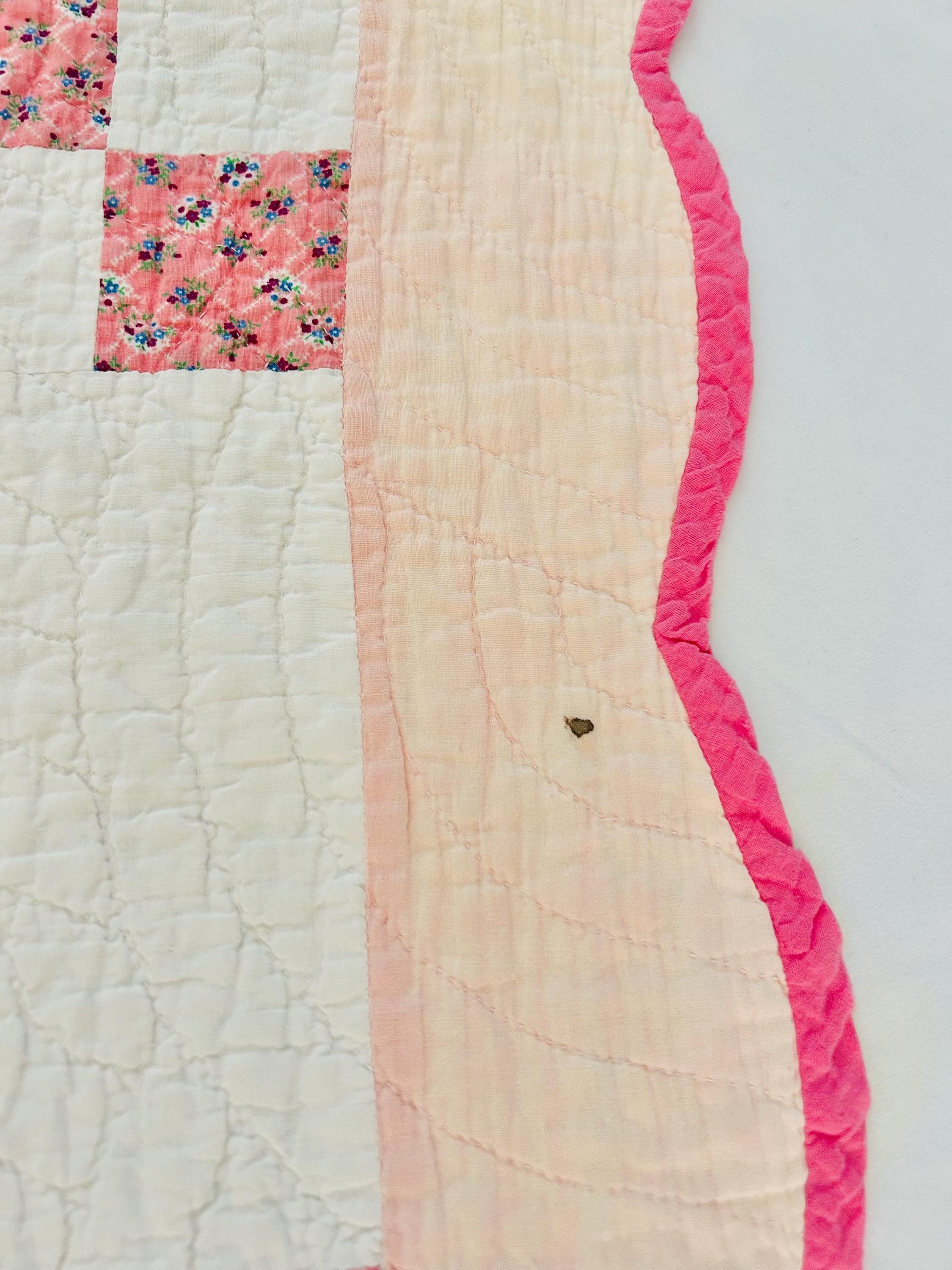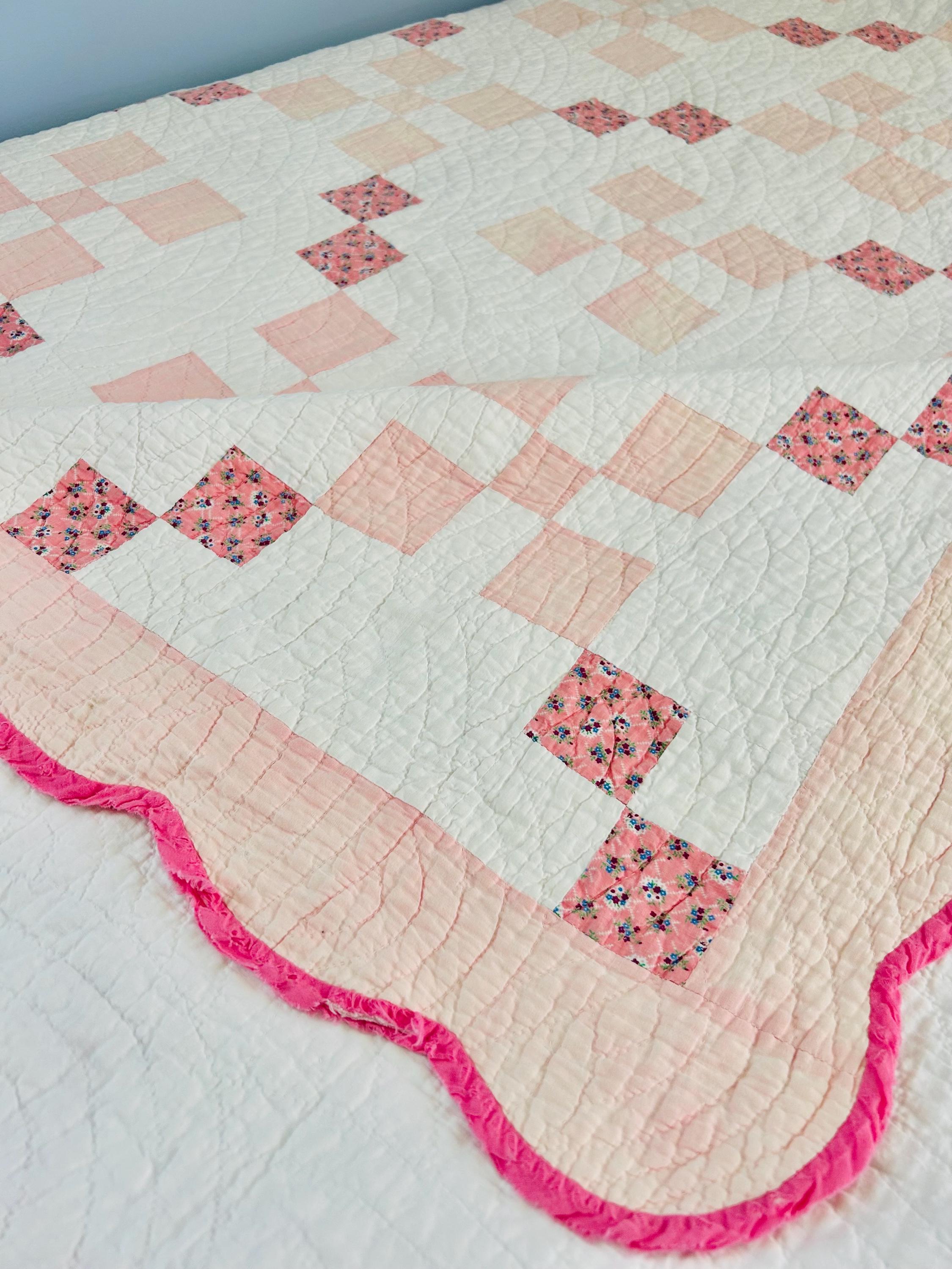 Details: * Pattern: Double Nine Patch * Era: 1930s (Depression era) * Size: 70 1/2” x 83 1/2” * Materials: Cotton fabrics and lightweight cotton batting * Construction: Hand pieced and hand quilted * Quilting: Overall hand quilting in shell arcs * Colors: Soft pinks, coral florals, and white * Edge: Scalloped border with bright pink binding