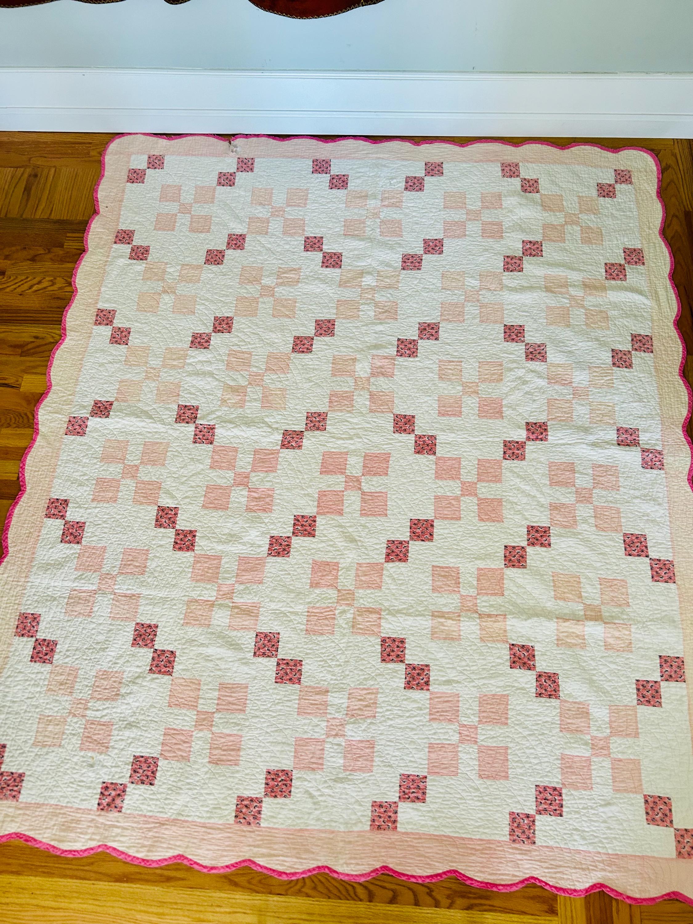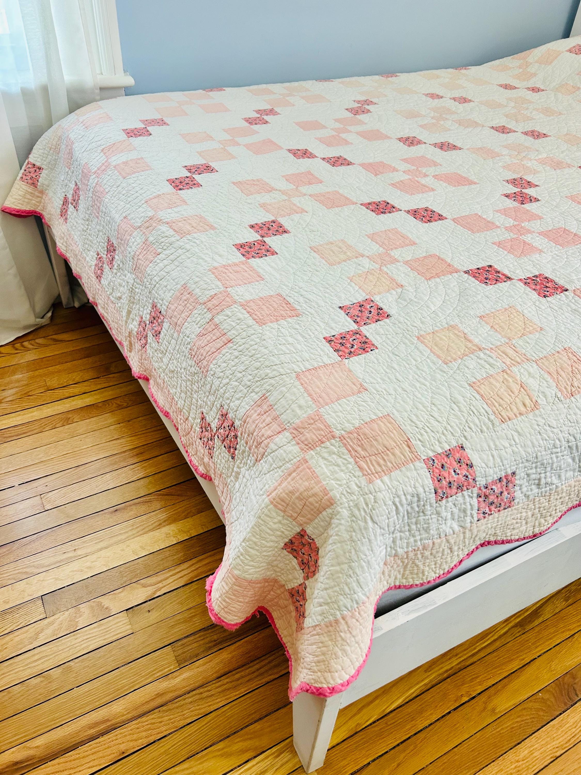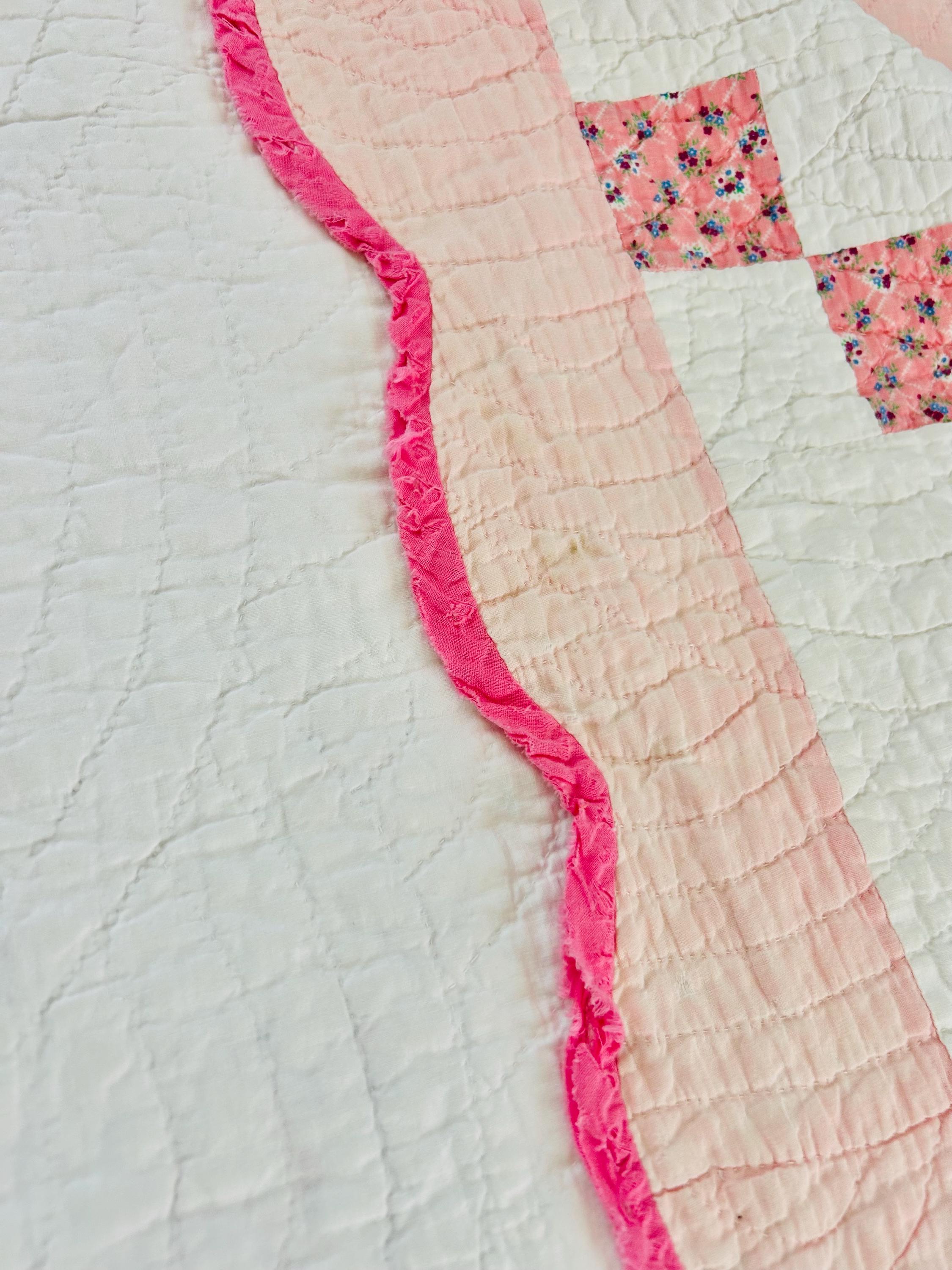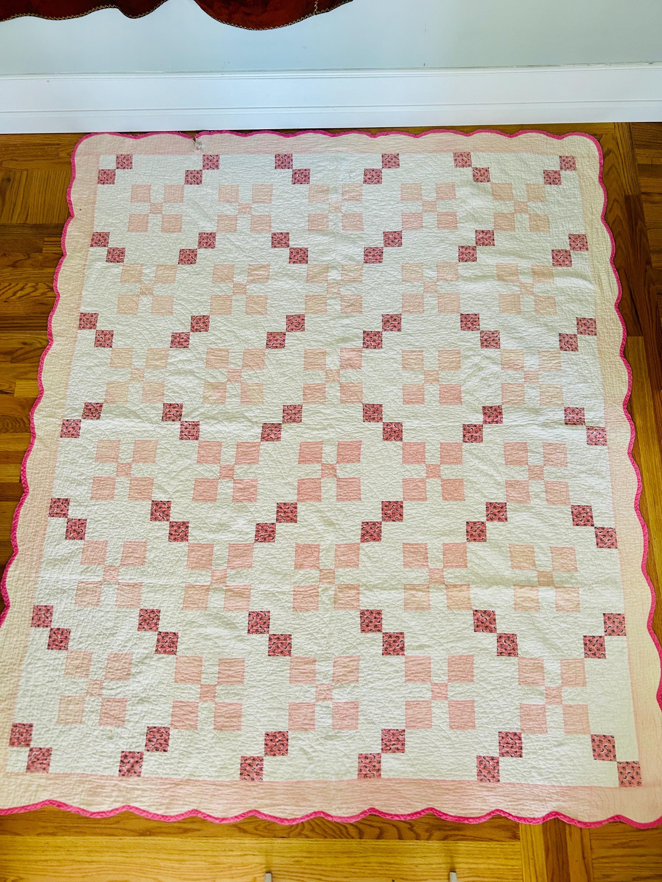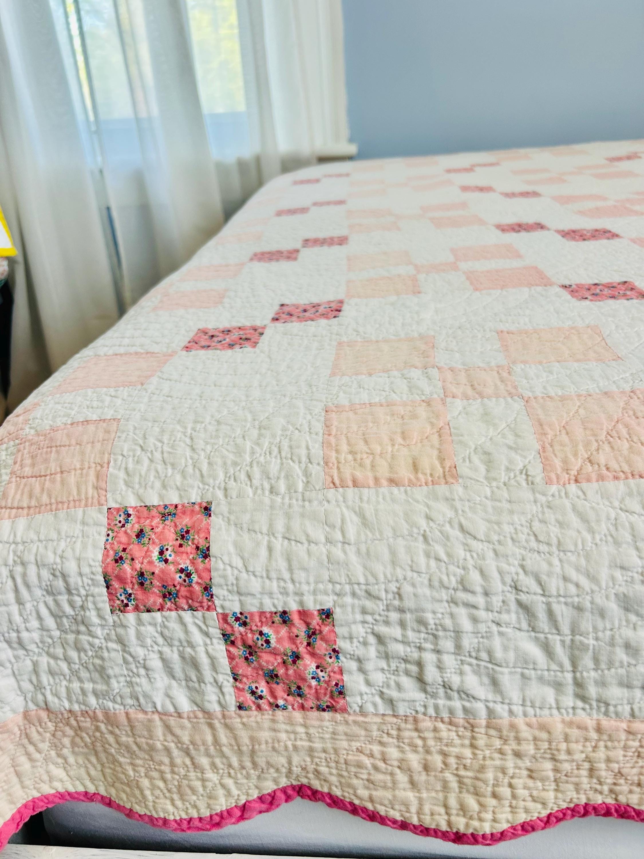 Details: * Pattern: Double Nine Patch * Era: 1930s (Depression era) * Size: 70 1/2” x 83 1/2” * Materials: Cotton fabrics and lightweight cotton batting * Construction: Hand pieced and hand quilted * Quilting: Overall hand quilting in shell arcs * Colors: Soft pinks, coral florals, and white * Edge: Scalloped border with bright pink binding