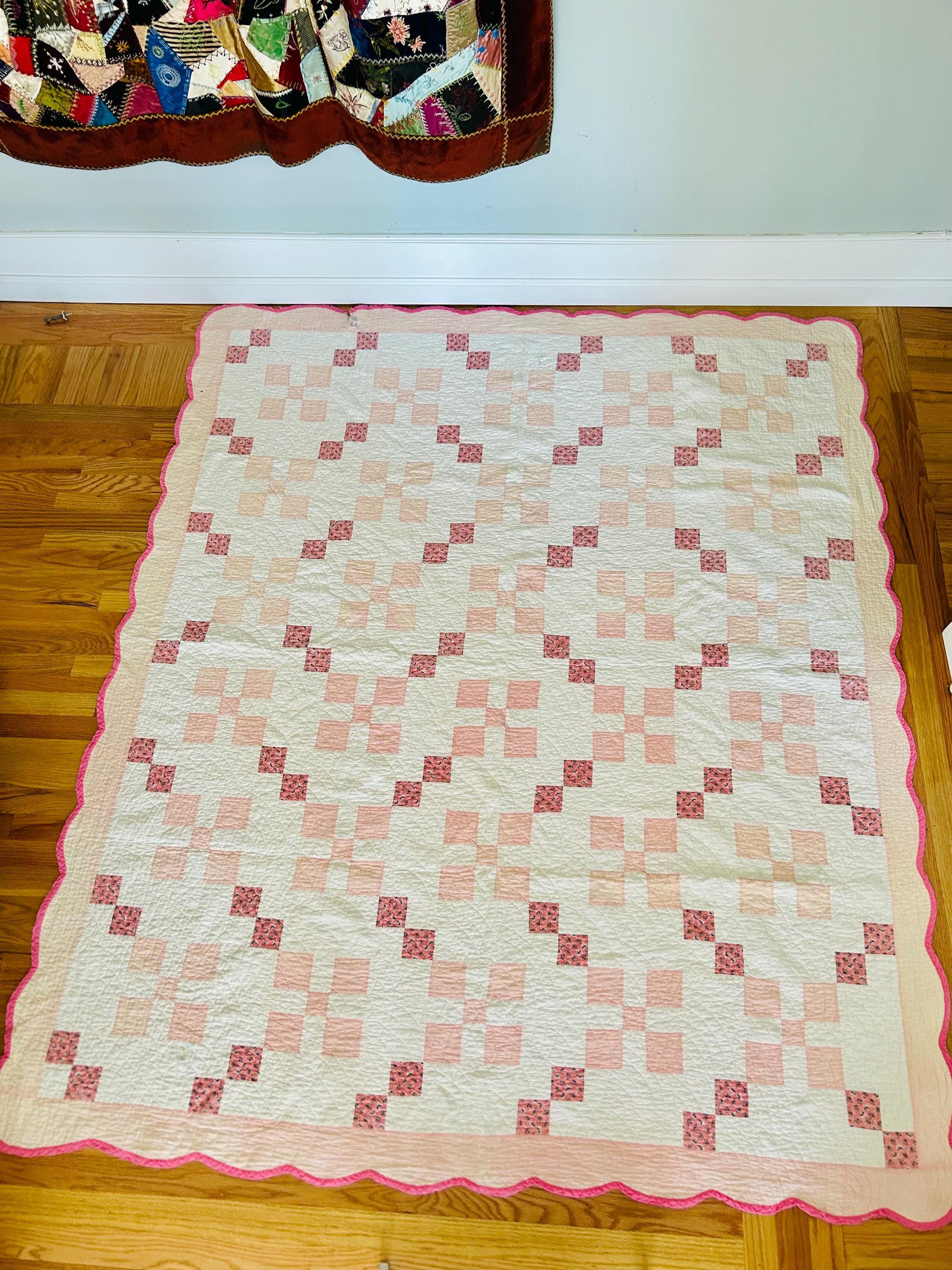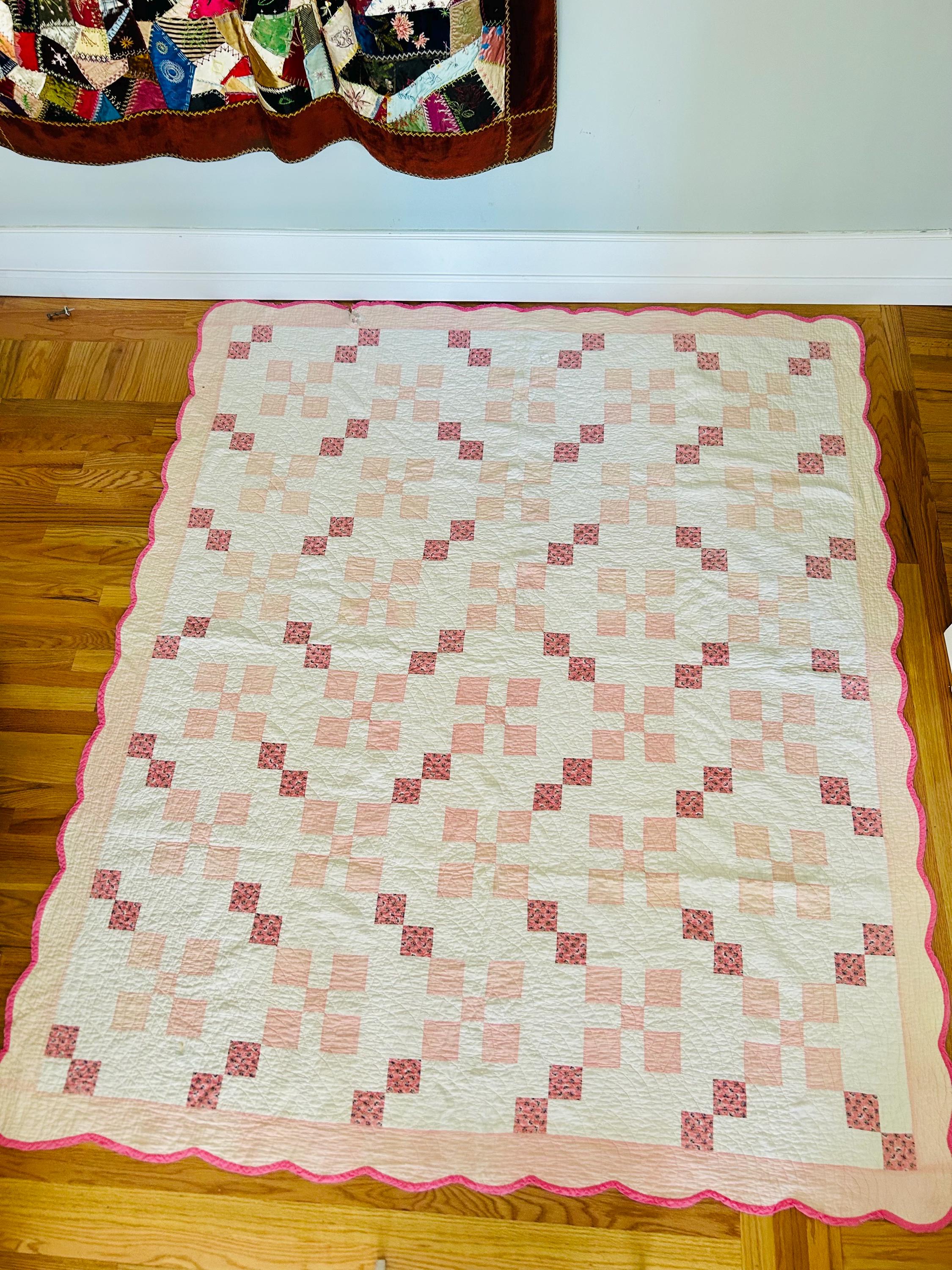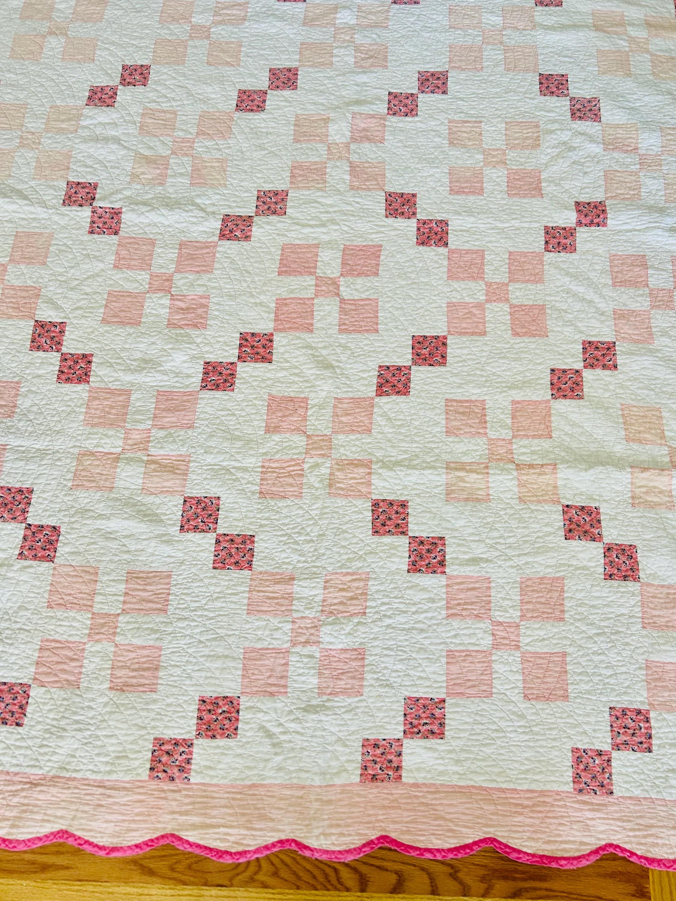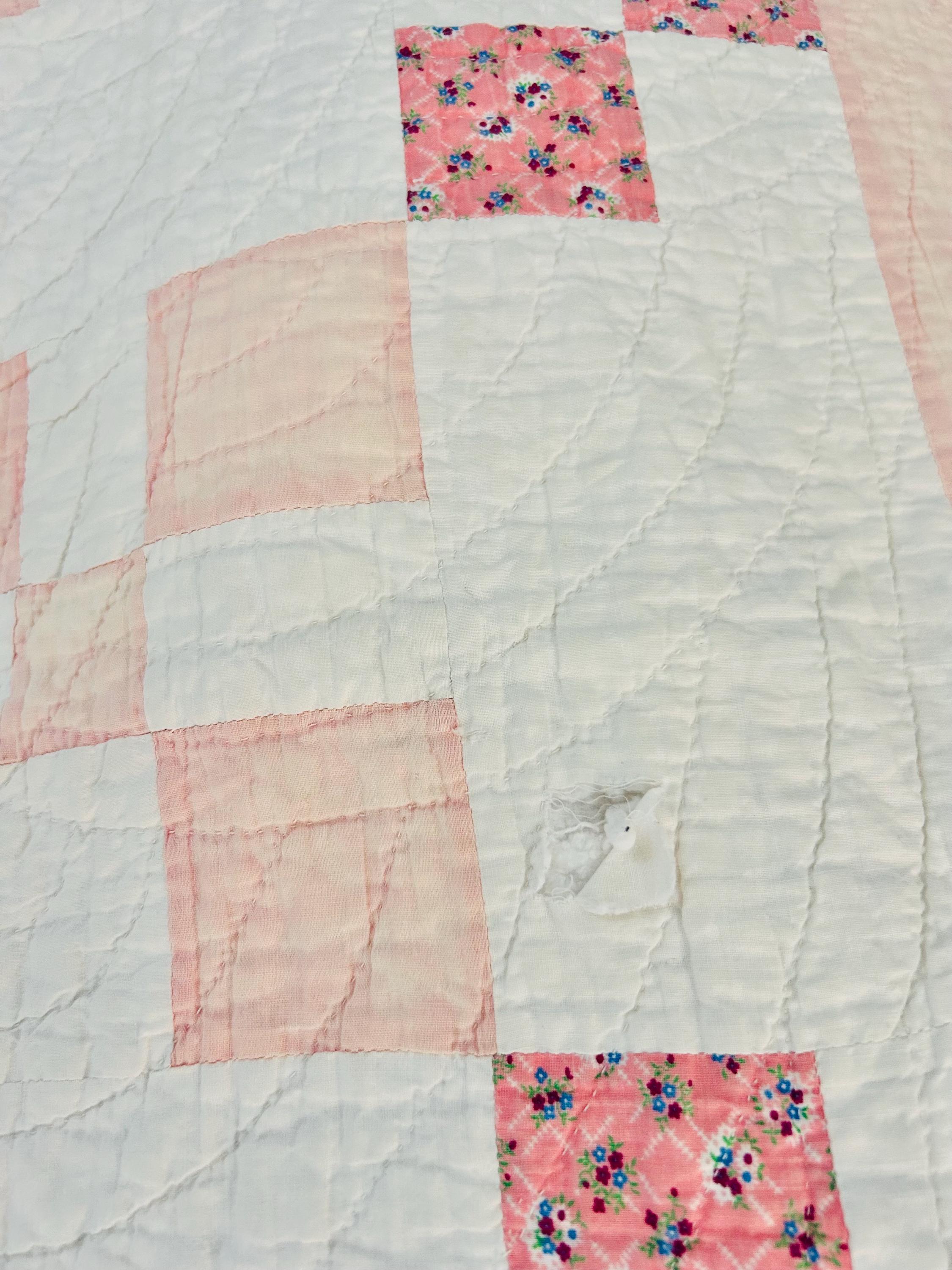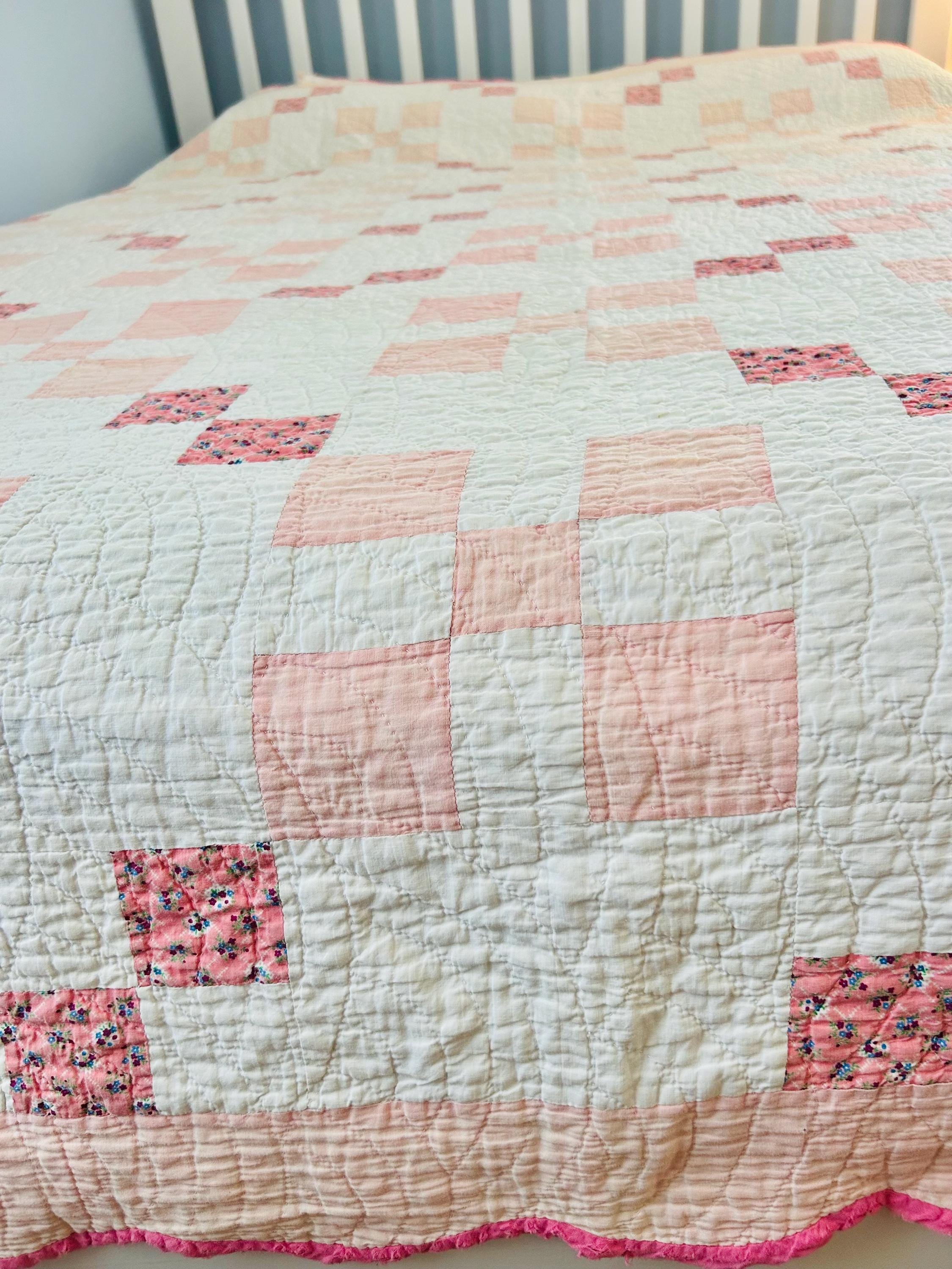Details: * Pattern: Double Nine Patch * Era: 1930s (Depression era) * Size: 70 1/2” x 83 1/2” * Materials: Cotton fabrics and lightweight cotton batting * Construction: Hand pieced and hand quilted * Quilting: Overall hand quilting in shell arcs * Colors: Soft pinks, coral florals, and white * Edge: Scalloped border with bright pink binding