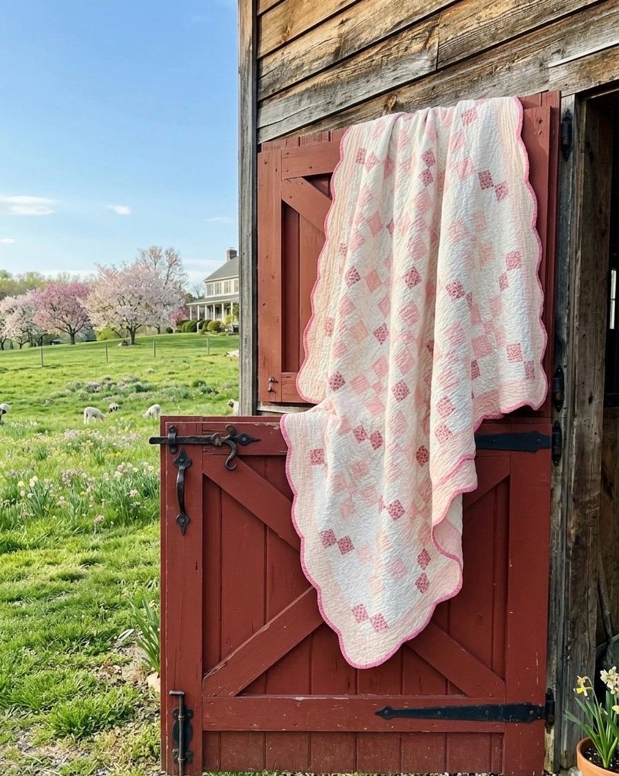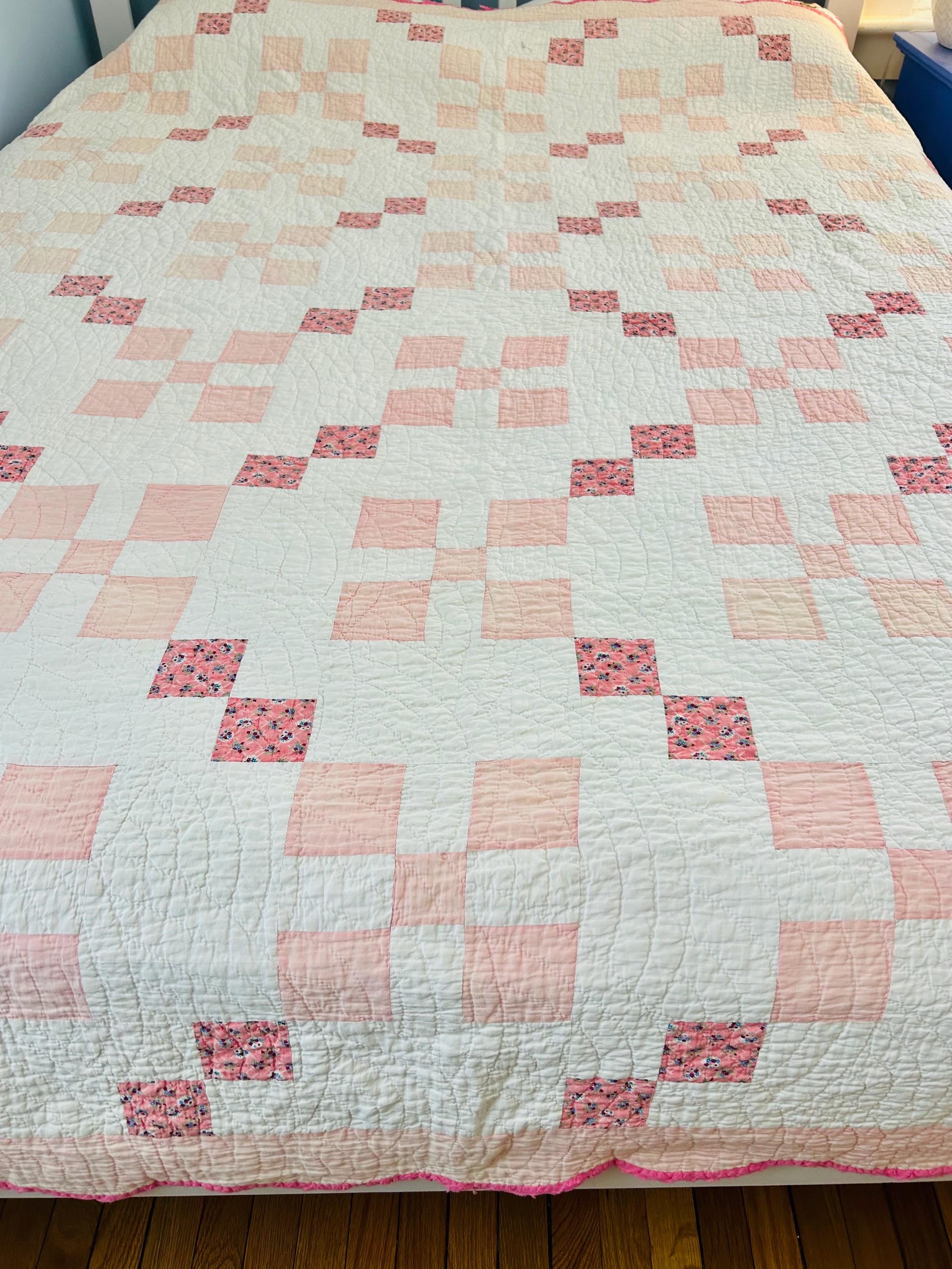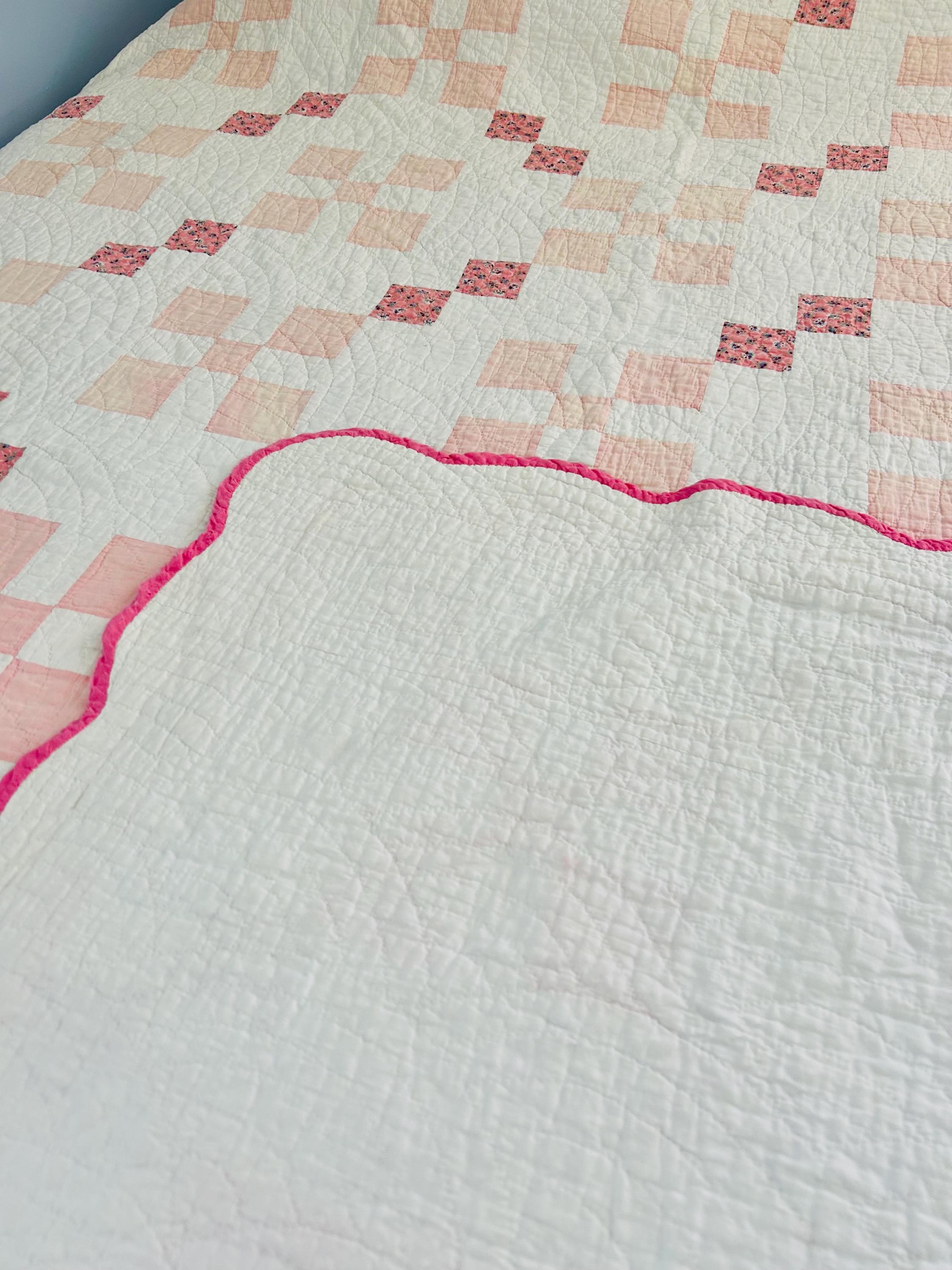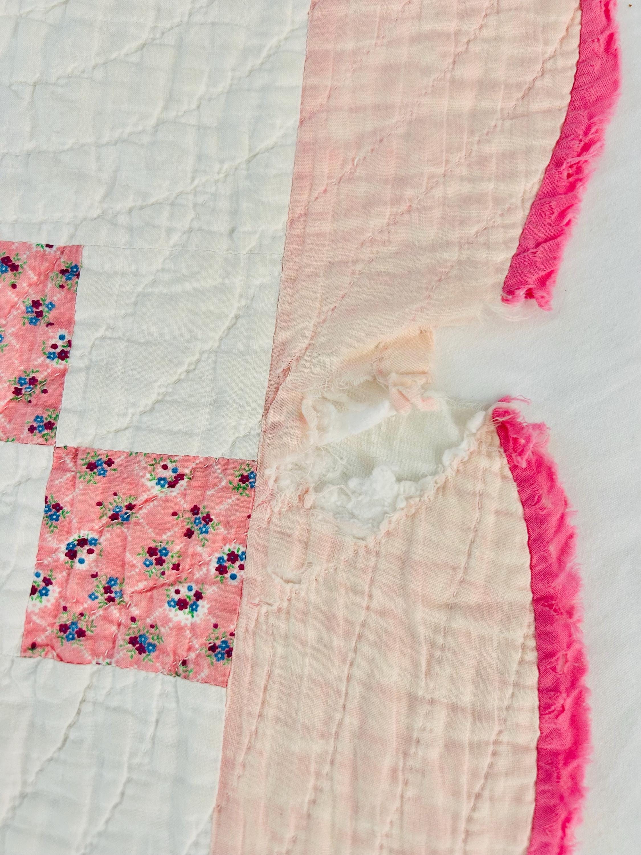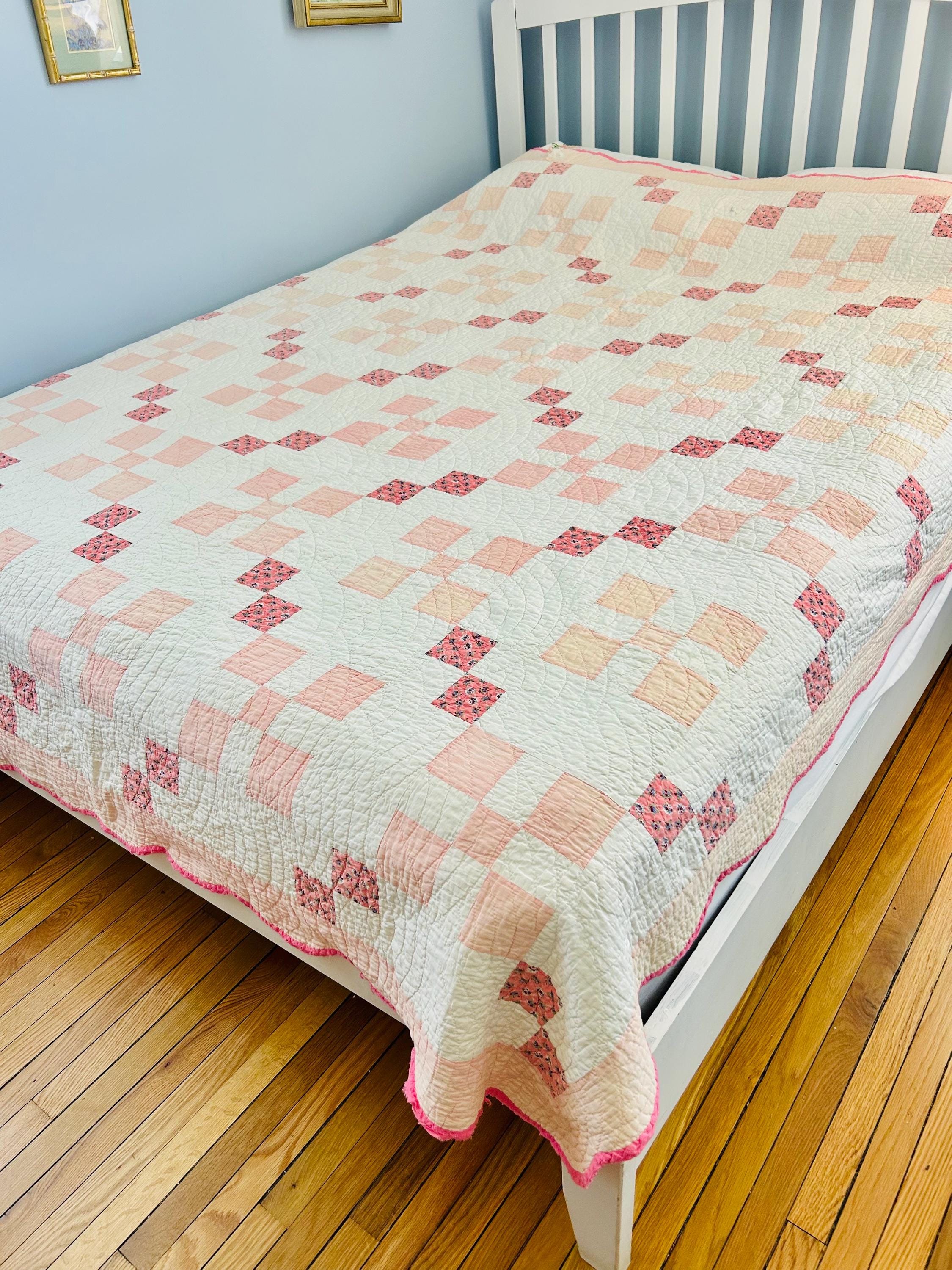 Details: * Pattern: Double Nine Patch * Era: 1930s (Depression era) * Size: 70 1/2” x 83 1/2” * Materials: Cotton fabrics and lightweight cotton batting * Construction: Hand pieced and hand quilted * Quilting: Overall hand quilting in shell arcs * Colors: Soft pinks, coral florals, and white * Edge: Scalloped border with bright pink binding
