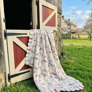Full of classic 1930s charm, this Vintage Double Nine Patch Quilt with Scalloped Edge features a beautiful palette of blush pinks and cheerful floral prints set against a crisp white ground. The hand-quilting is in repeating shell patterns.