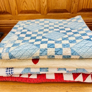CONDITION: More than 95% of the quilt is sturdy and intact and in very good condition. It displays beautifully, but there is an approximately 5-inch tear on one border (see photos), a pulled seam on a white square, and a fraying binding. See photos.