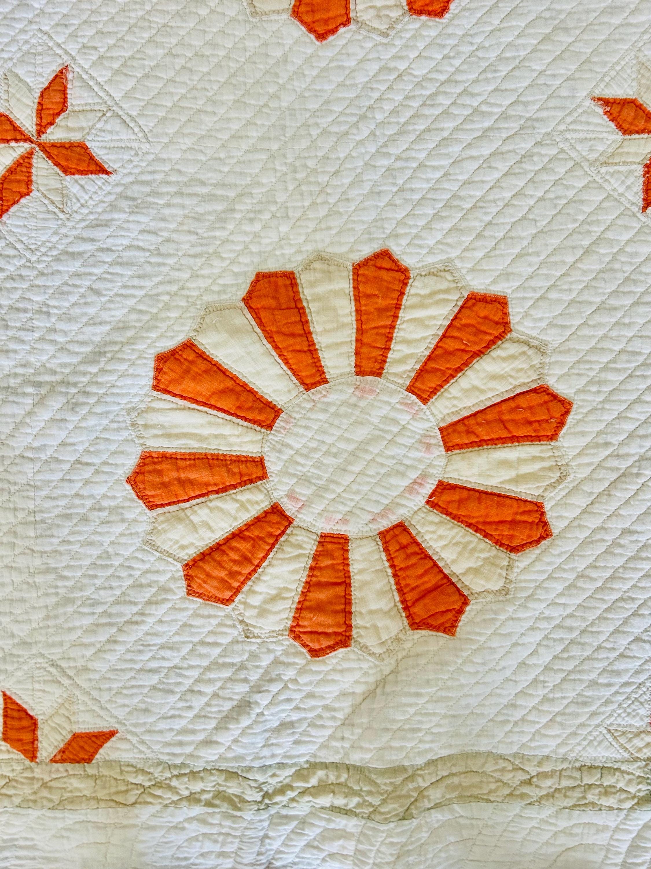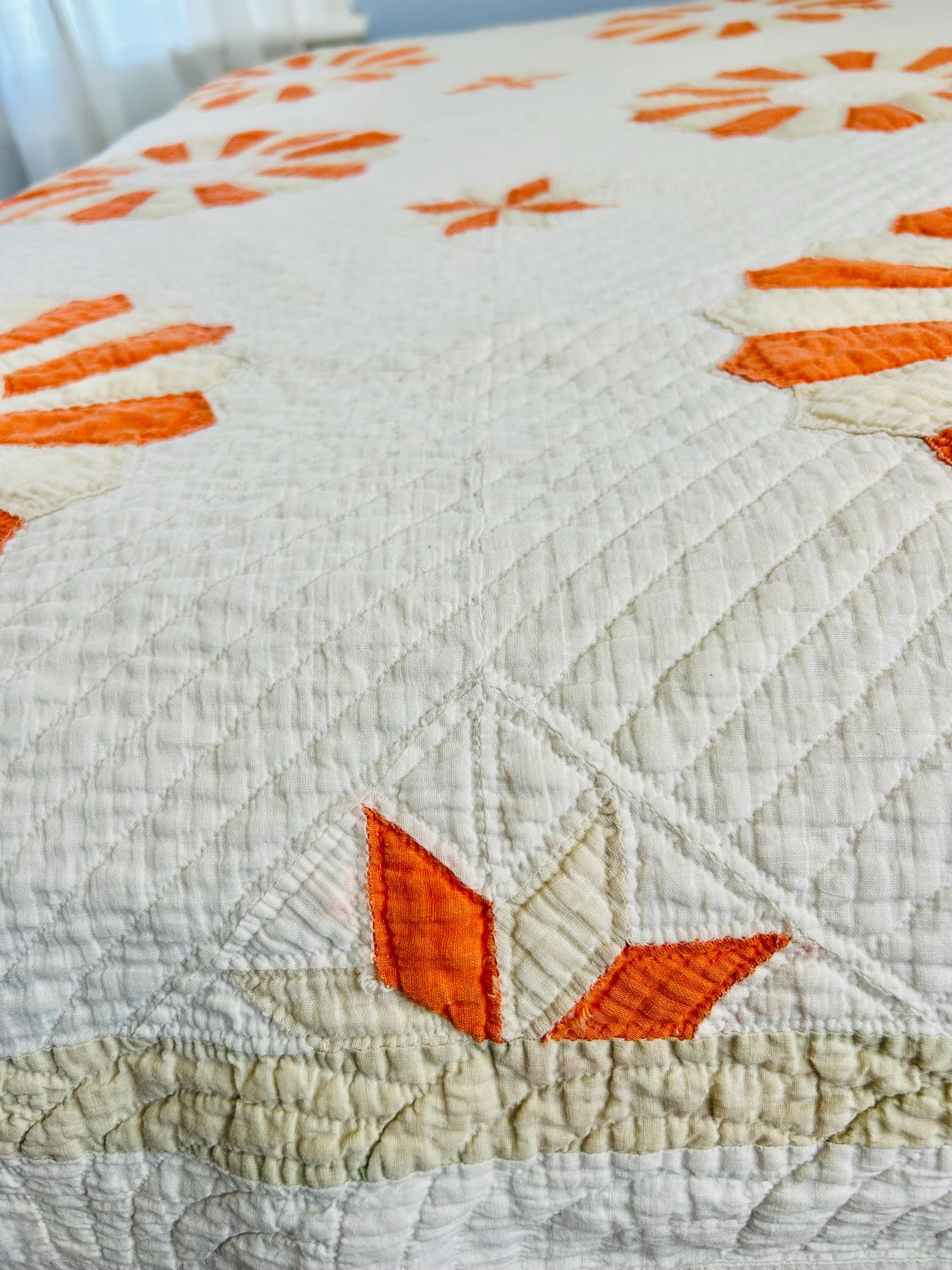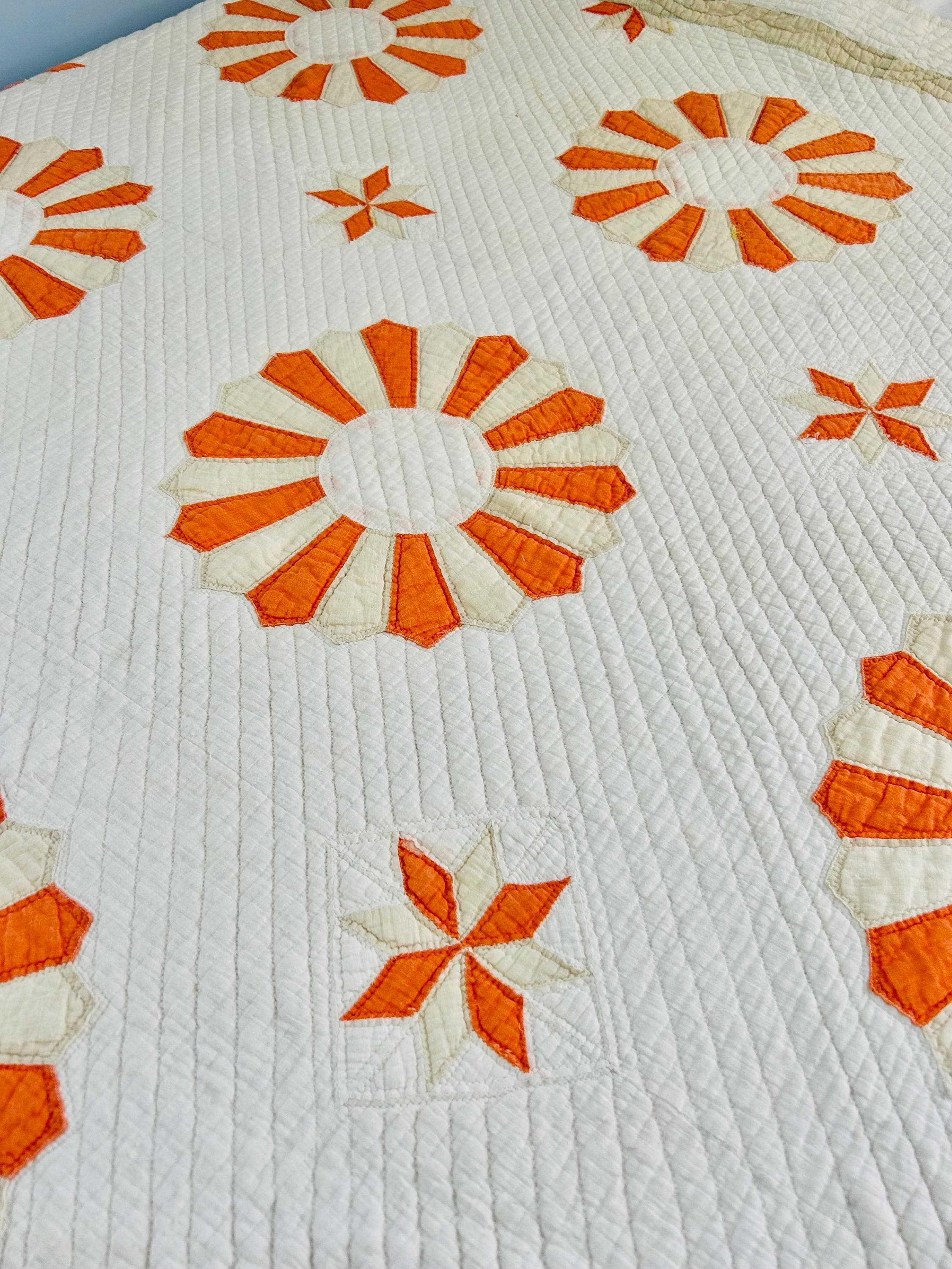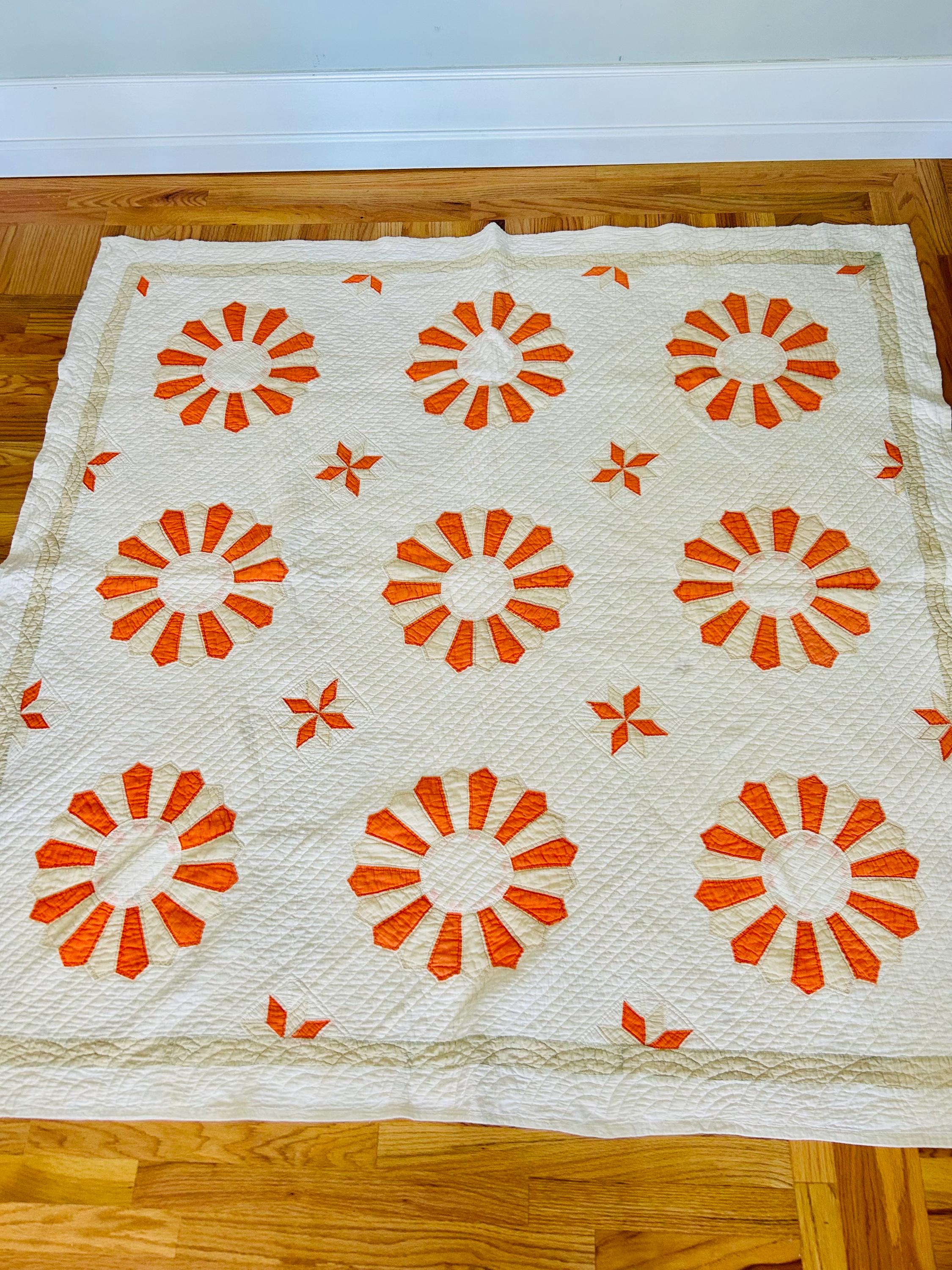 Details: * Pattern: Aster / Daisy floral appliqué * Date: 1920s–1930s * Size: 69” x 70” * Materials: Cotton fabrics and lightweight cotton batting * Construction: Hand appliquéd and densely hand quilted * Quilting: Very fine, closely spaced quilting lines throughout, including diagonal field quilting and decorative border work * Colors: Cream/ivory ground with vibrant orange and soft cream appliqué * Striking, graphic floral design that reads almost modern * Gorgeous dense quilting that gives it texture and depth * A highly decorative antique that works equally well draped, folded, or displayed * A wonderful example of 1920s–30s appliqué work
