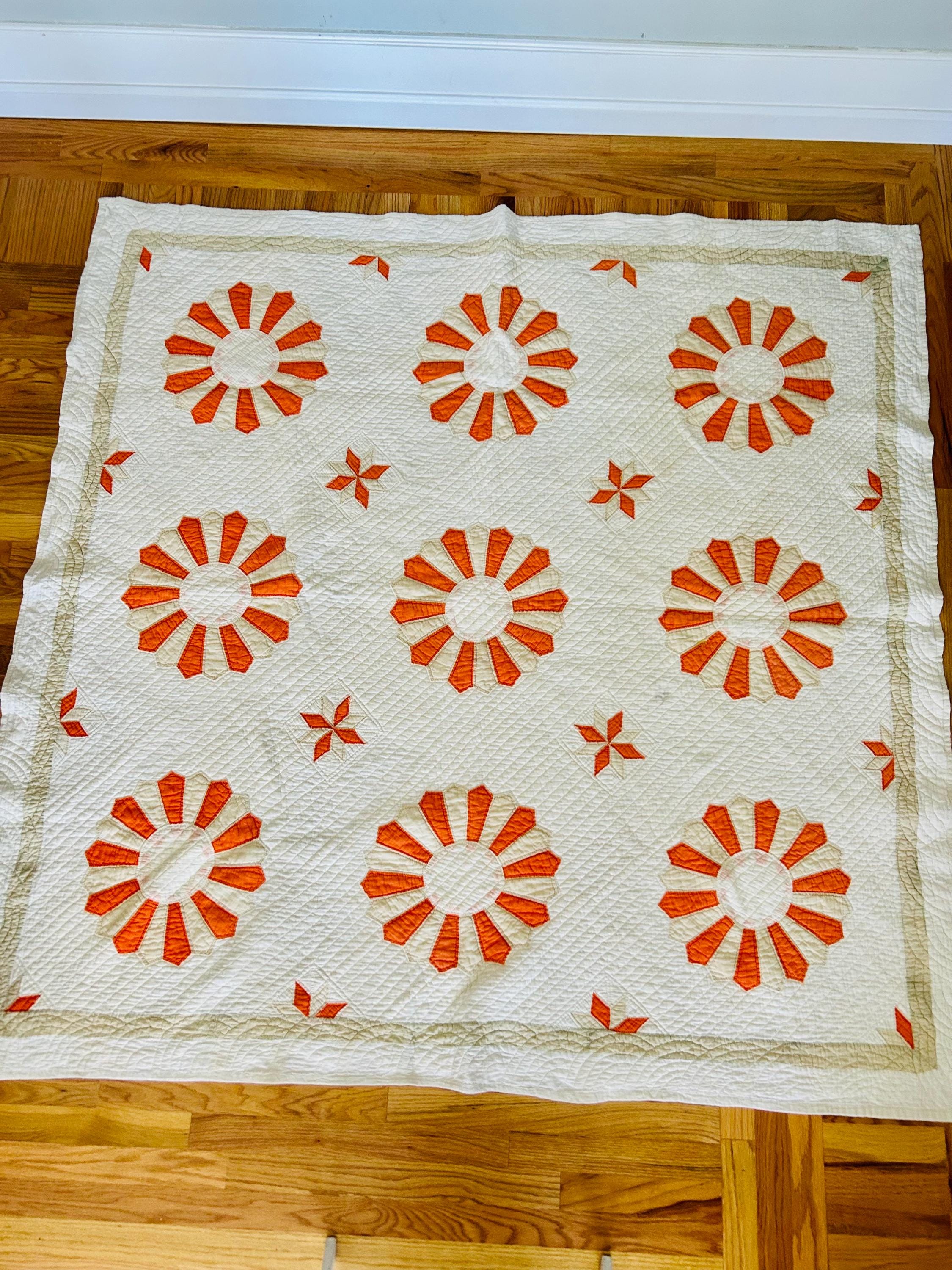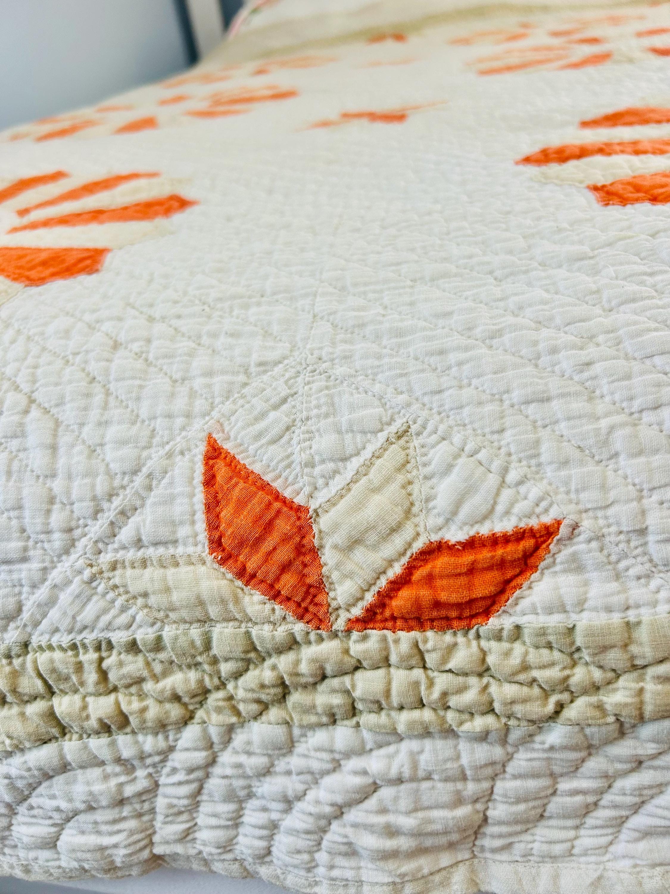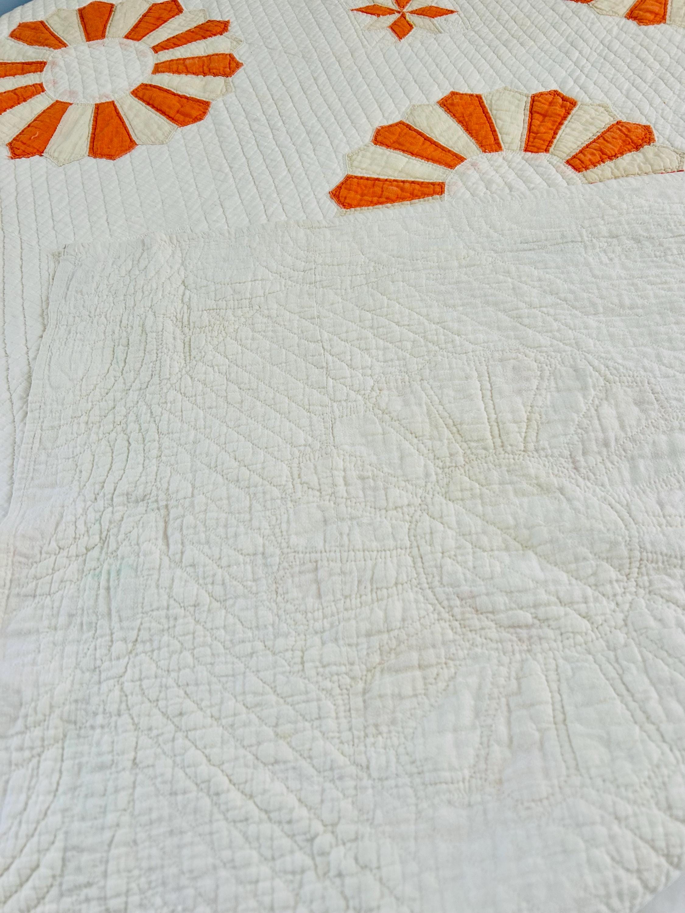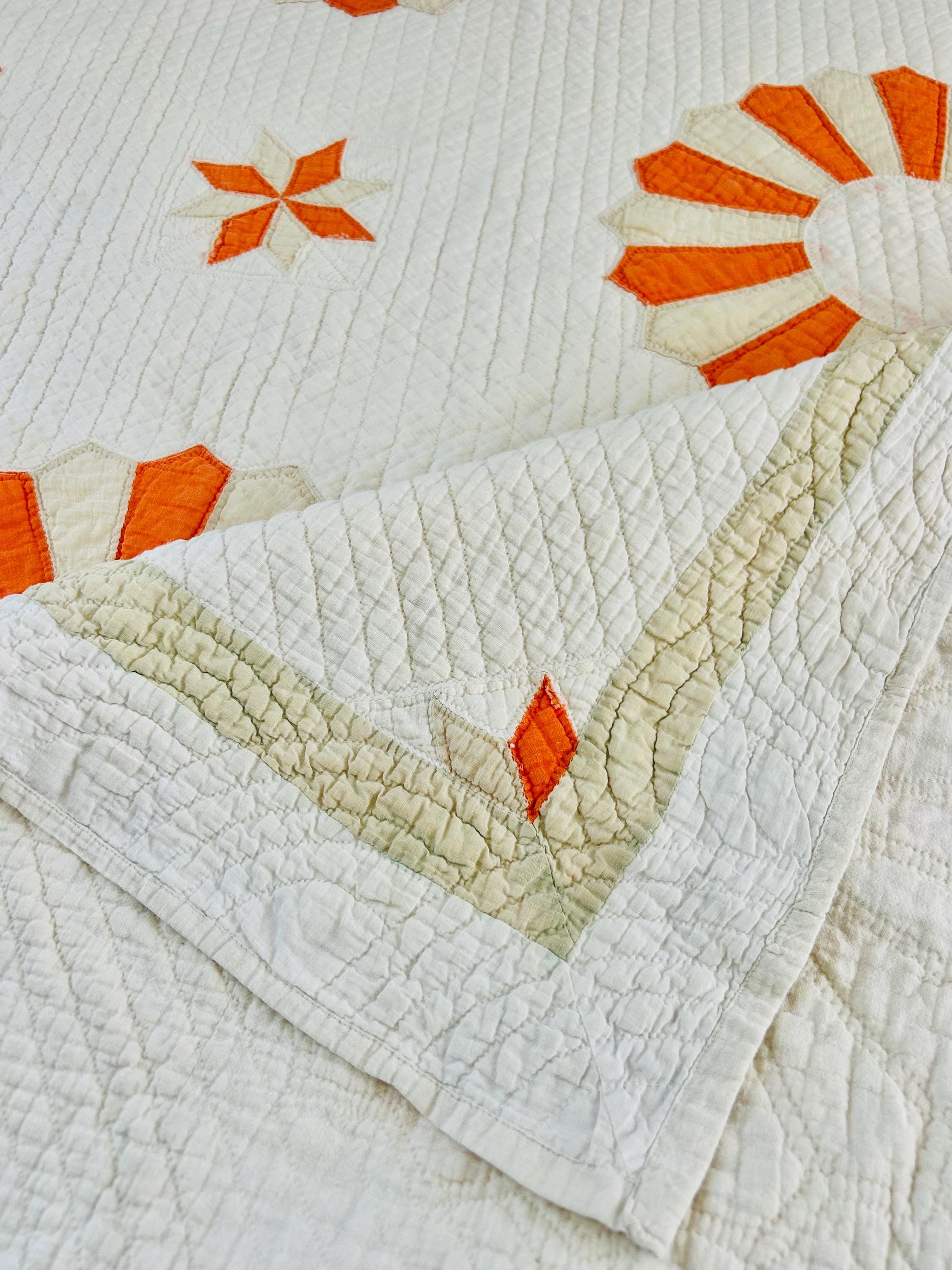 Details: * Pattern: Aster / Daisy floral appliqué * Date: 1920s–1930s * Size: 69” x 70” * Materials: Cotton fabrics and lightweight cotton batting * Construction: Hand appliquéd and densely hand quilted * Quilting: Very fine, closely spaced quilting lines throughout, including diagonal field quilting and decorative border work * Colors: Cream/ivory ground with vibrant orange and soft cream appliqué * Striking, graphic floral design that reads almost modern * Gorgeous dense quilting that gives it texture and depth * A highly decorative antique that works equally well draped, folded, or displayed * A wonderful example of 1920s–30s appliqué work