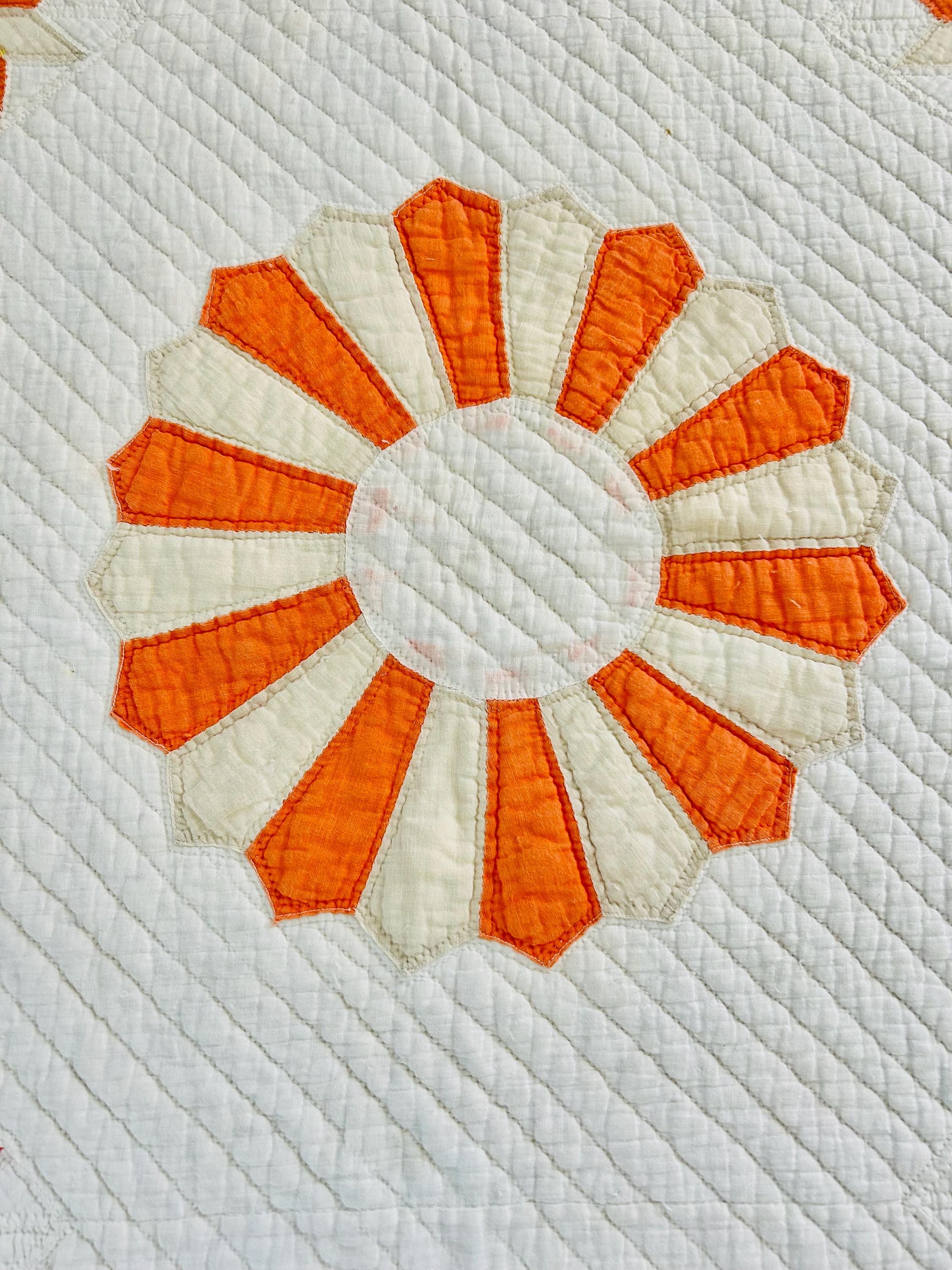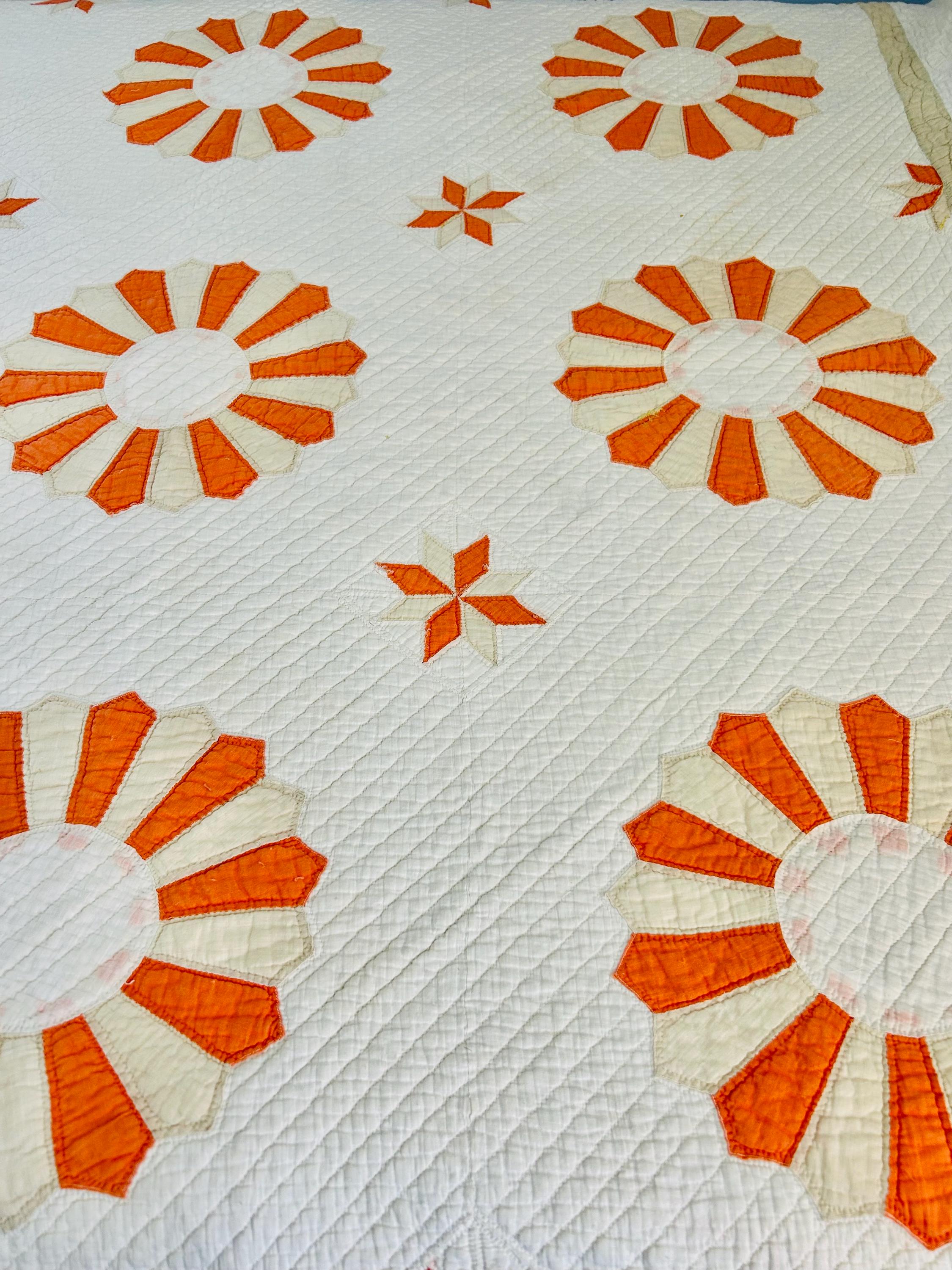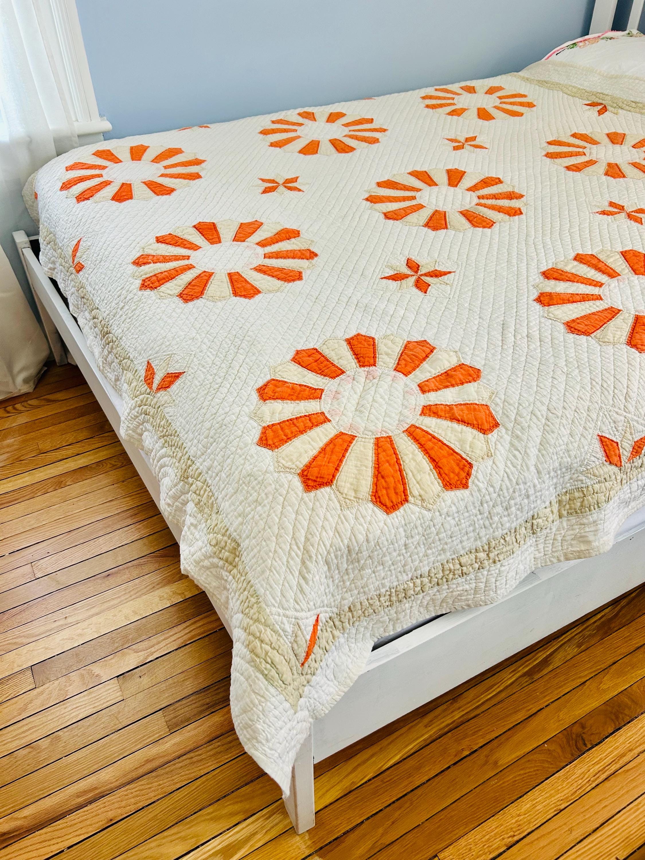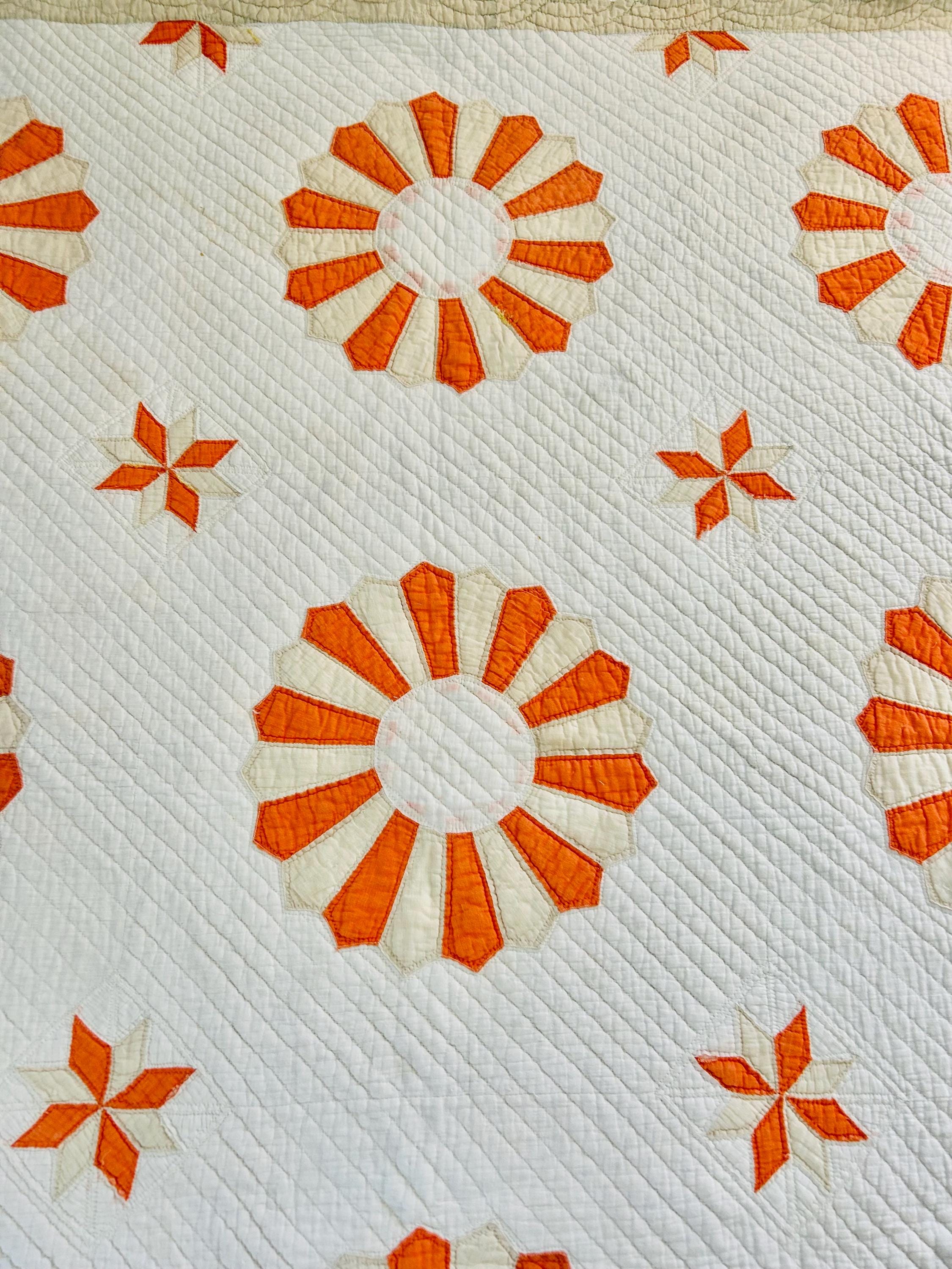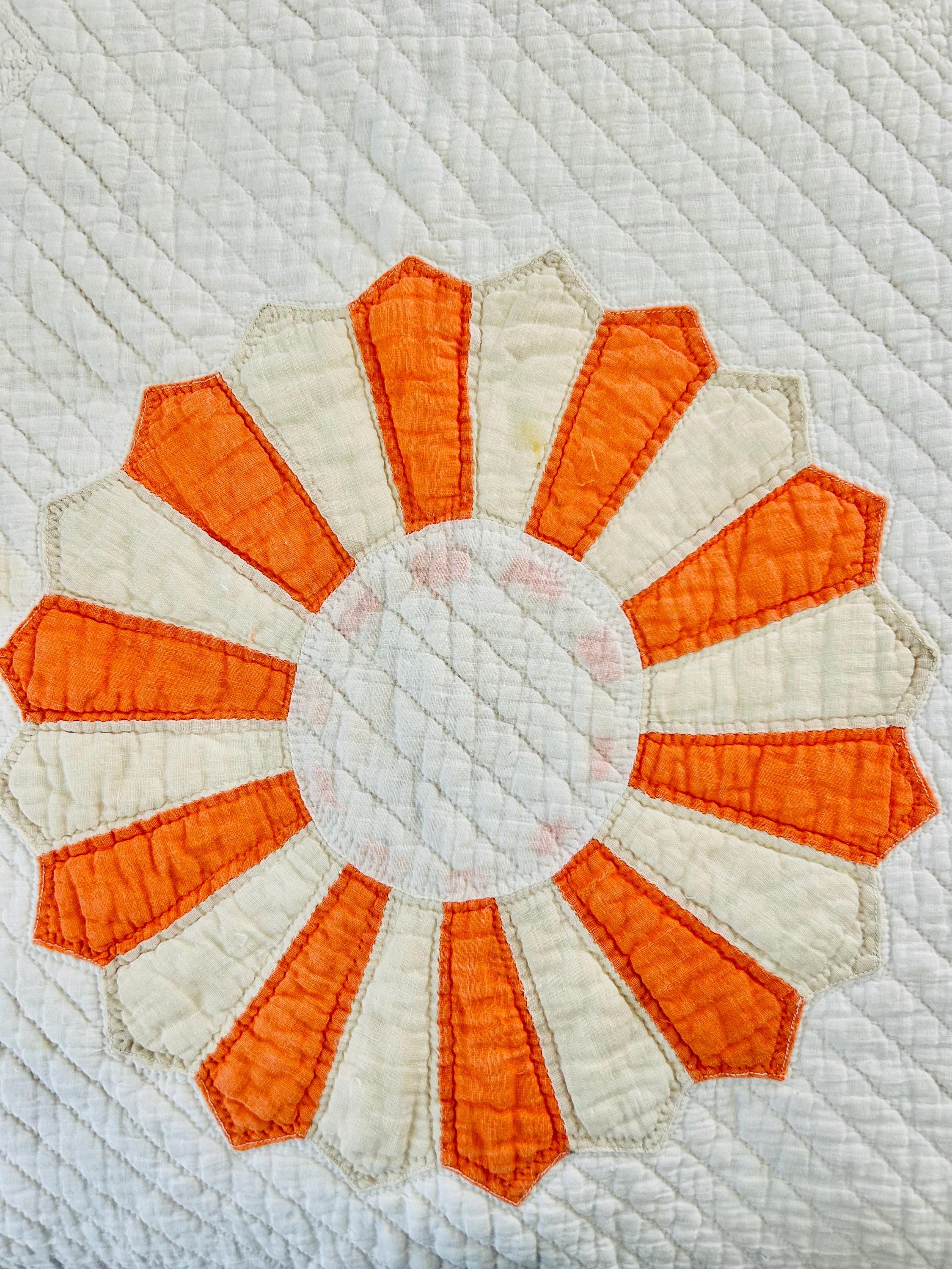 Details: * Pattern: Aster / Daisy floral appliqué * Date: 1920s–1930s * Size: 69” x 70” * Materials: Cotton fabrics and lightweight cotton batting * Construction: Hand appliquéd and densely hand quilted * Quilting: Very fine, closely spaced quilting lines throughout, including diagonal field quilting and decorative border work * Colors: Cream/ivory ground with vibrant orange and soft cream appliqué * Striking, graphic floral design that reads almost modern * Gorgeous dense quilting that gives it texture and depth * A highly decorative antique that works equally well draped, folded, or displayed * A wonderful example of 1920s–30s appliqué work