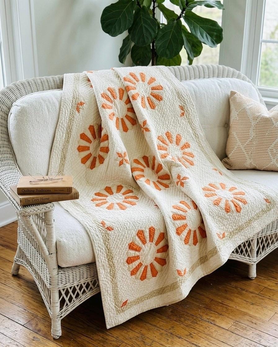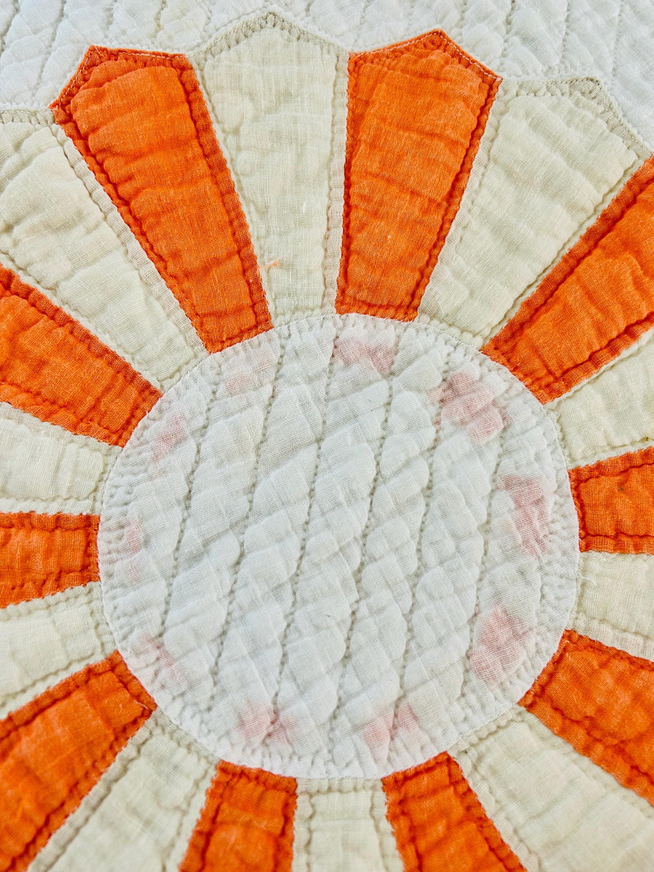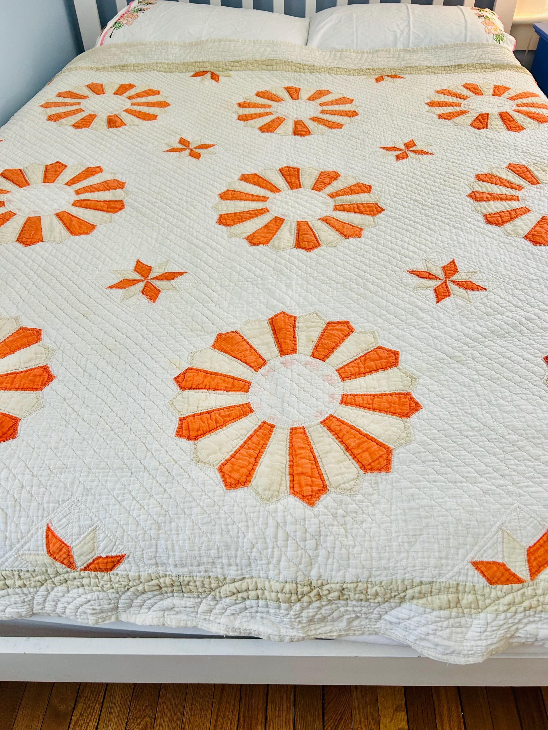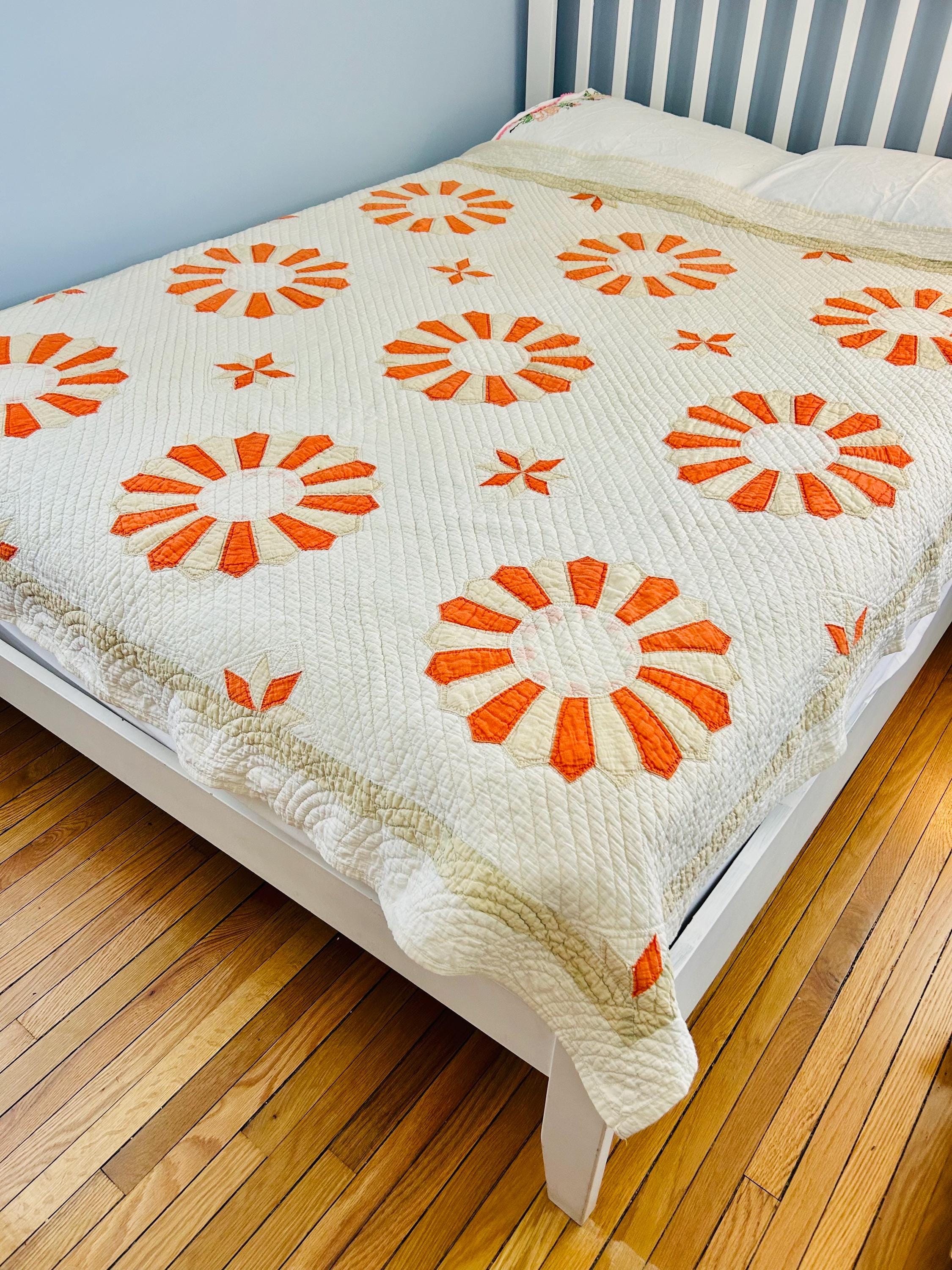 Details: * Pattern: Aster / Daisy floral appliqué * Date: 1920s–1930s * Size: 69” x 70” * Materials: Cotton fabrics and lightweight cotton batting * Construction: Hand appliquéd and densely hand quilted * Quilting: Very fine, closely spaced quilting lines throughout, including diagonal field quilting and decorative border work * Colors: Cream/ivory ground with vibrant orange and soft cream appliqué * Striking, graphic floral design that reads almost modern * Gorgeous dense quilting that gives it texture and depth * A highly decorative antique that works equally well draped, folded, or displayed * A wonderful example of 1920s–30s appliqué work