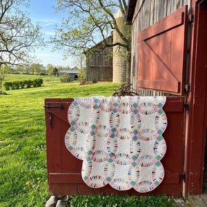 The quilt is from a smoke-free, pet-free home and is pictured on a queen-size bed.