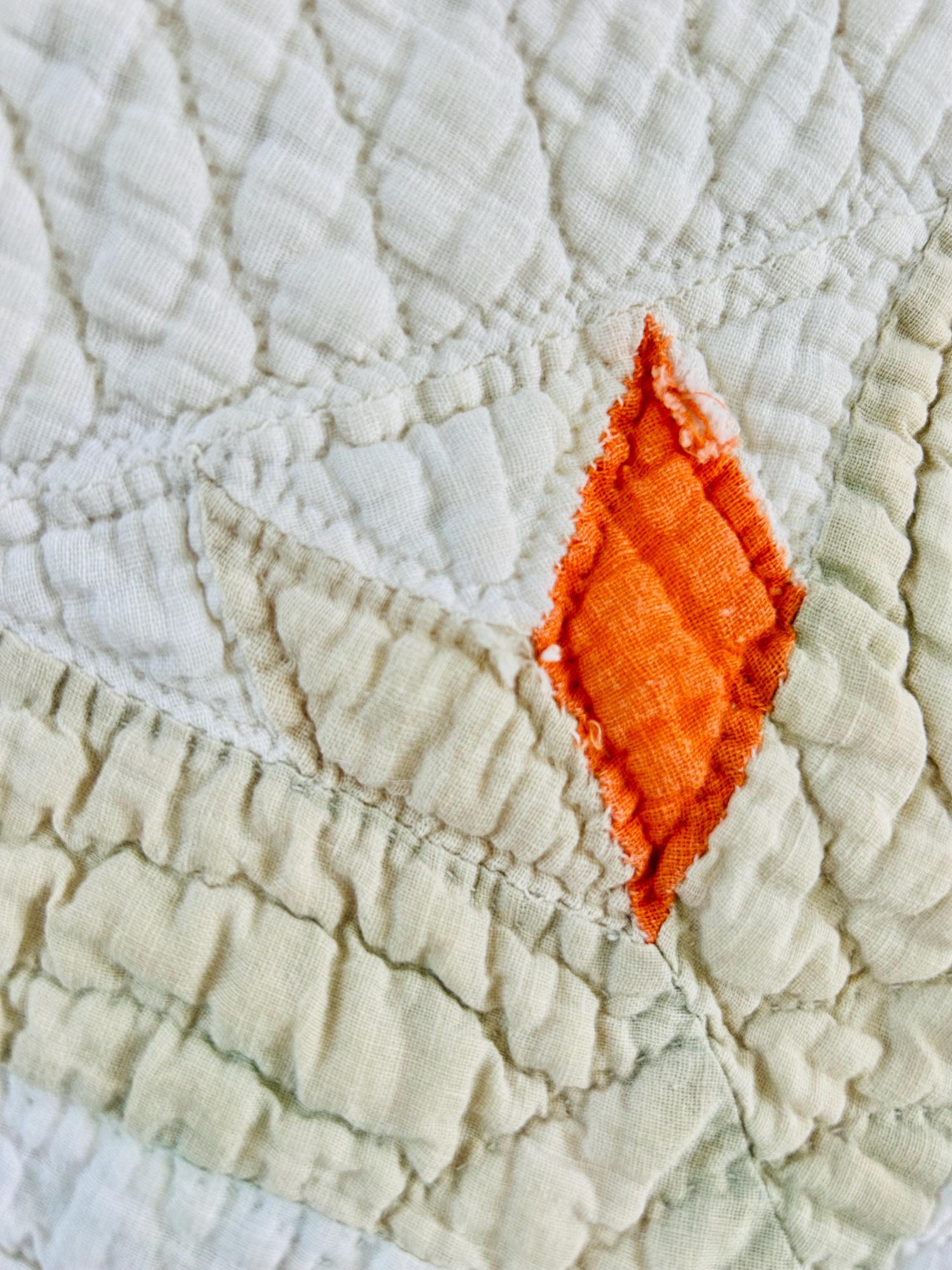 Bright, graphic, and charming charm, this antique Aster Quilt features bold orange floral bursts with star accents scattered across a soft cream ground—an eye-catching design that feels both fresh and distinctly early 20th century. This is a classic 1920s–1930s appliqué quilt, with stylized aster or daisy-like blooms arranged in a pleasing, balanced layout. The hand-quilting is dense and expertly done with tight, even stitches covering the entire surface with diagonal grids, as well as a repeating shell pattern along the four-sided border.